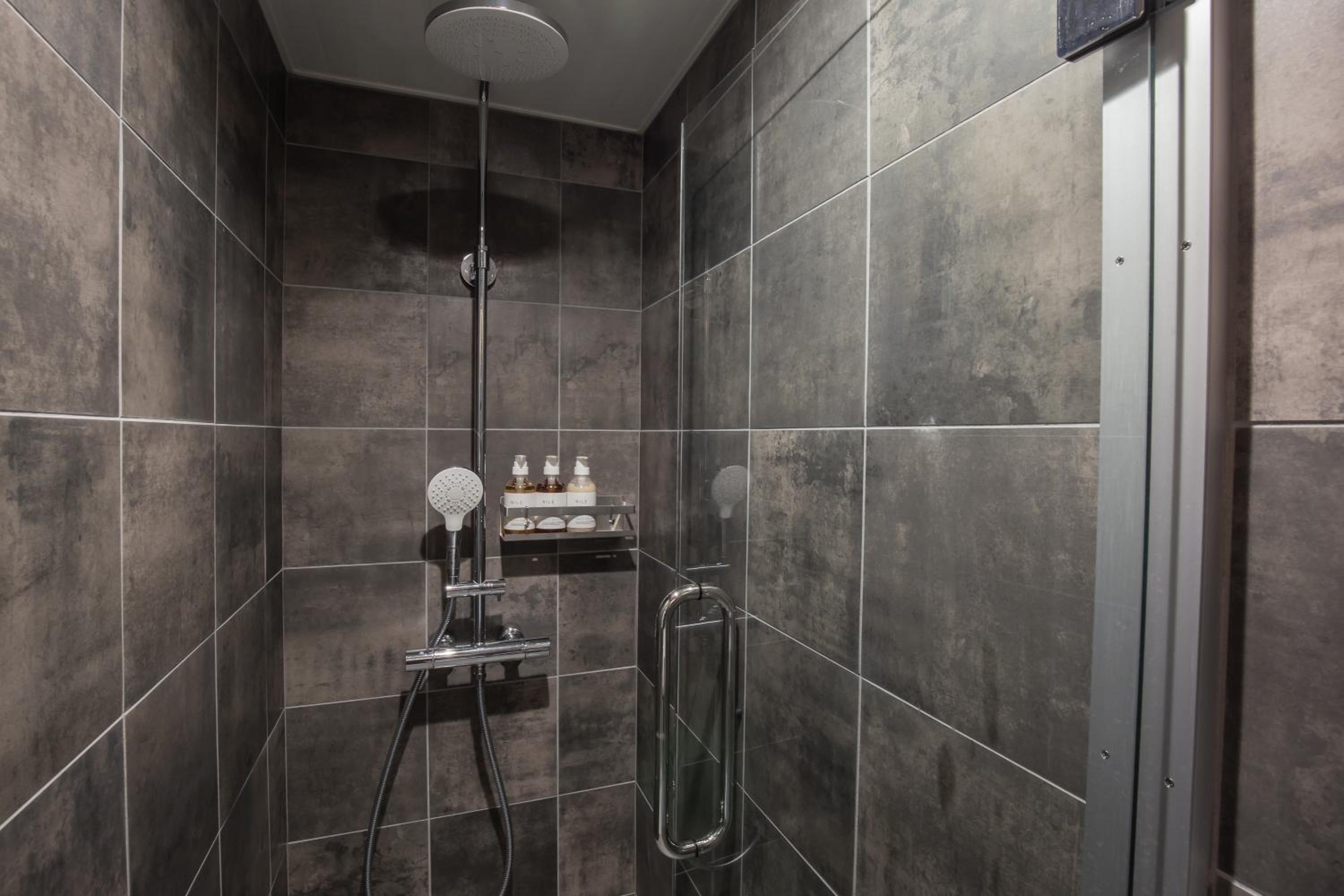 The elevator was quite small and it closes on us too quickly. When using the shower, some of the water would leak out due to the shower door not being quite sealed.