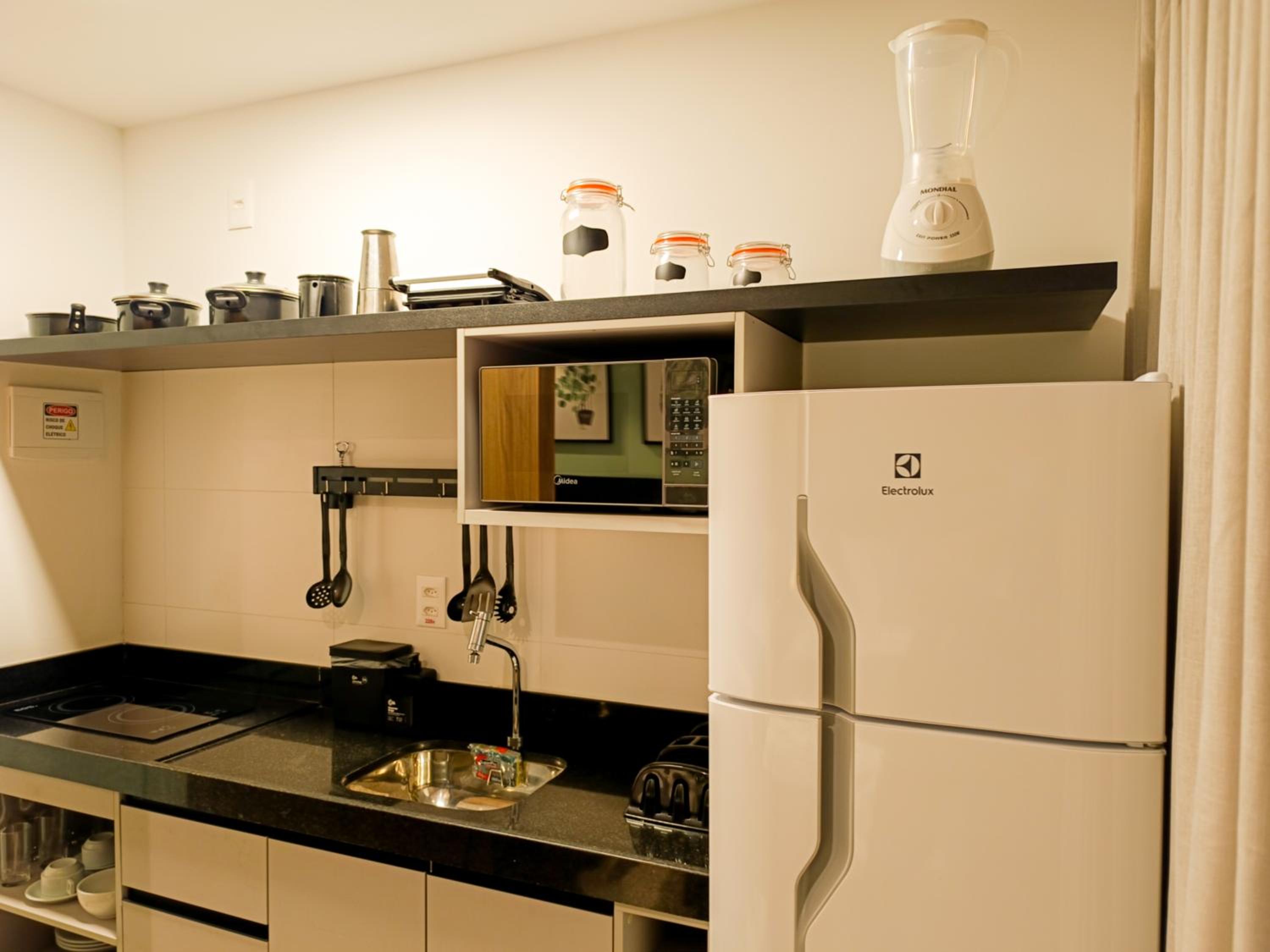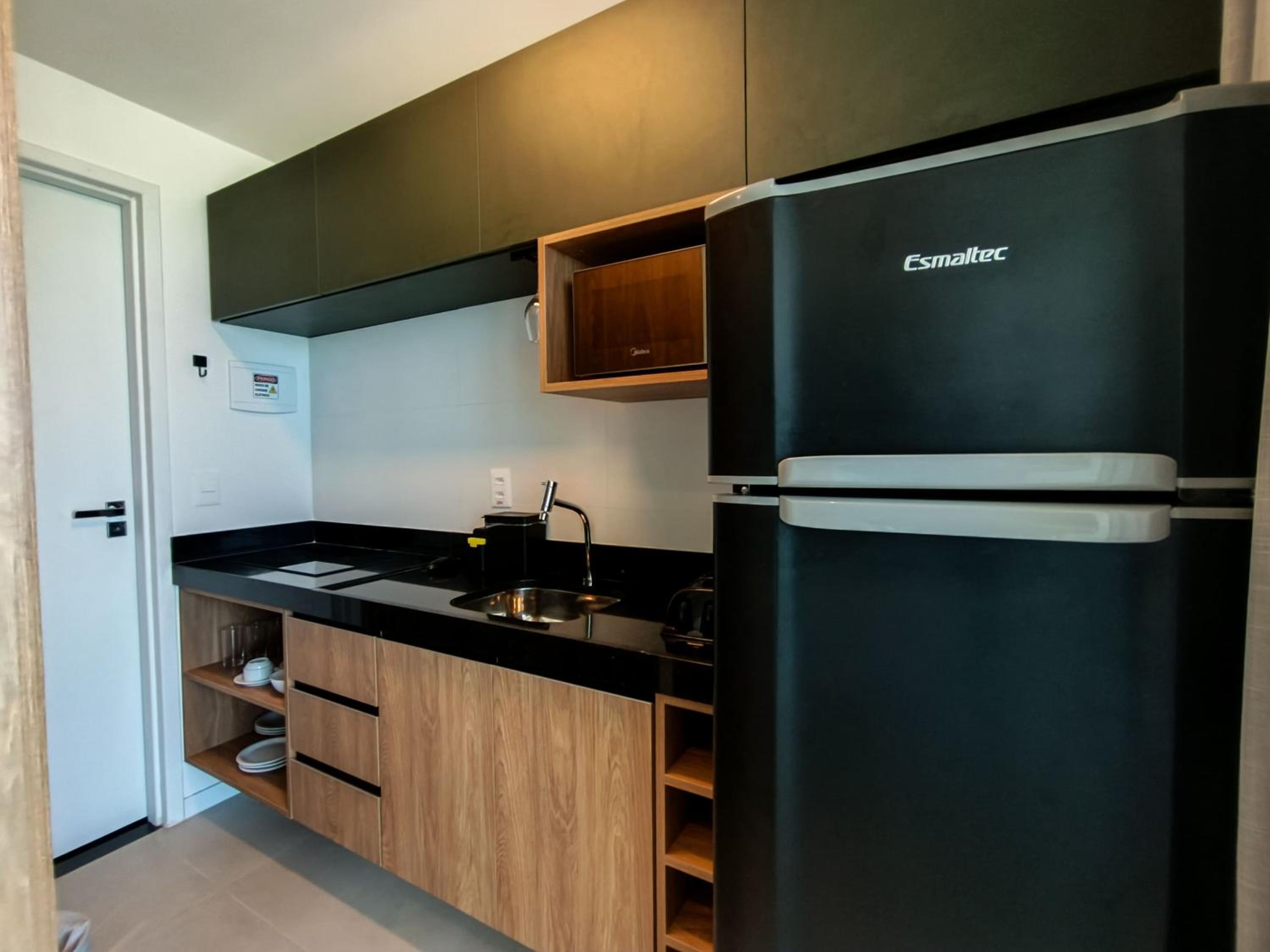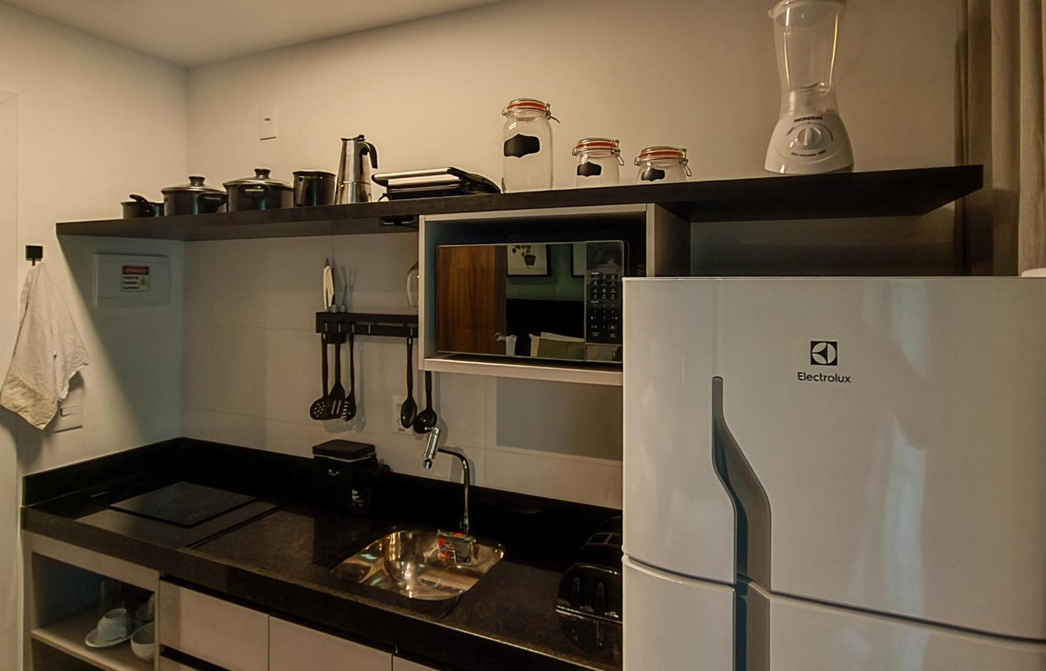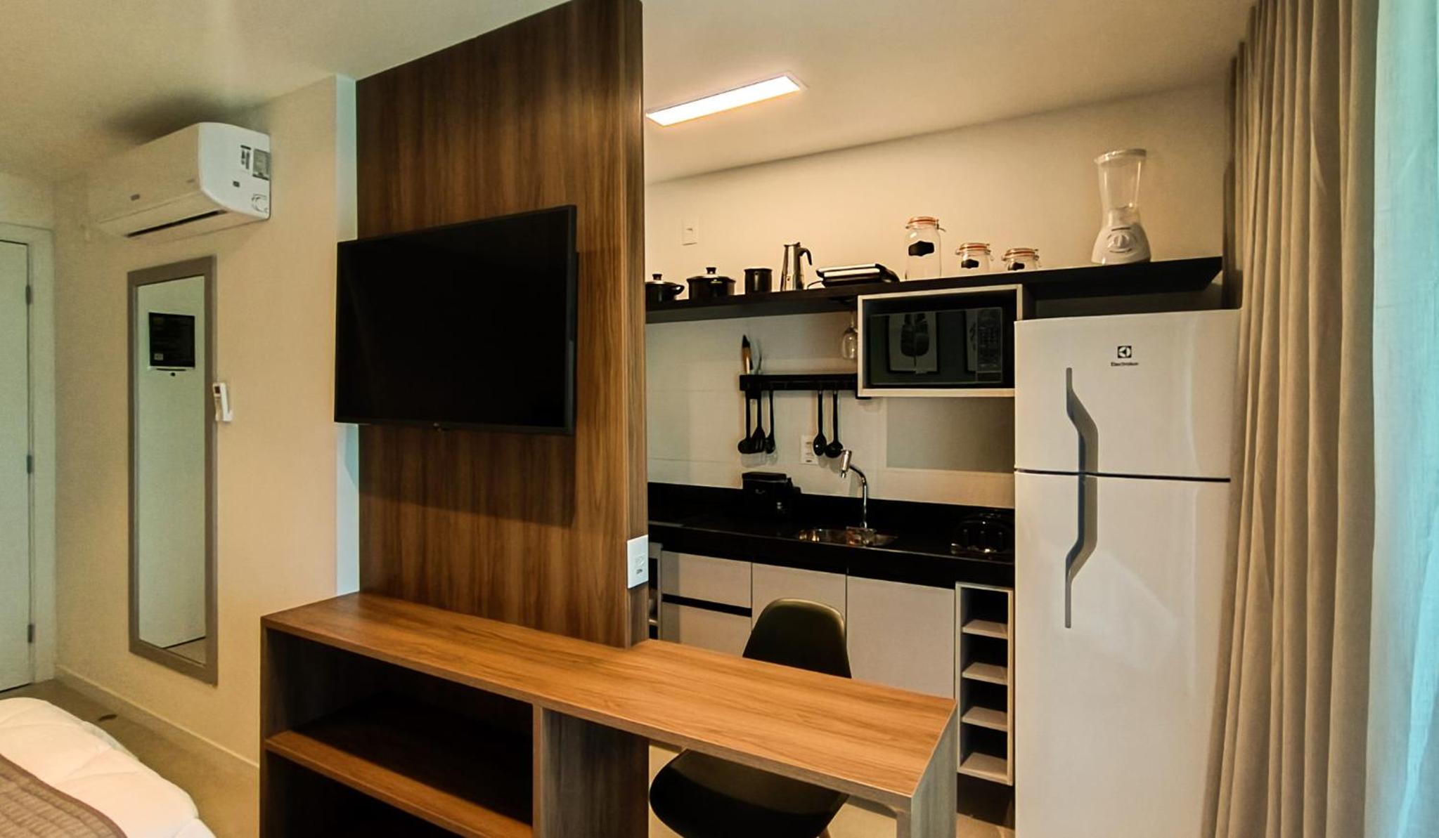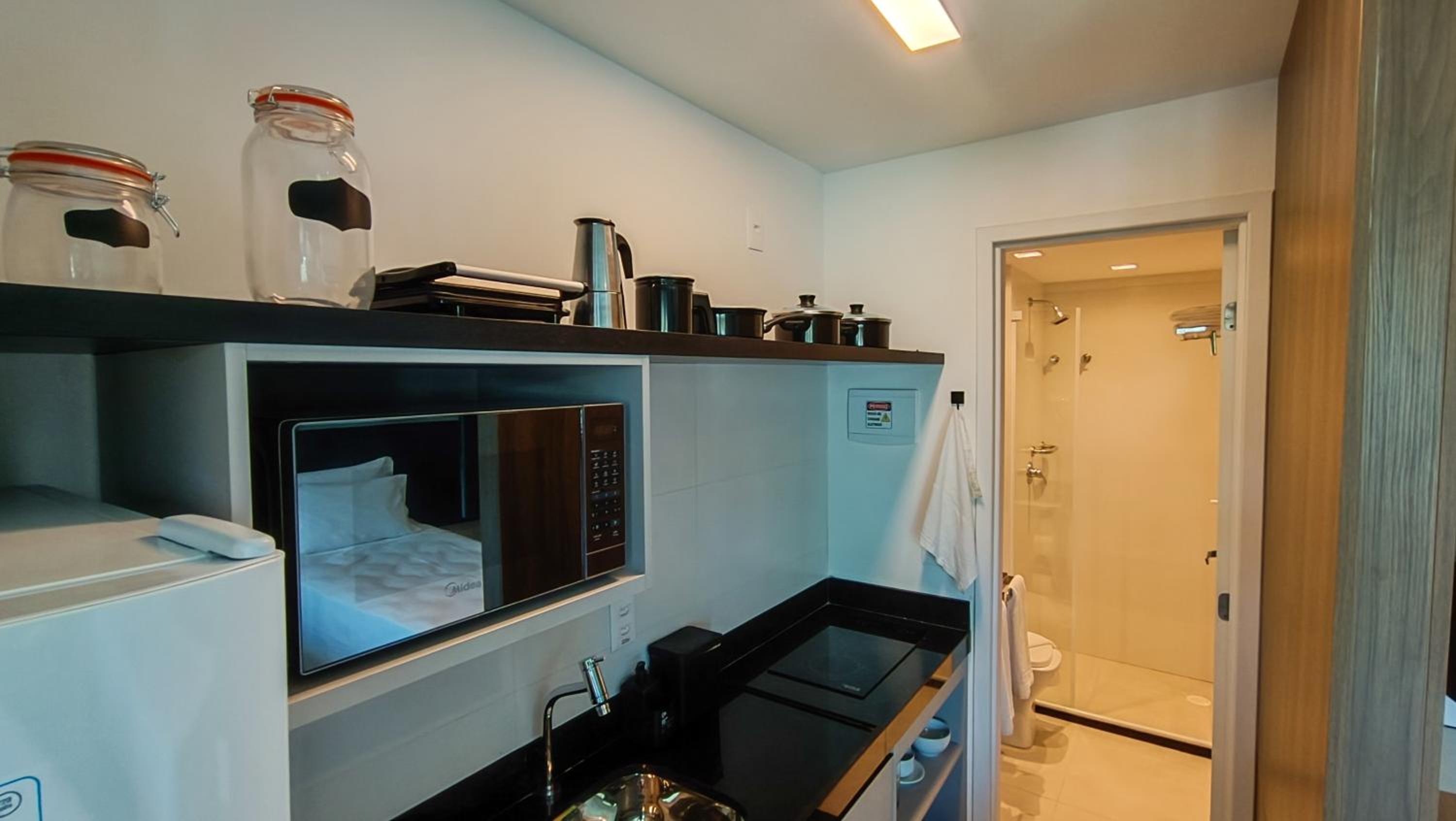 Apesar de pequeno (Studio) o hotel é novo e os quartos são equipados com todas as comodidades geladeira, Cooktop...