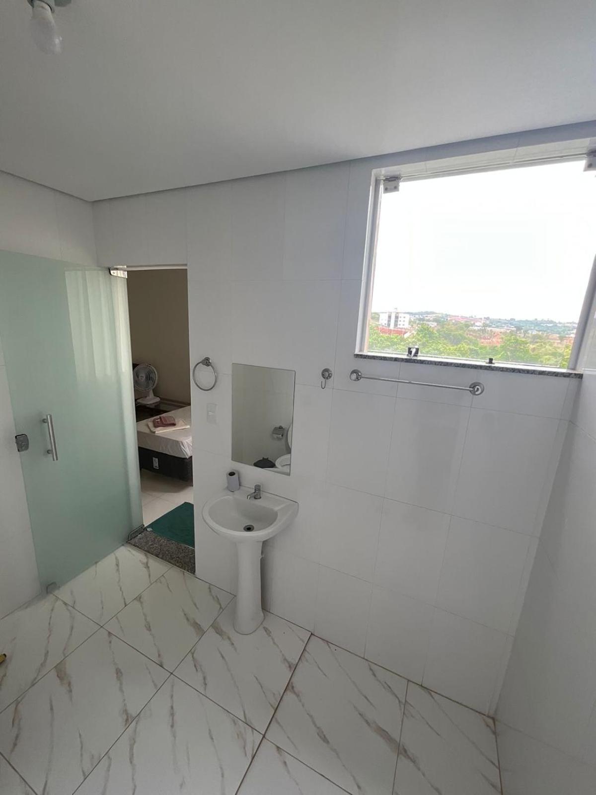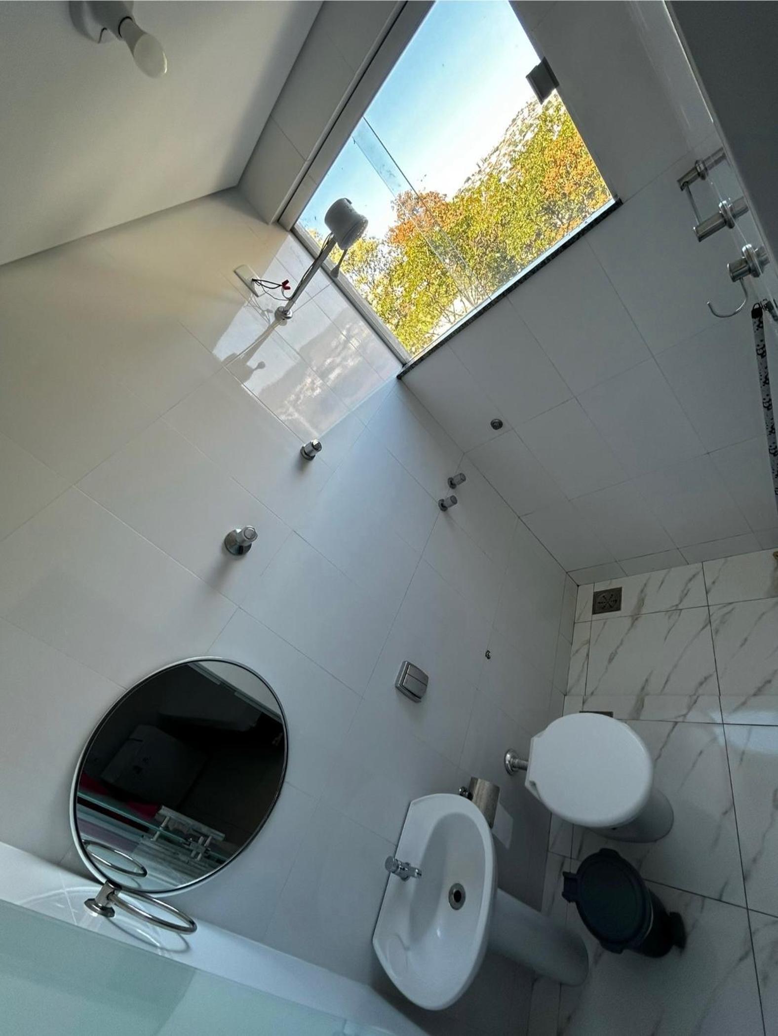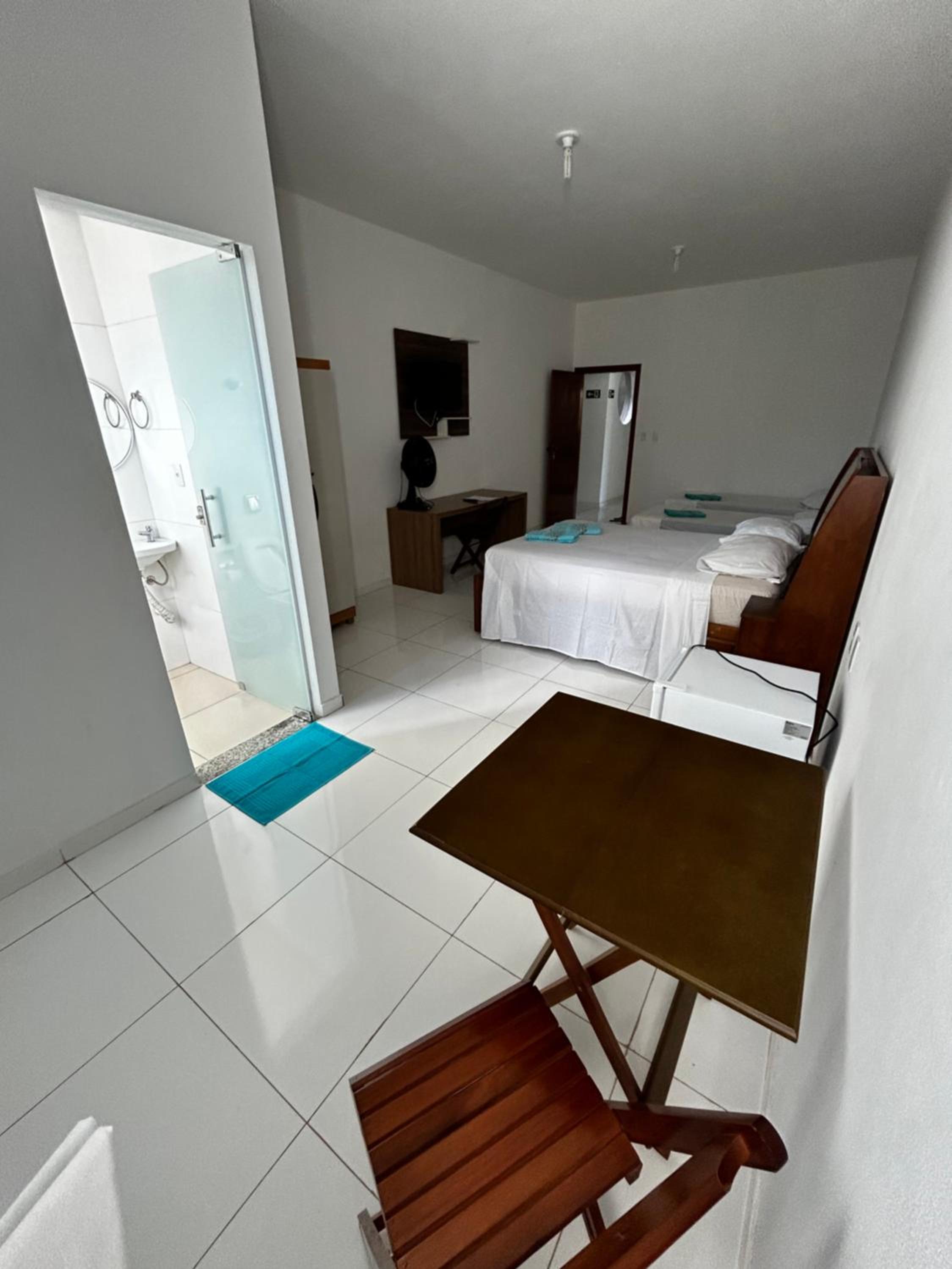 Claridade no quarto que vem da rua, através da porta do banheiro que é de vidro. Um ventilador hiper mega max barulhento, mesmo na velocidade 1. Falta um ar condicionado e um frigo bar no quarto.