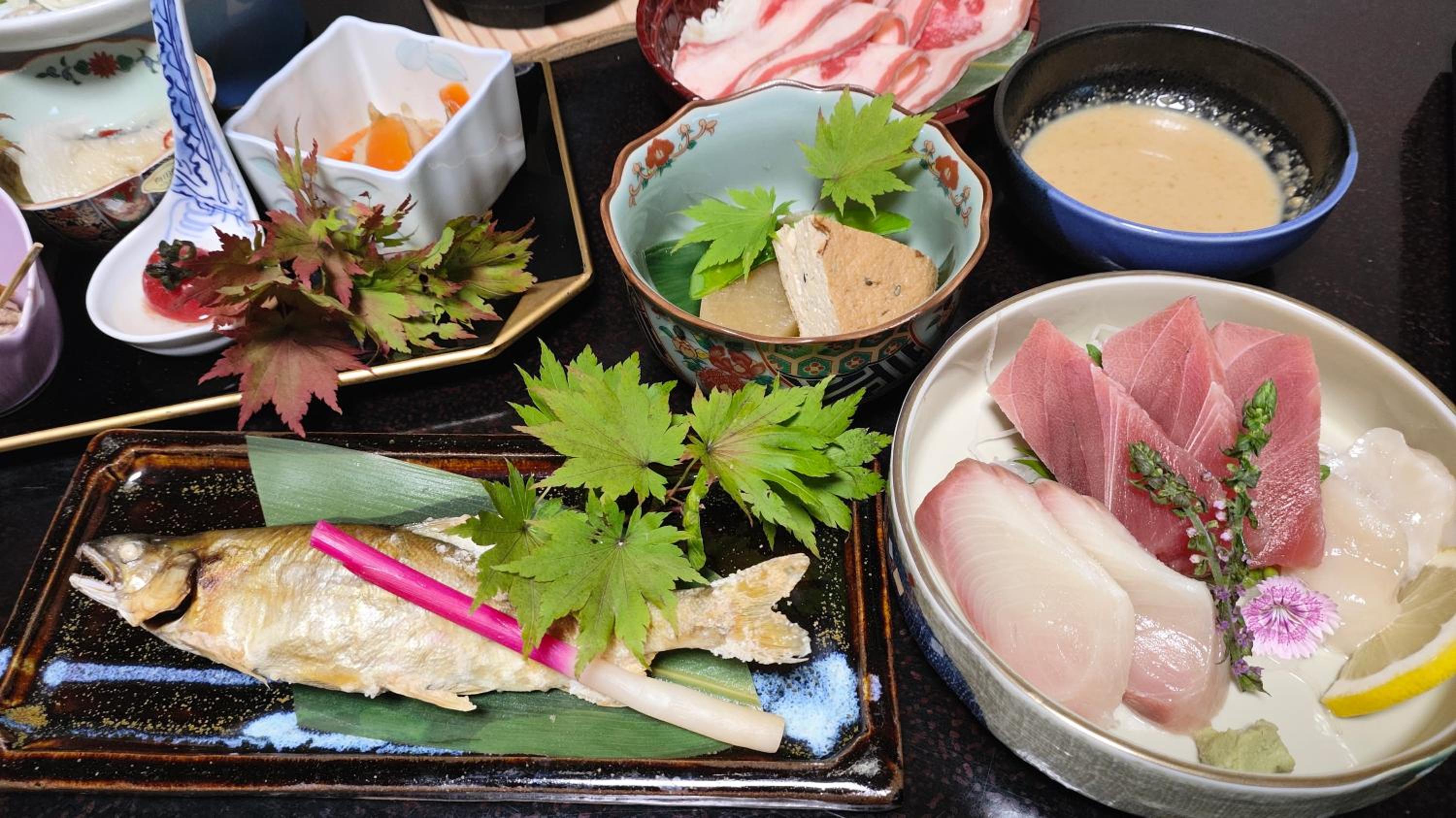 Service upon check-in and during meals was excellent. All staff were attentive and always made us feel welcome. Very polite and trying their best. Nice views of the mountains, river, and nature, overlooking a river. Food was plentiful and a wide variety of Japanese dishes for both dinner and breakfast. No noisy foot traffic, and no sounds of cars or buses passing by. Close enough to some great natural waterfalls and hiking paths easily accessible by public buses or car.