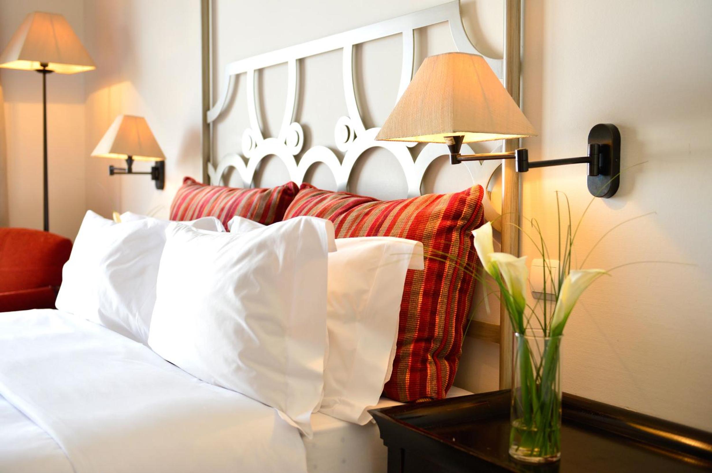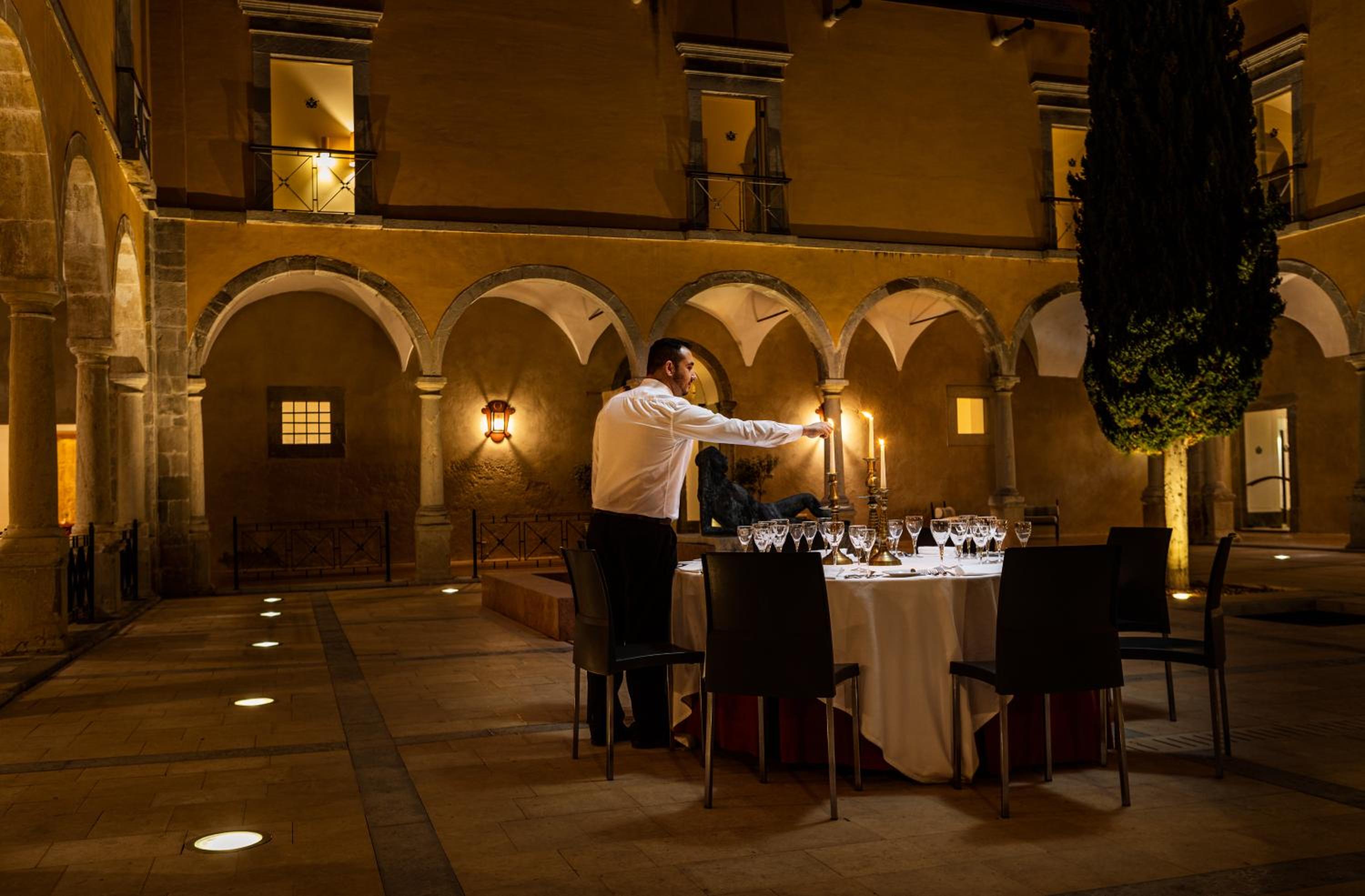 Guests can unwind by the outdoor pool or find shade under umbrellas on sun loungers. The colonnaded courtyard is perfect for a tranquil escape, while evenings can be spent by the fireplace in the elegant lounge.