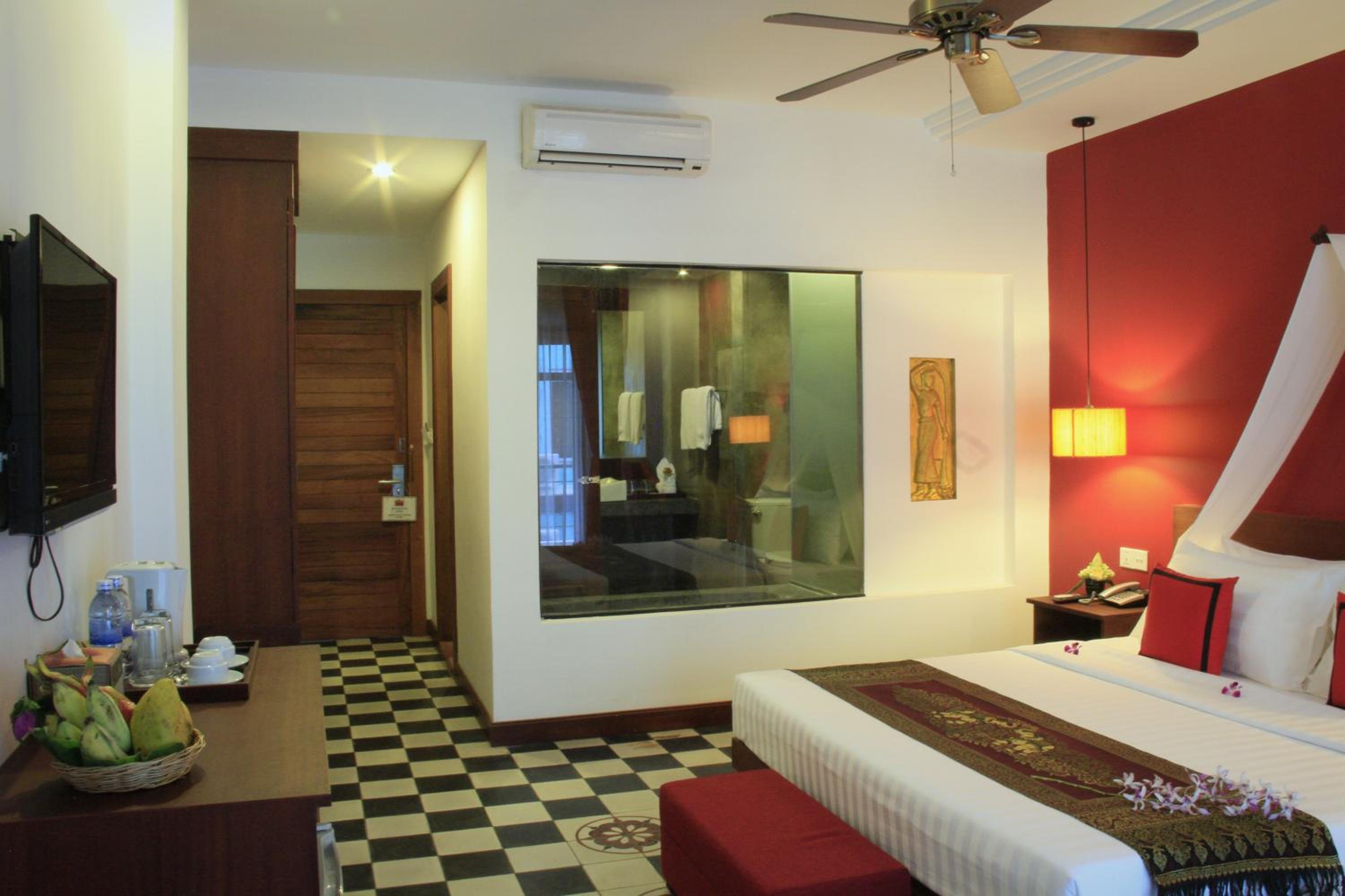 The air-conditioned rooms at Mekong Angkor offer modern amenities such as a flat-screen cable TV, fridge, and a cozy seating area. Each room boasts a private bathroom with a bathtub and shower for ultimate relaxation.