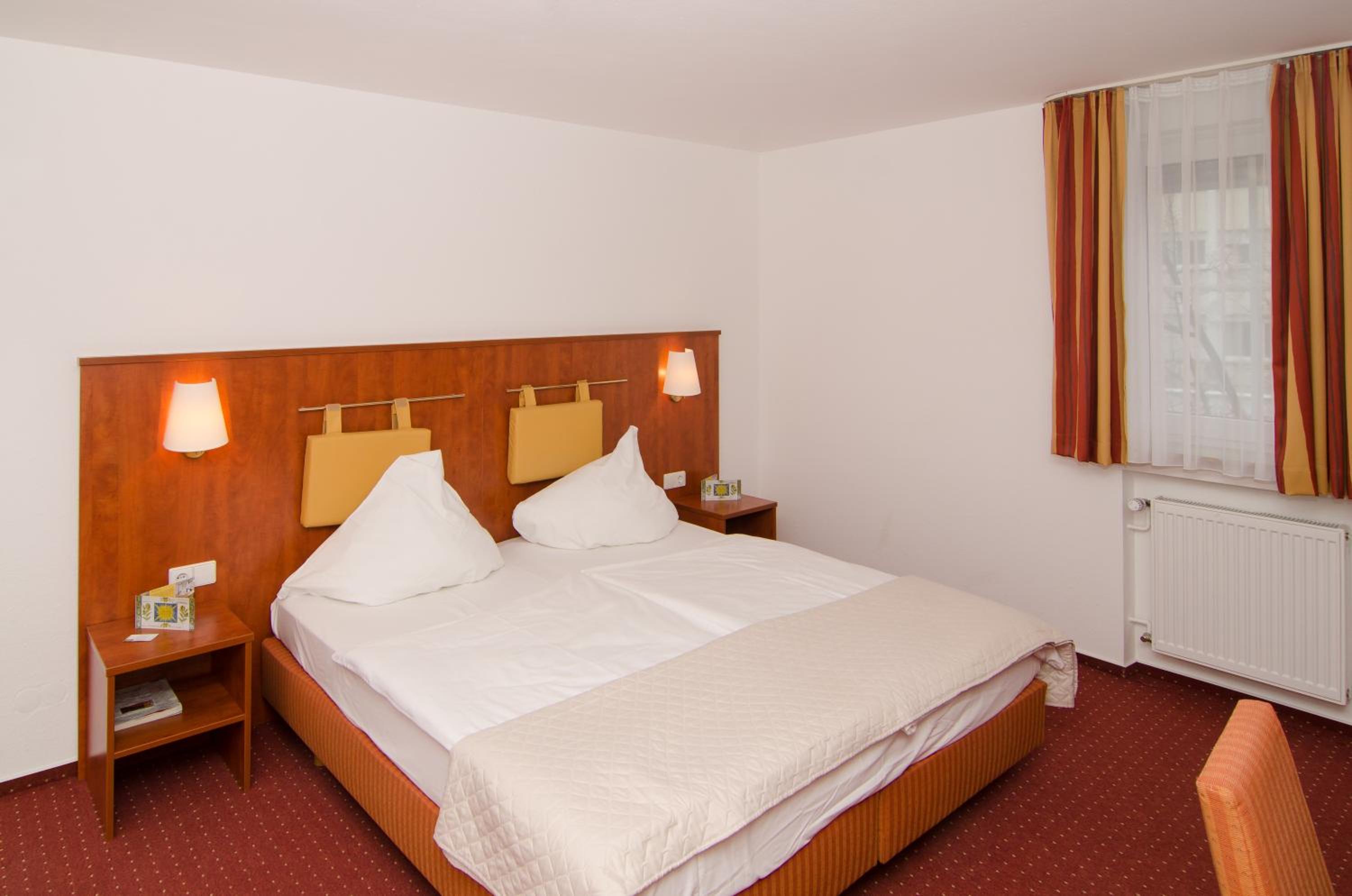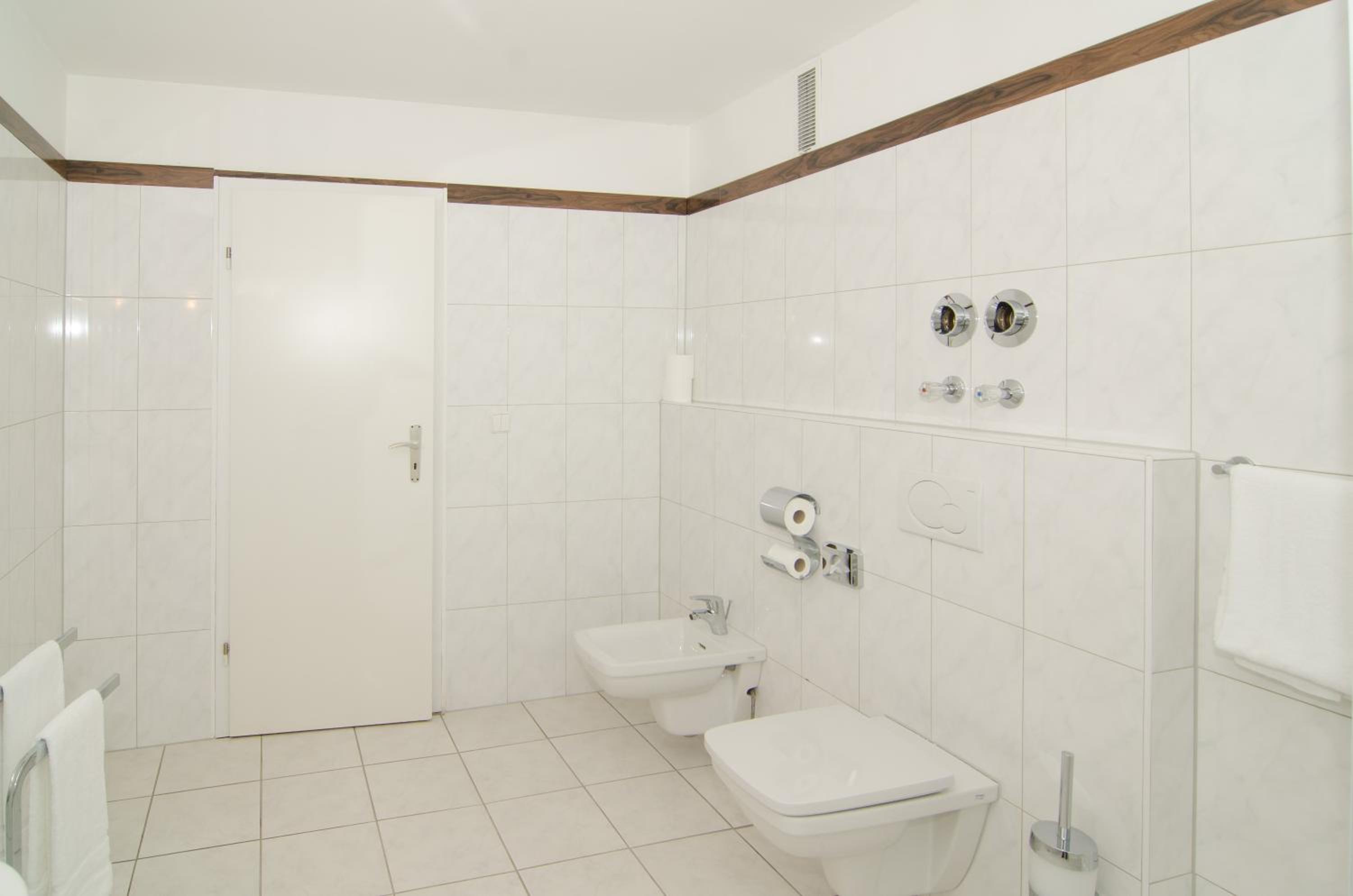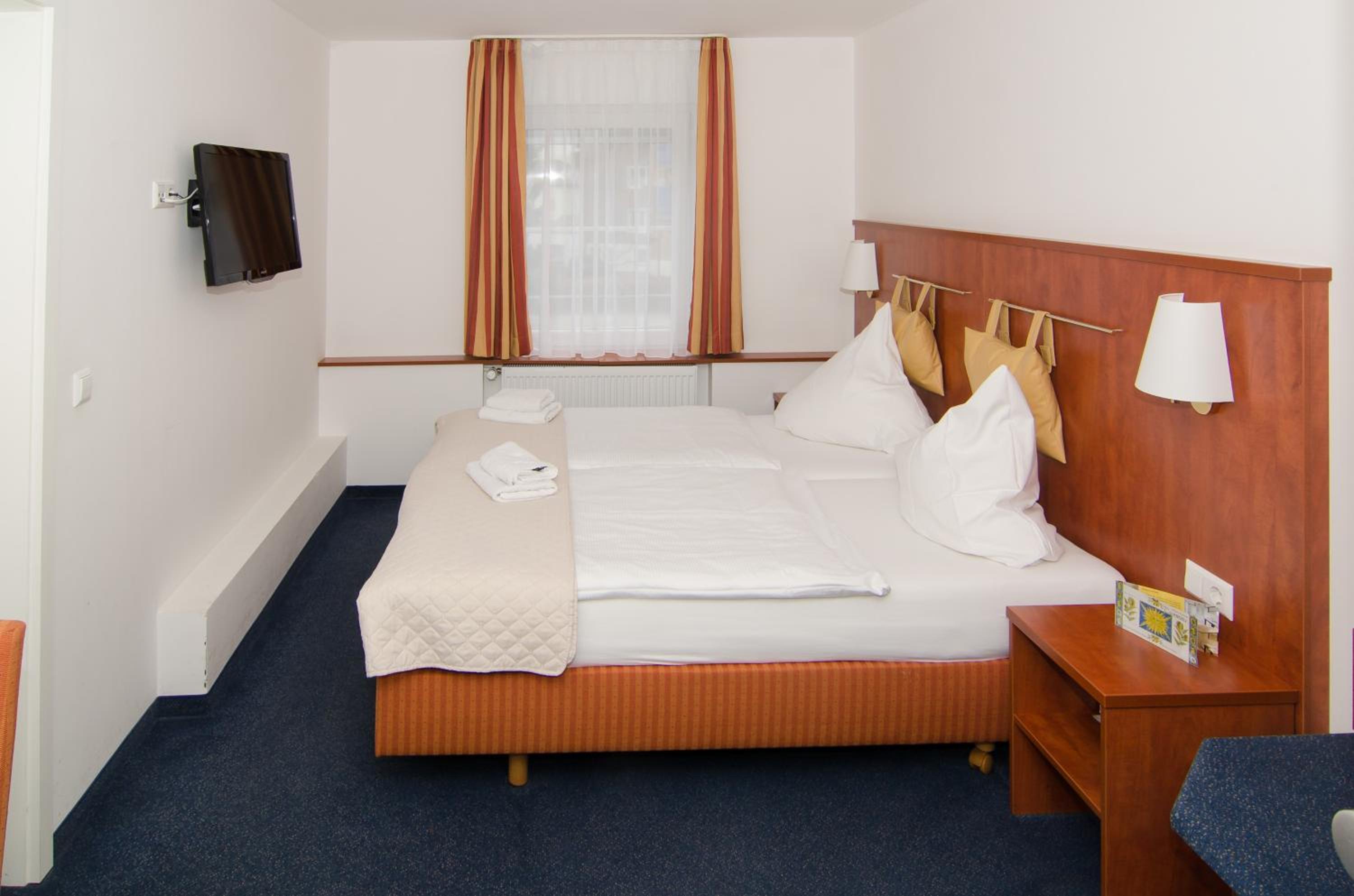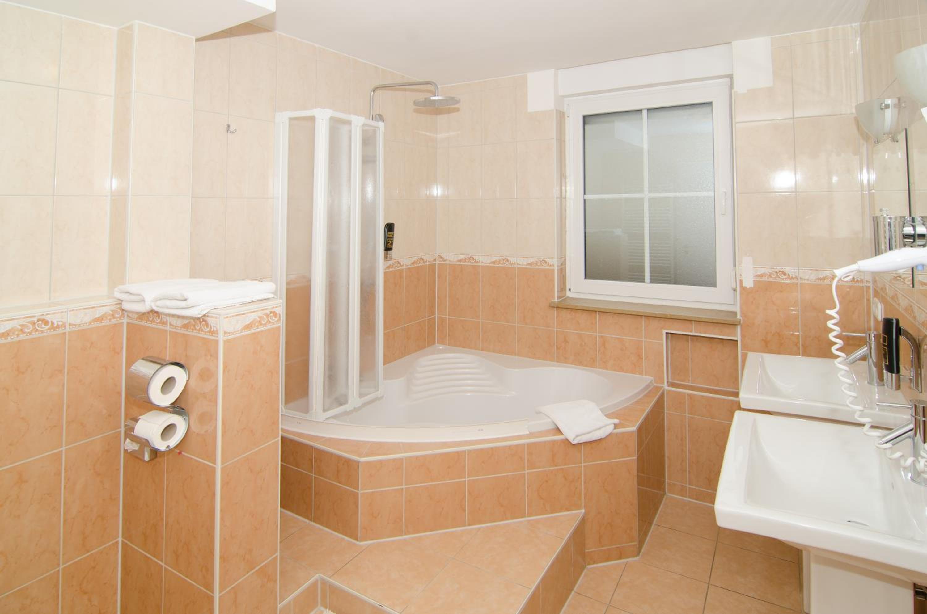 Das Frühstück war richtig gut. Kein Teppichboden im Zimmer. Das Bad war zwar klein, aber alles drin.