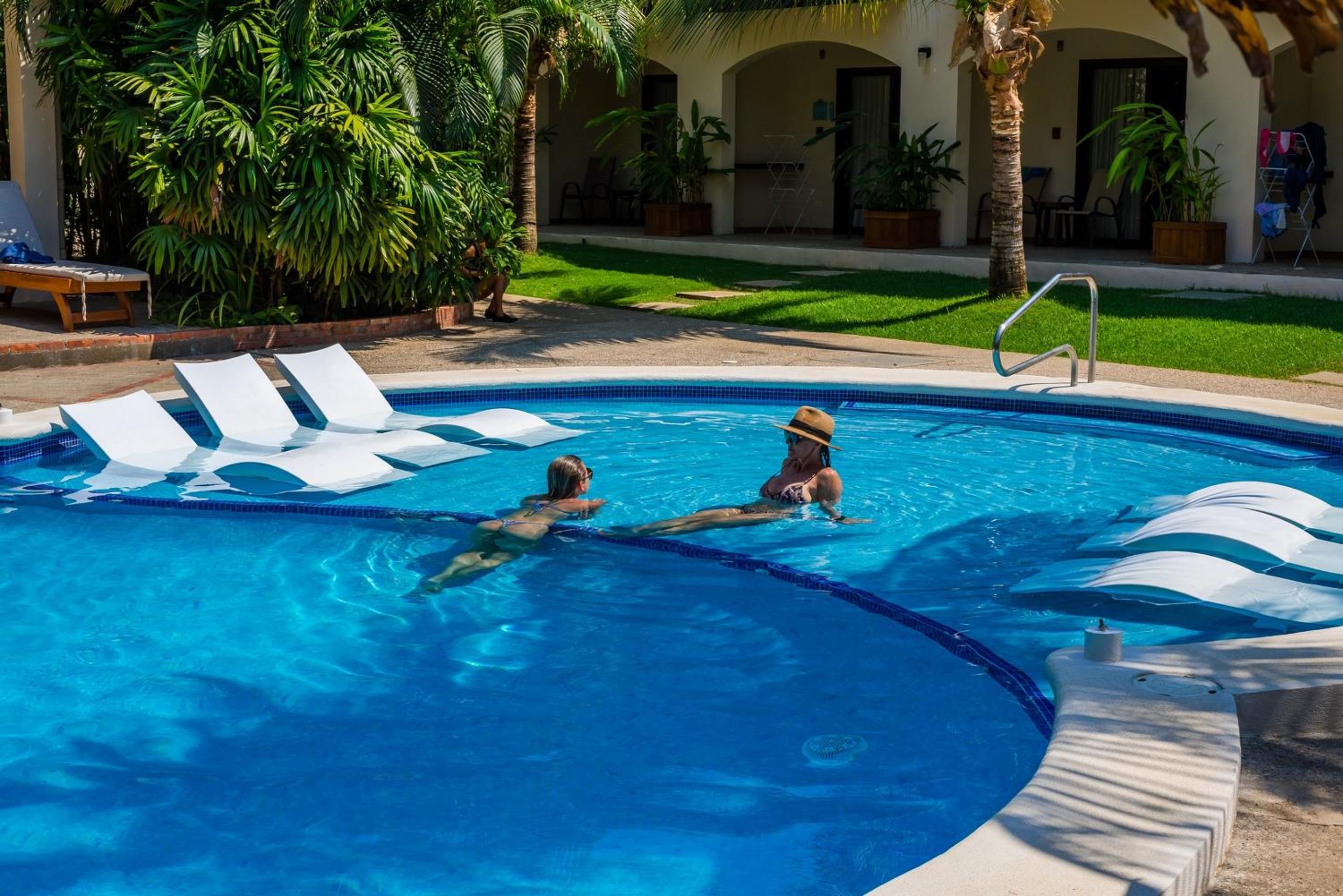 Liegestühle unter den Palmen. Kleiner Pool mit Liegestühlen im Garten. Wir hatten ein Gartenzimmer, was toll war. Man kann im November nachts gut ohne AC schlafen und sogar die Schiebetüre offenlassen, damit man all die Tiergeräusche hört. Das Gelände ist bewacht, wir fühlten uns total sicher. Auch das Personal war freundlich, fröhlich und auch für einen kurzen Schwatz zu haben. Der Strand ist gepflegt und jedermann surft, Der Strand ist auch für kleine Kinder geeignet. Restaurants hat es genügend in der Nähe. Gerade gegenüber hat es ein tolles Restaurant.