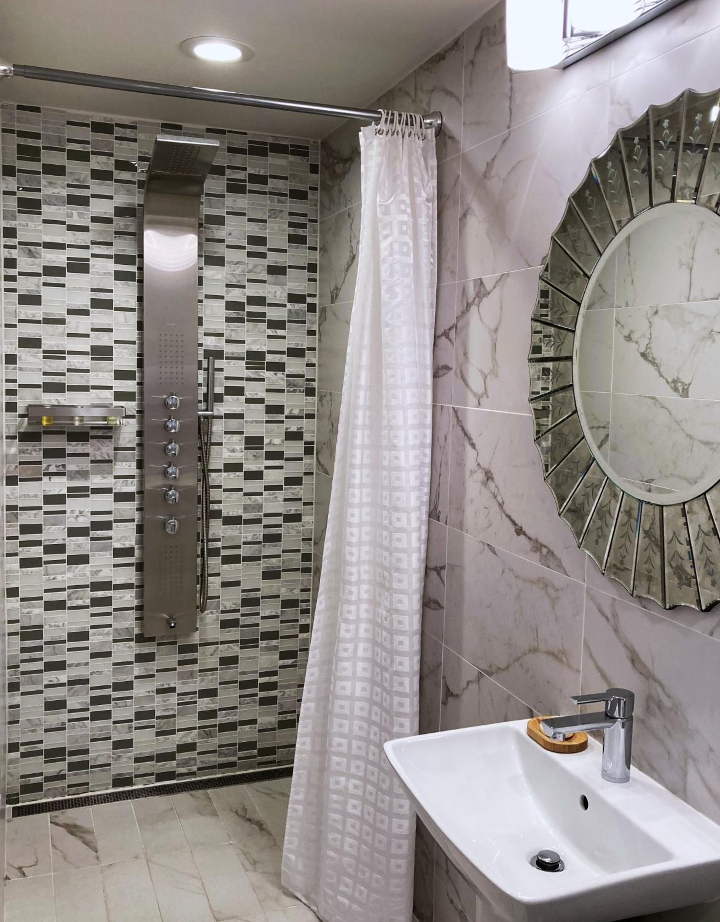 Tiny bathroom (but good shower!), sparce furniture, need new bedside tables