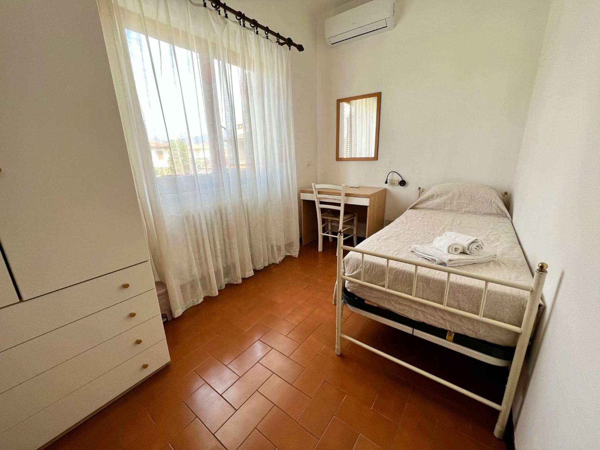 Camera e bagno di piccole dimensioni, finestre presenti in entrambe le stanze. Poca insonorizzazione.