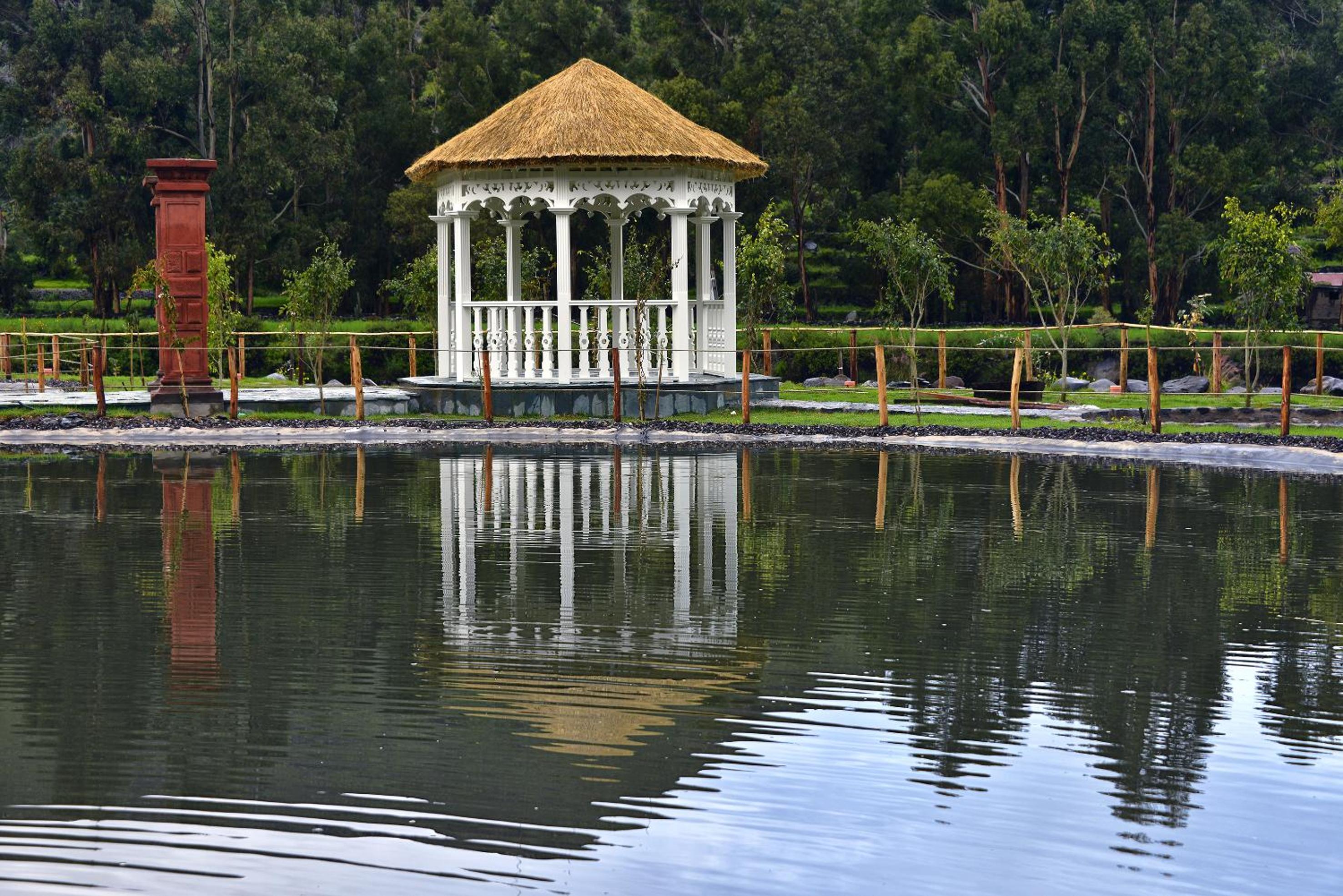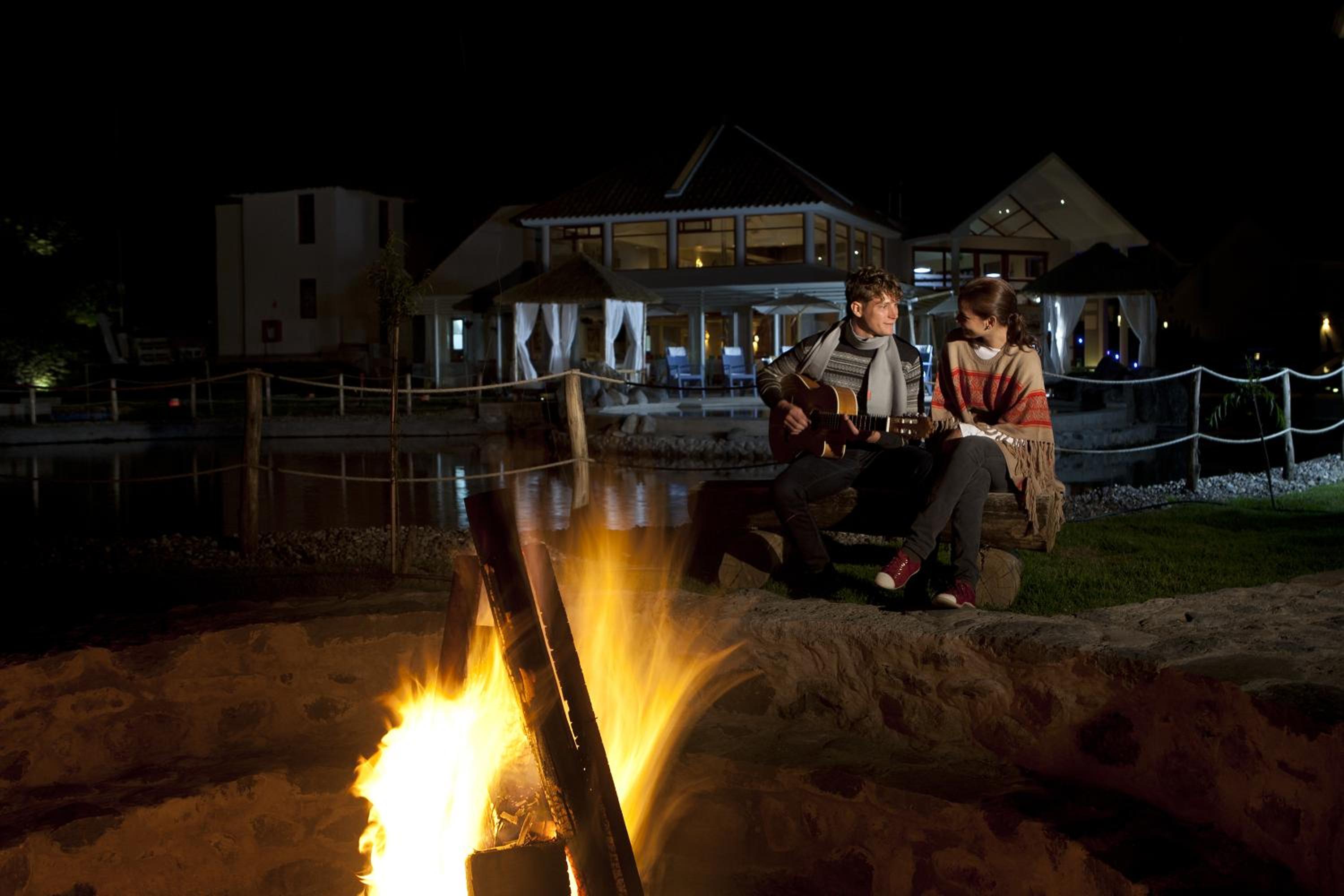 Experience luxury with elegant chandeliers, dark wood furnishings, and the option to stay in a charming chalet with a kitchenette.