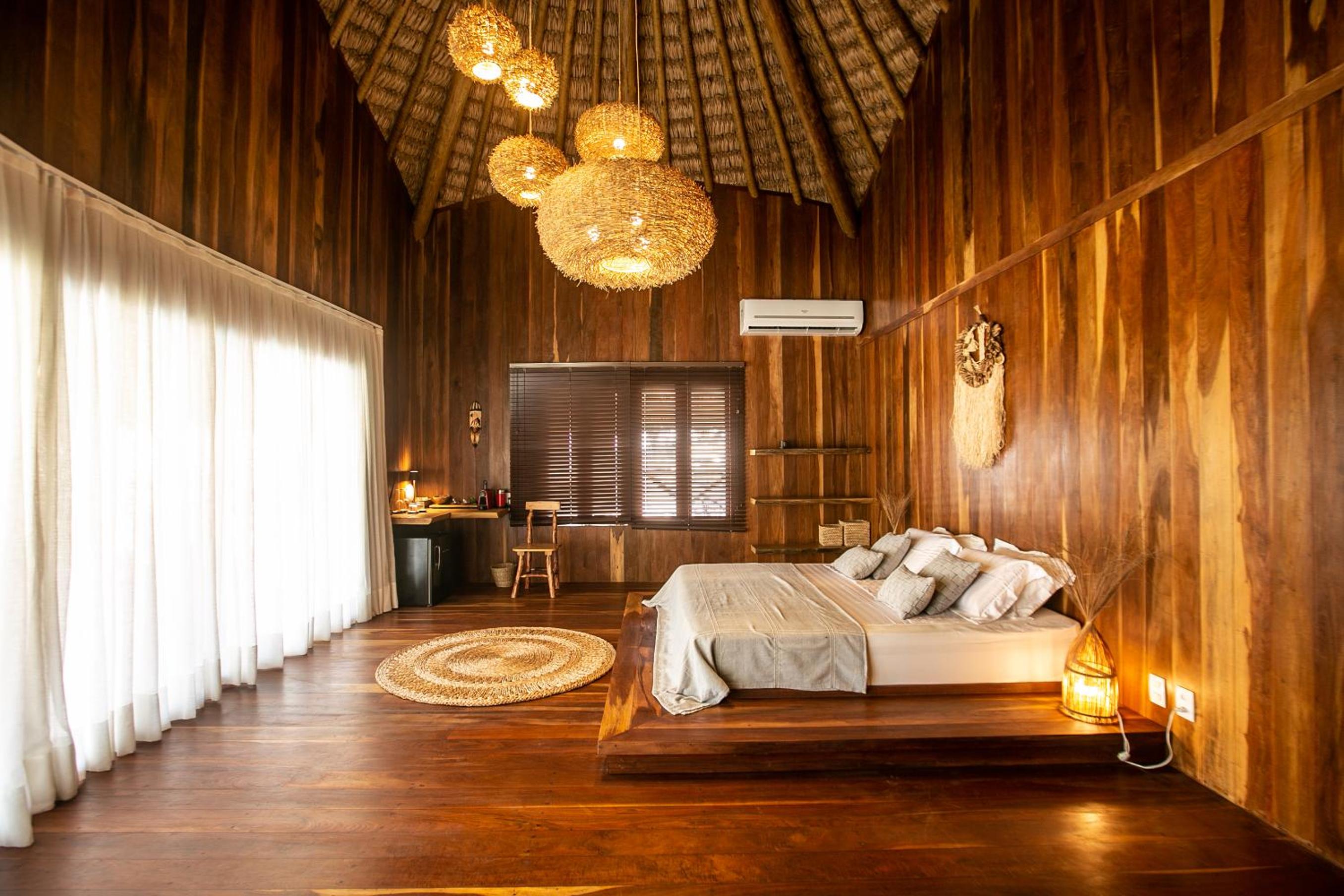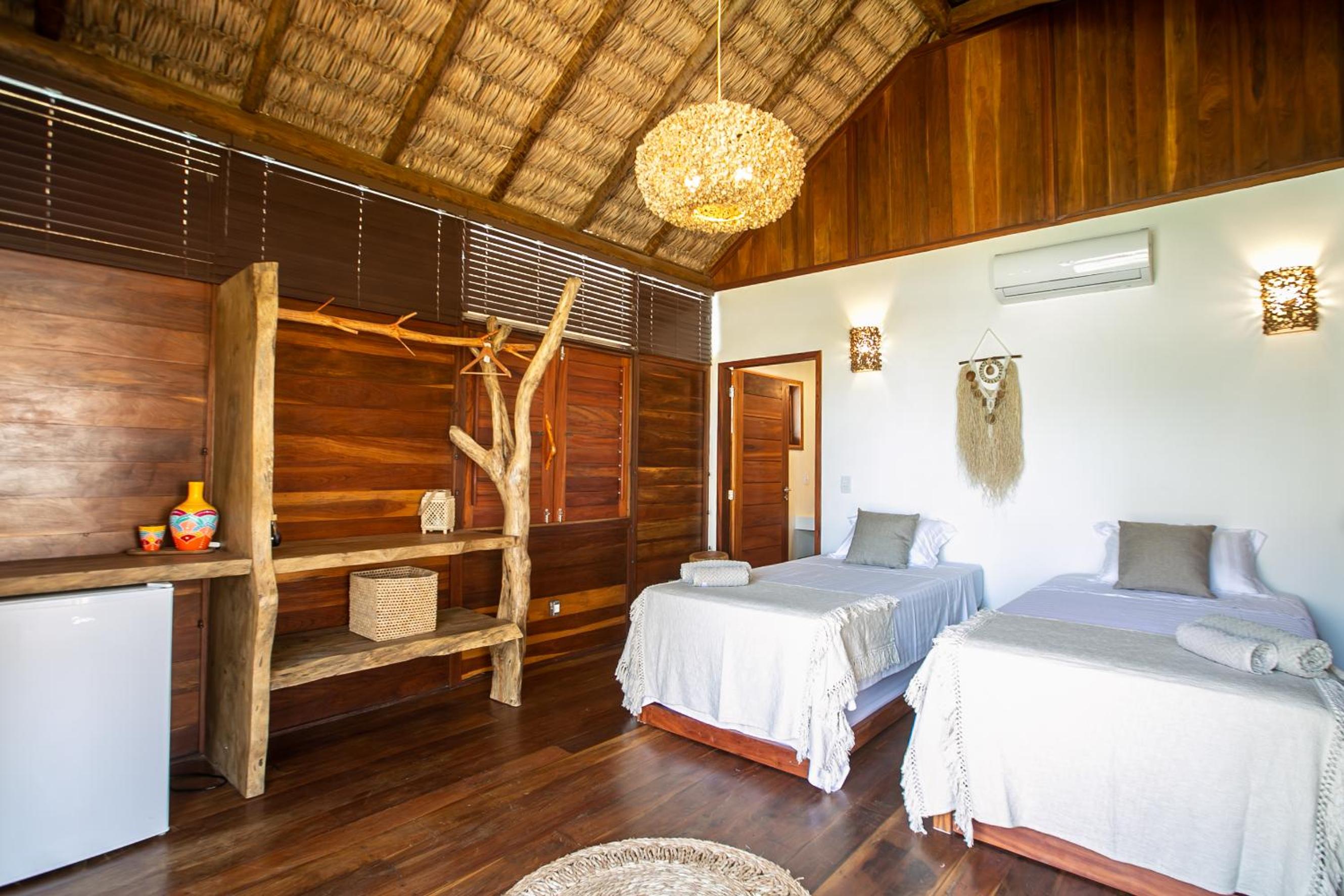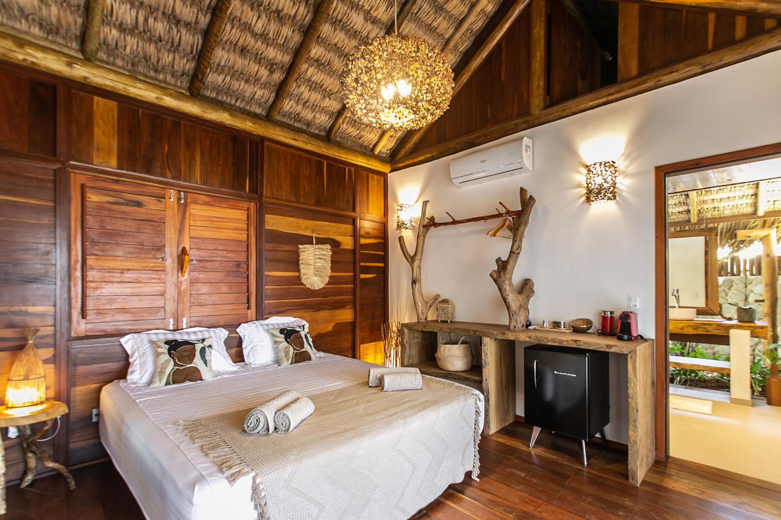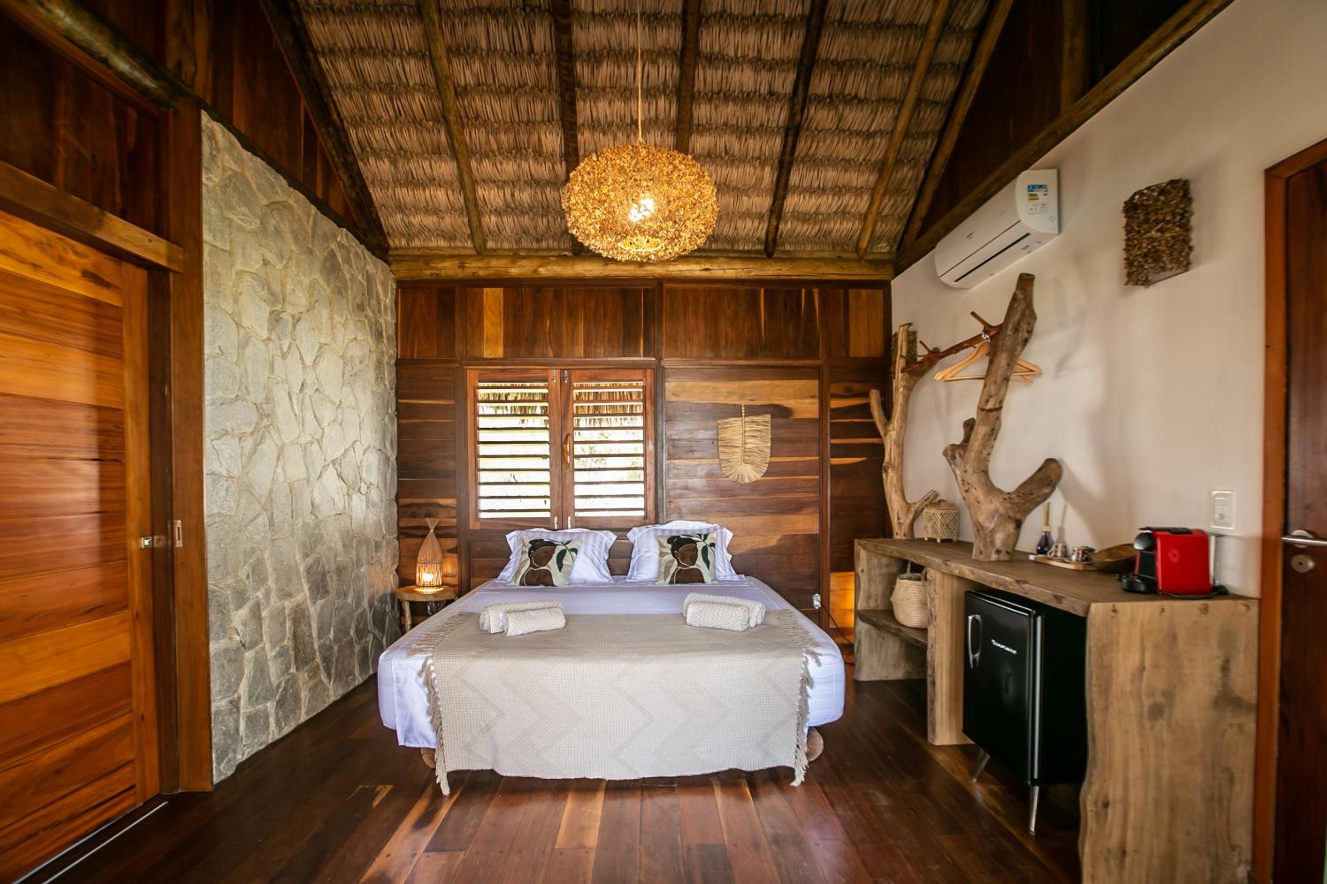 O quarto é lindo, mas faltou um apoio para malas. Como é um quarto mais compacto, nossas malas ficaram pelo chão. Como a natureza é pulsante na pousada, sugiro a inclusão de um cesto de lixo reciclável no quarto e cestos de lixo em um ou outro ponto do jardim. O evaporador do ar condicionado fica do lado de fora do quarto, bem sob a janela. Como as paredes são de madeira, não isolam tão bem o barulho, que pode incomodar algumas pessoas (nada excessivo, mas pode incomodar quem tem sono leve). Não gostei também dos pernilongos a noite, tive que passar repelente para dormir (mas não sei se a pousada pode fazer algo sobre isso ou se é uma característica da região)