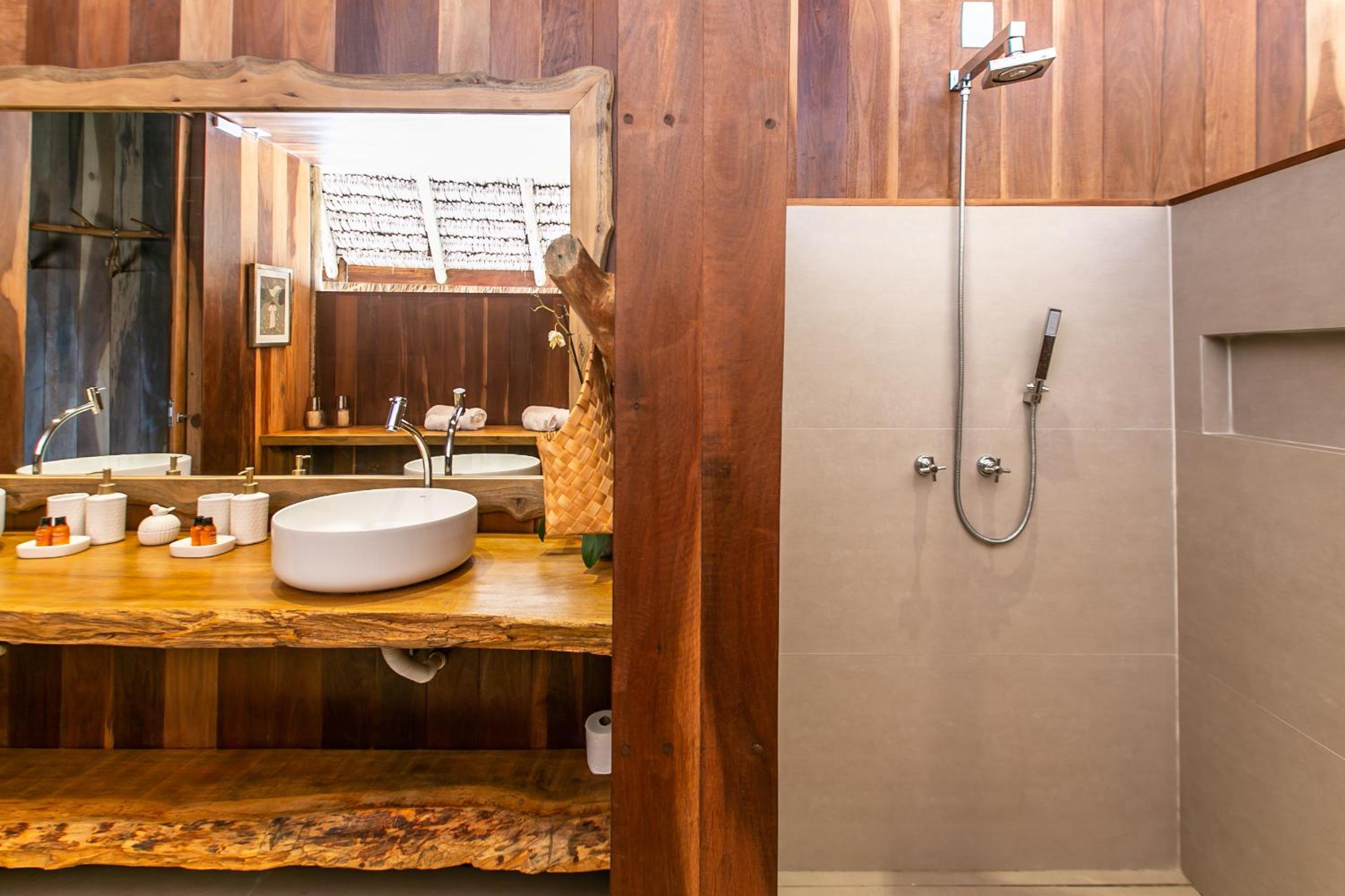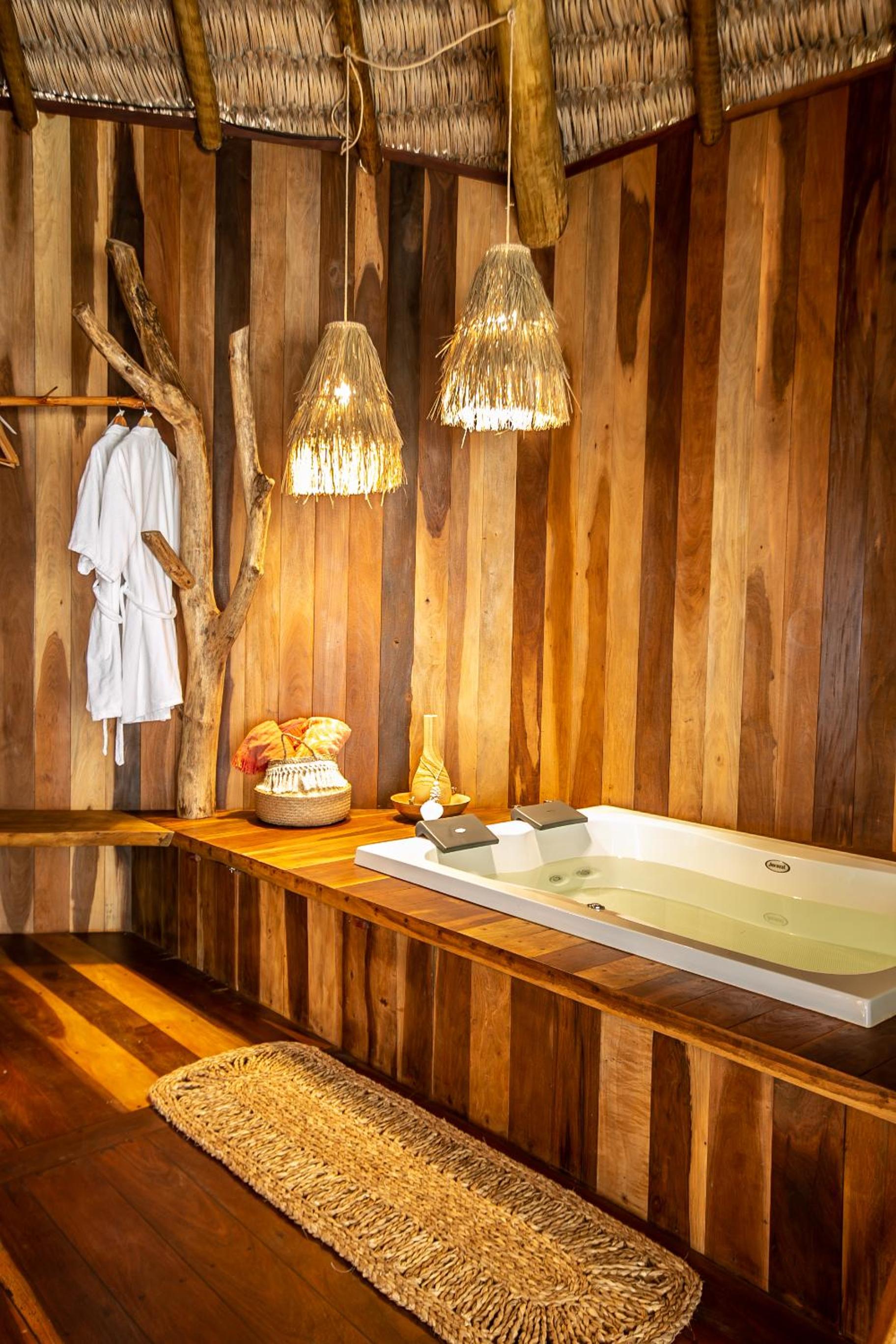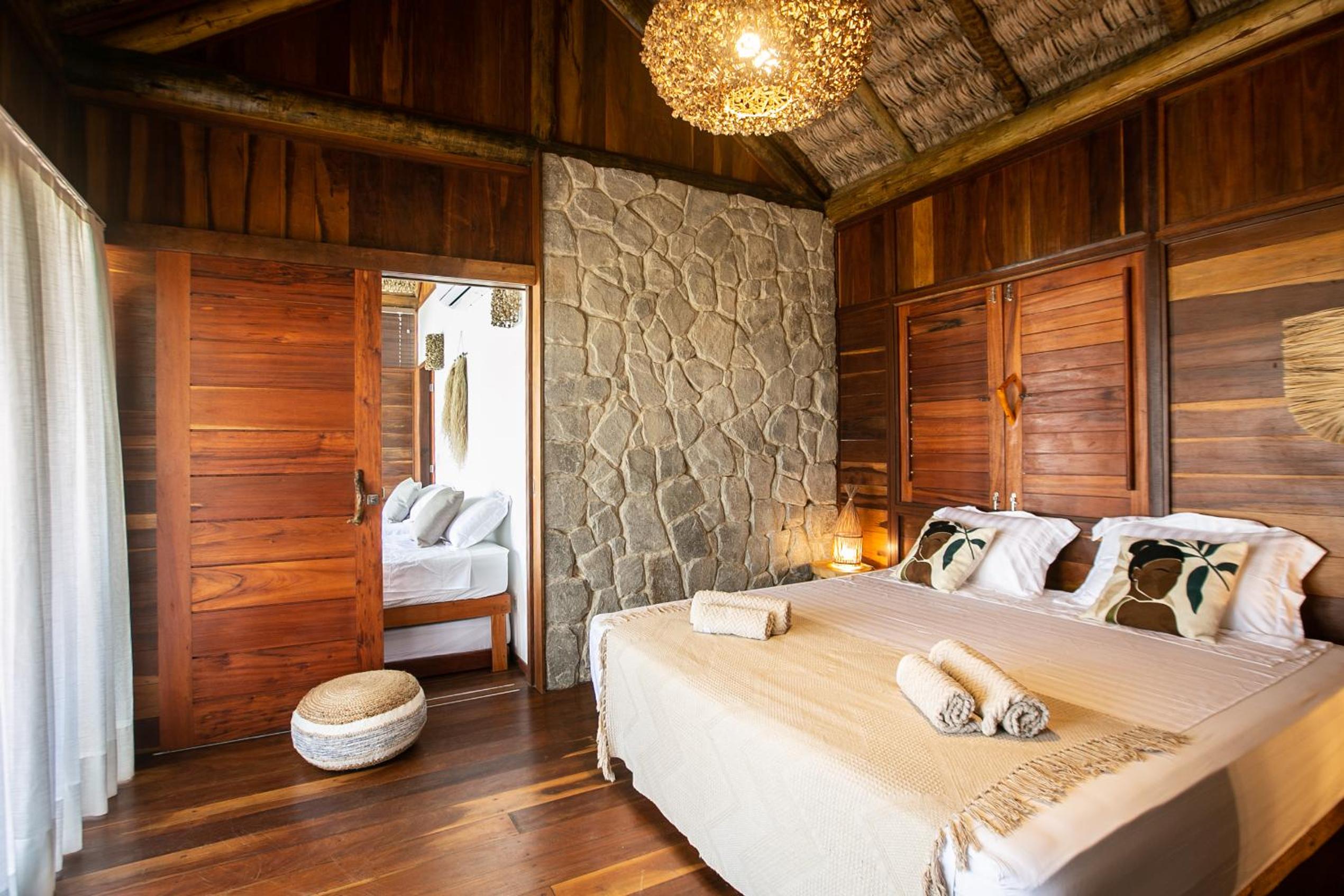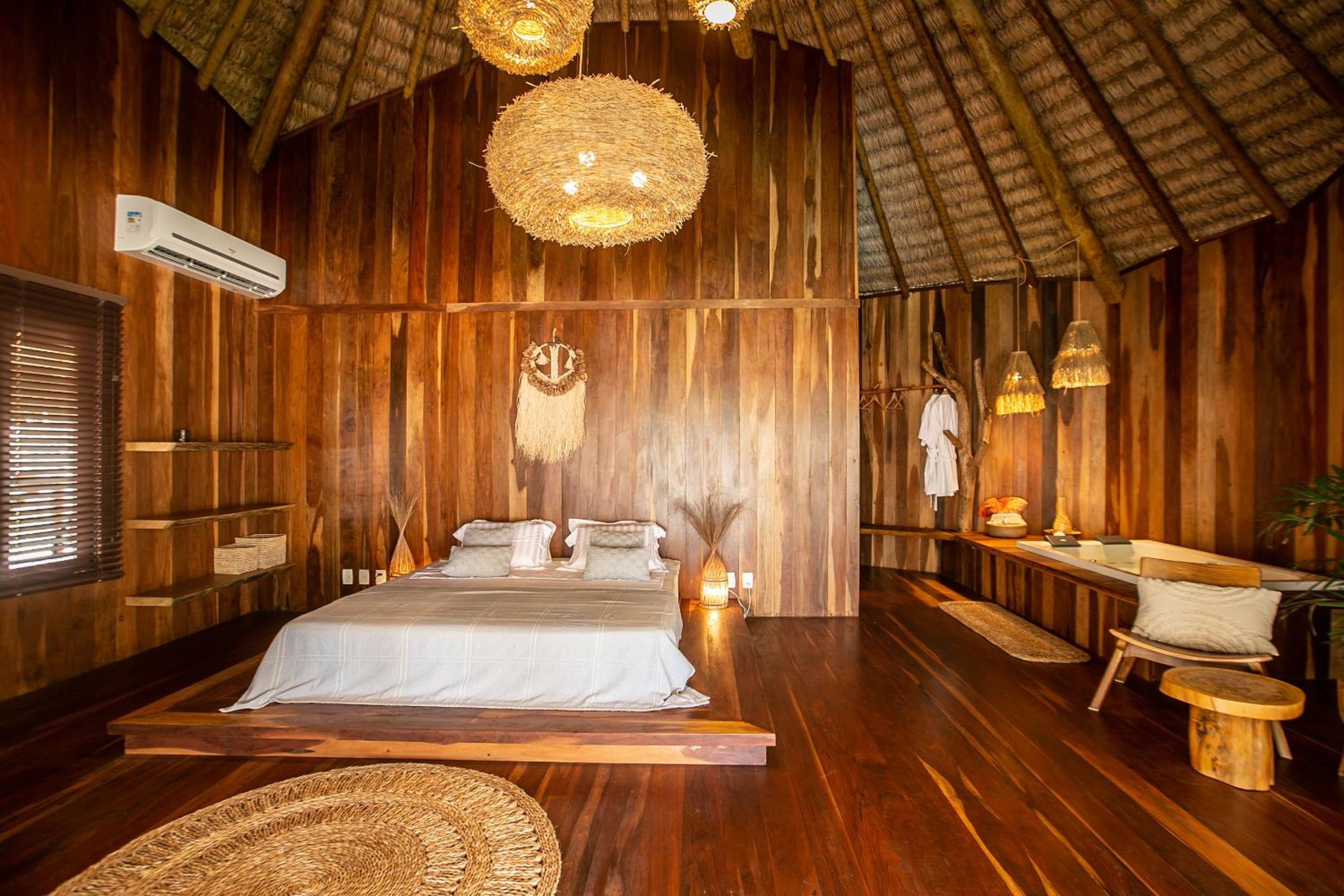 O quarto é lindo, mas faltou um apoio para malas. Como é um quarto mais compacto, nossas malas ficaram pelo chão. Como a natureza é pulsante na pousada, sugiro a inclusão de um cesto de lixo reciclável no quarto e cestos de lixo em um ou outro ponto do jardim. O evaporador do ar condicionado fica do lado de fora do quarto, bem sob a janela. Como as paredes são de madeira, não isolam tão bem o barulho, que pode incomodar algumas pessoas (nada excessivo, mas pode incomodar quem tem sono leve). Não gostei também dos pernilongos a noite, tive que passar repelente para dormir (mas não sei se a pousada pode fazer algo sobre isso ou se é uma característica da região)