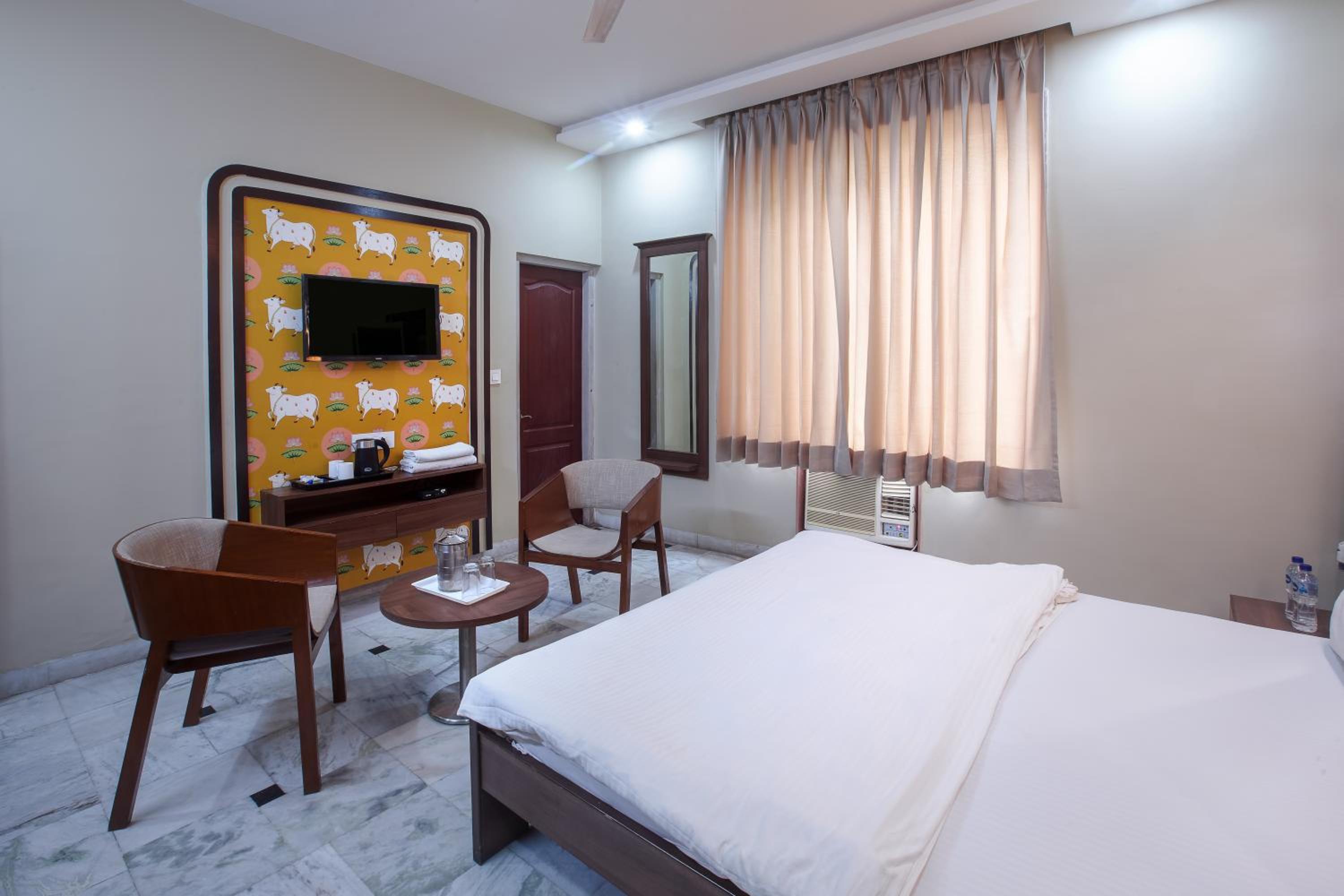 Guests can enjoy well-equipped rooms with modern amenities such as air conditioning, flat-screen TV, and private bathrooms at Hotel Bhakti Dhama.