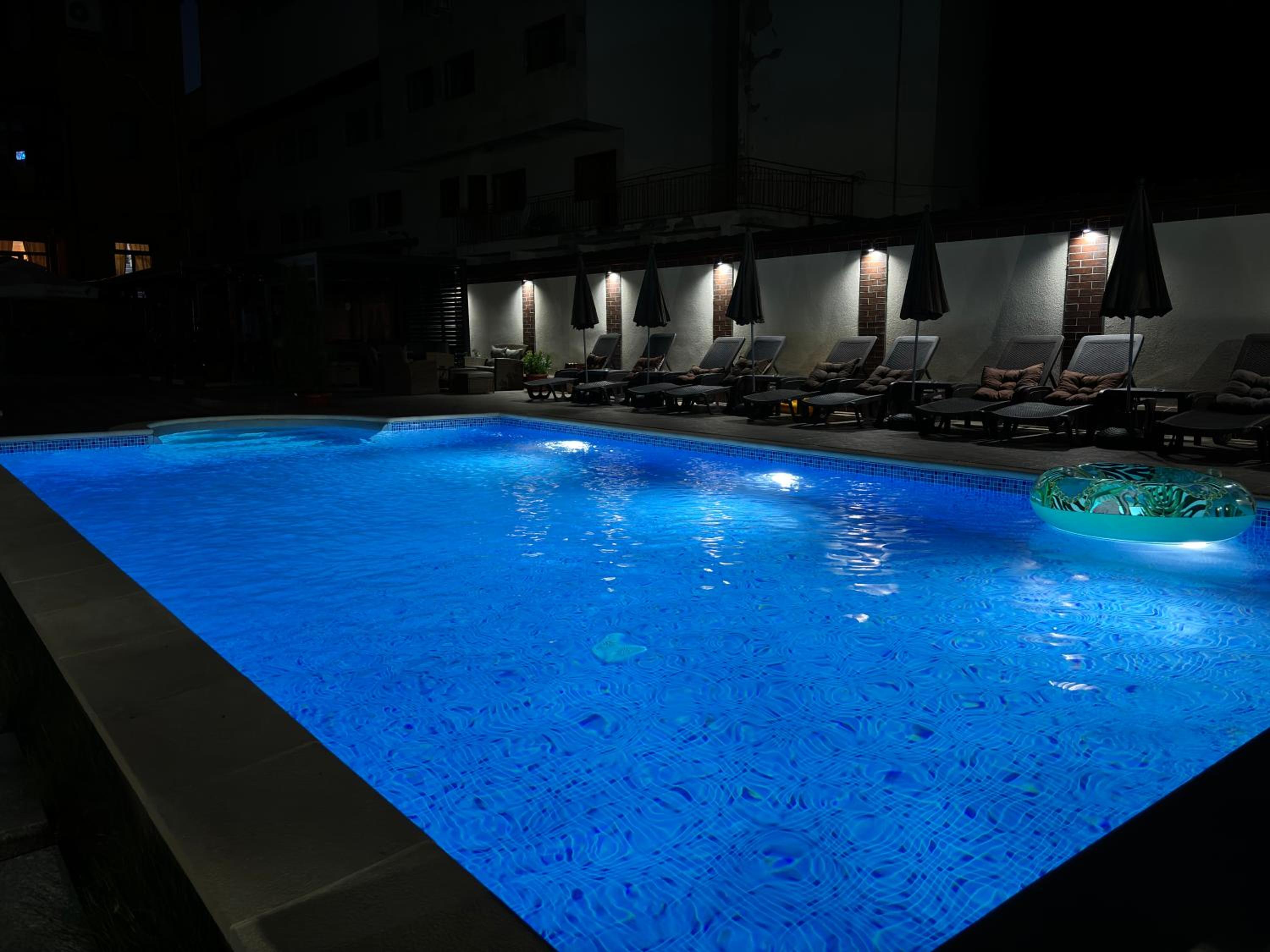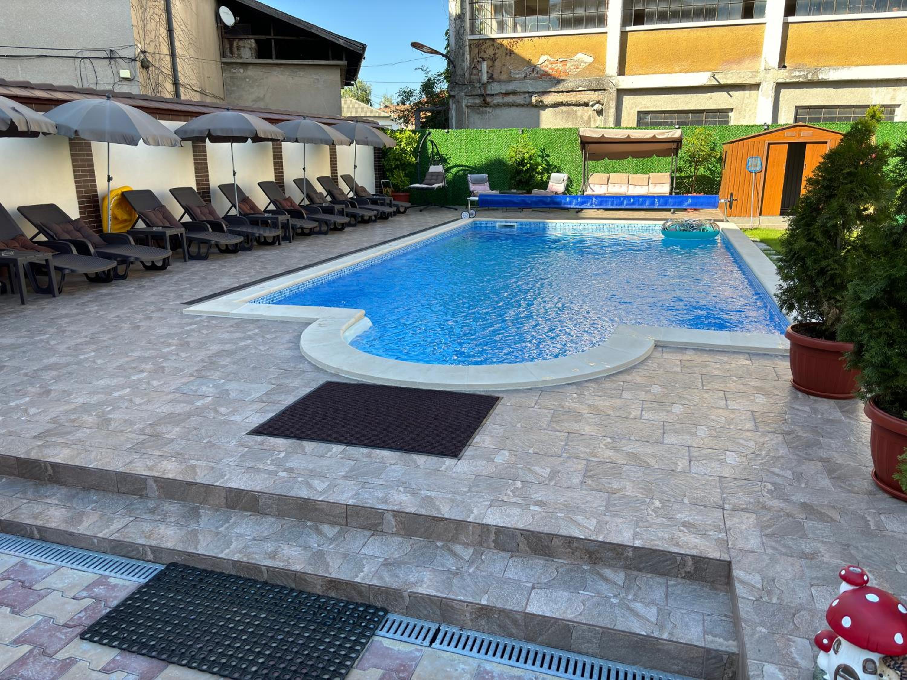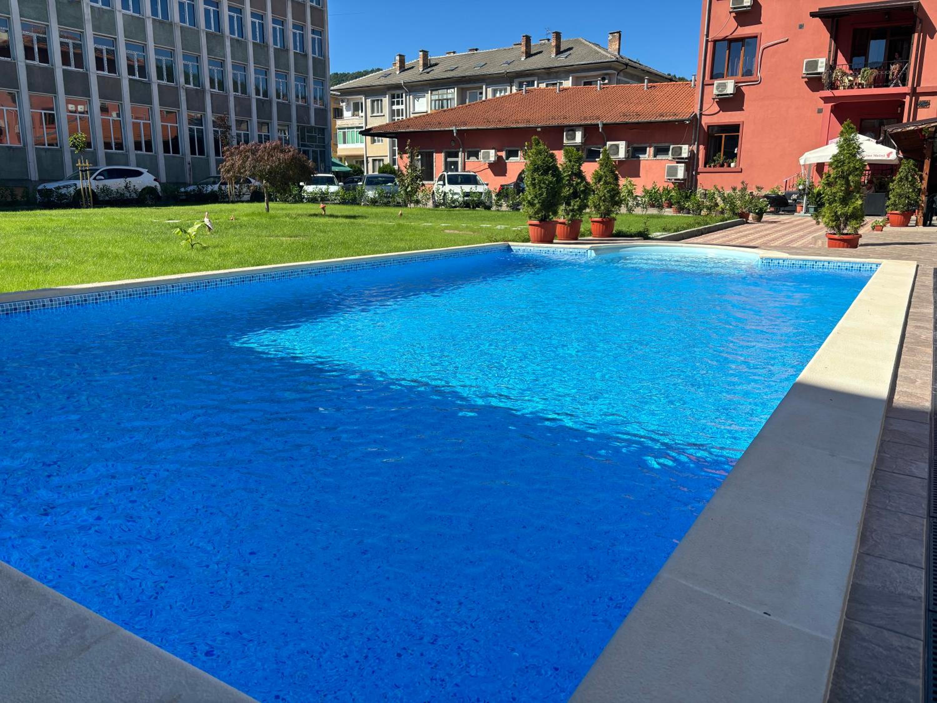 , охраняем безплатен паркинг. Много чист басейн, голям батут.