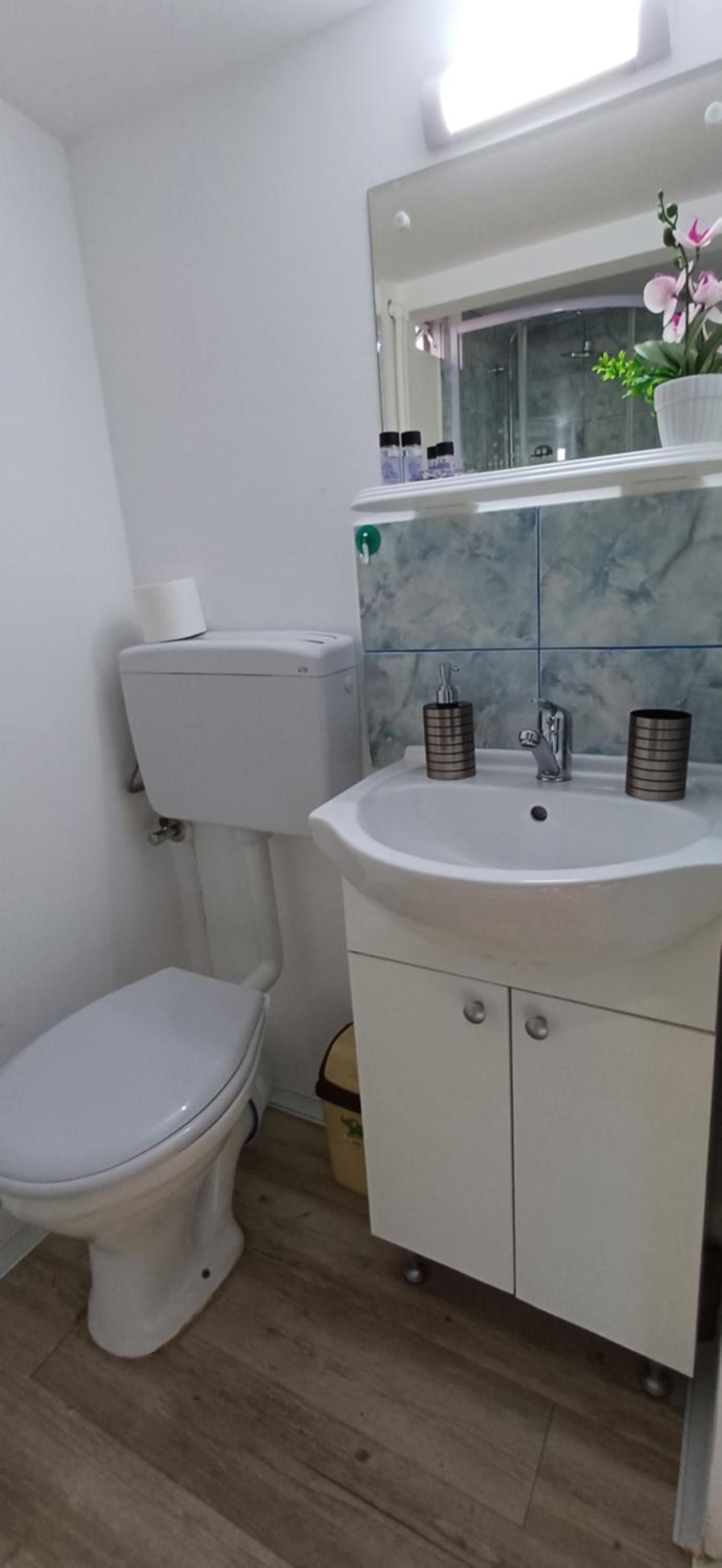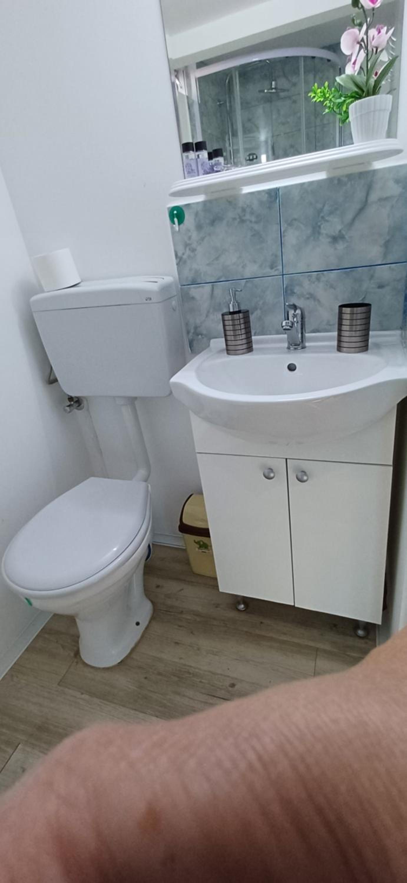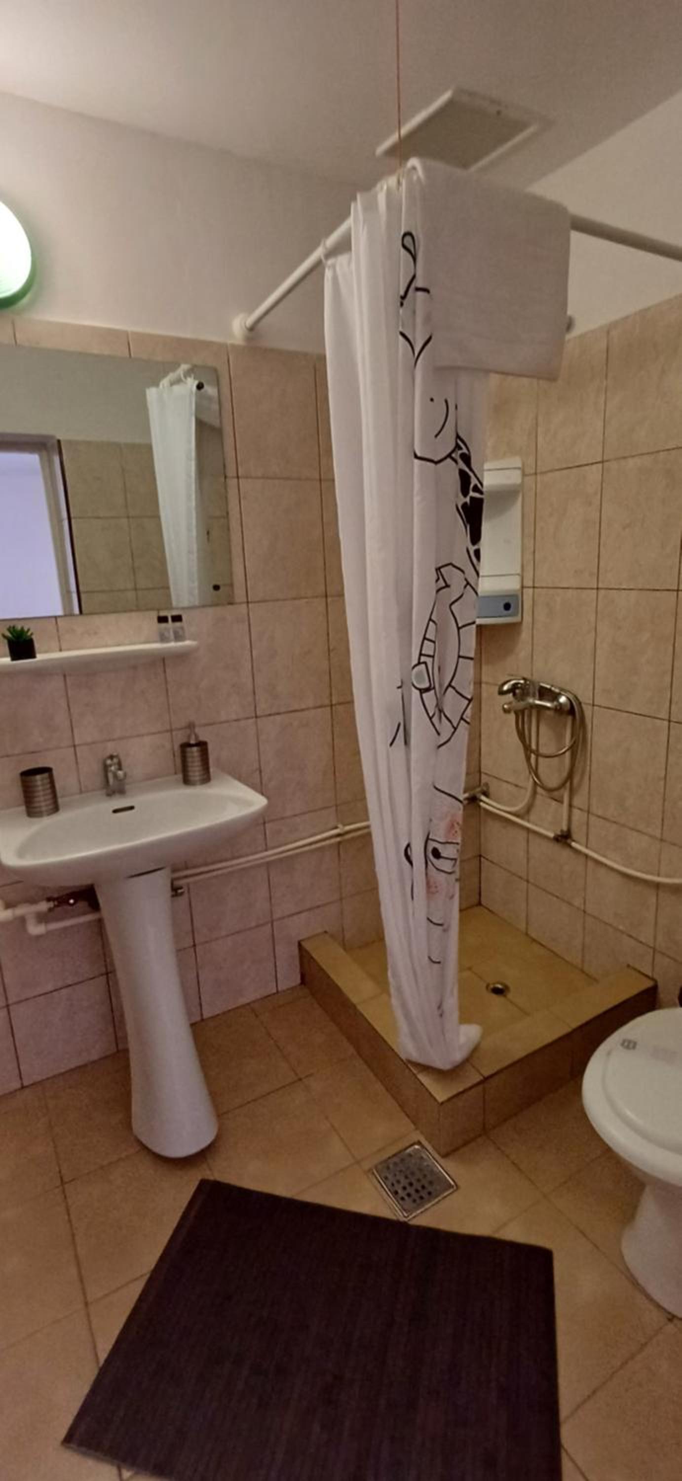 Camera mea a fost la etaj. Treptele care duc la etaj sunt foarte abrupte, aproape ca le urcam in 4 labe. Camera nu are geamuri spre exterior, iar baia are un geam minuscul, Probabil din acest motiv atat in camera cat si in baie exista un usor miros neplacut, de care este imposibil sa scapi. Camera are geam spre un hol unde dupa amiaza era o caldura insuportabila si multe muste (am omorat eu multe dintre ele). La chiuveta debitul apei era extrem de redus (un firicel).