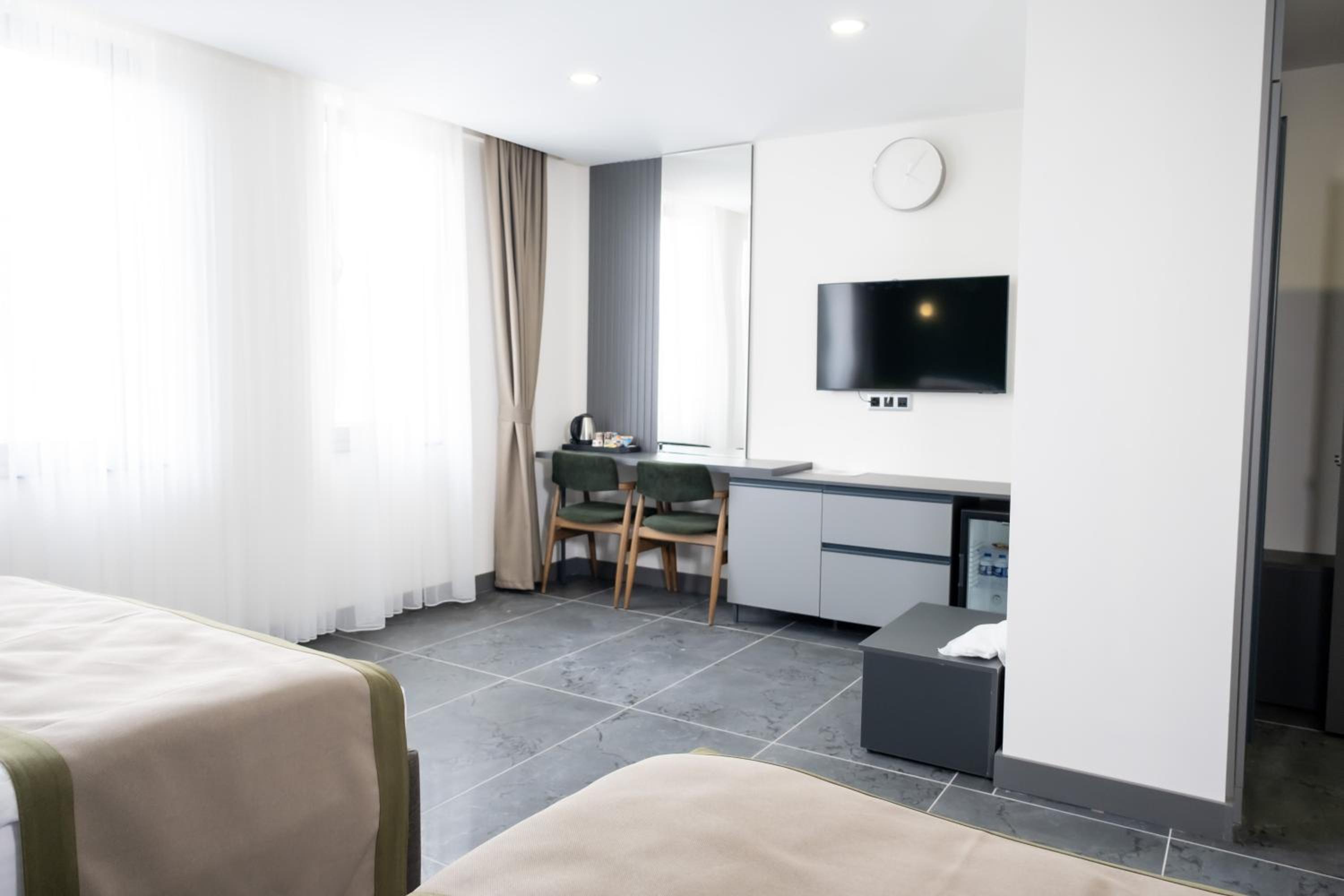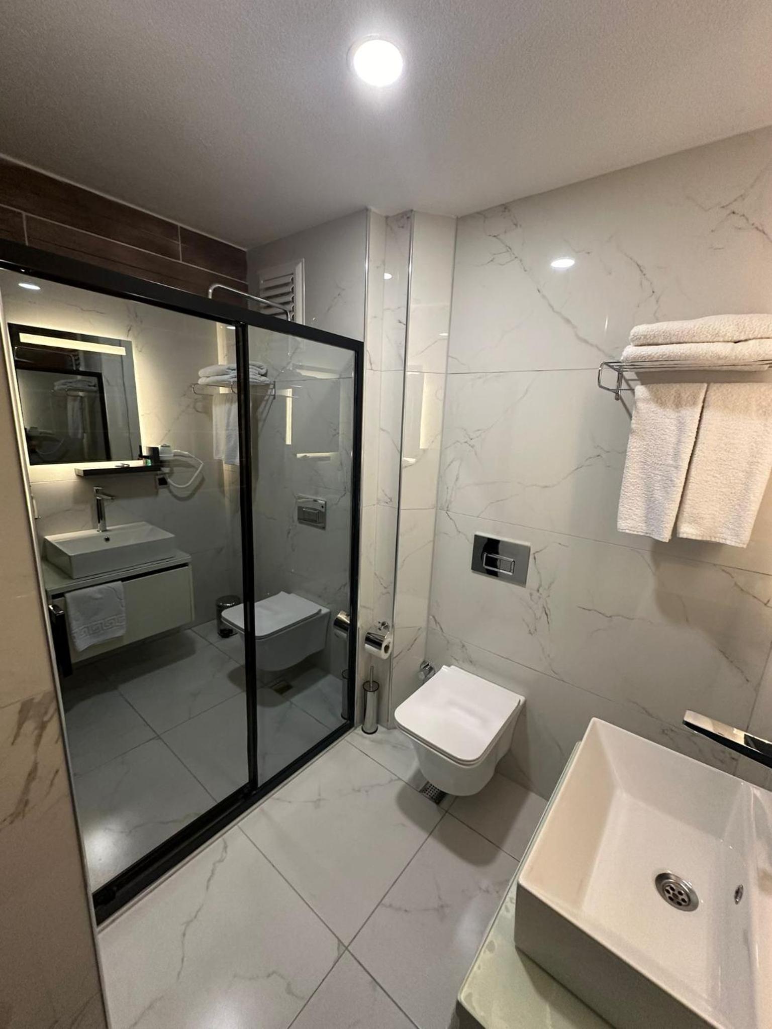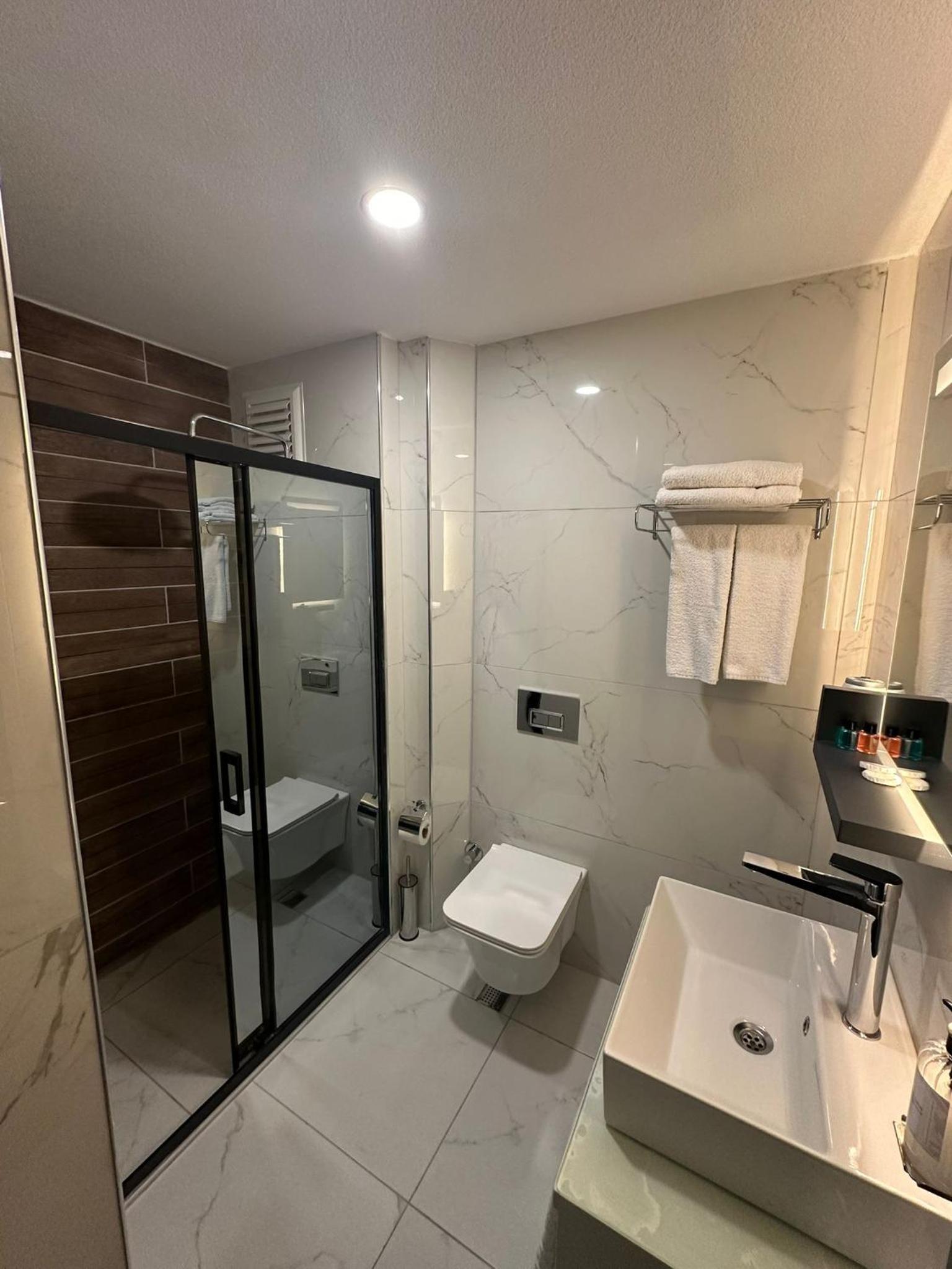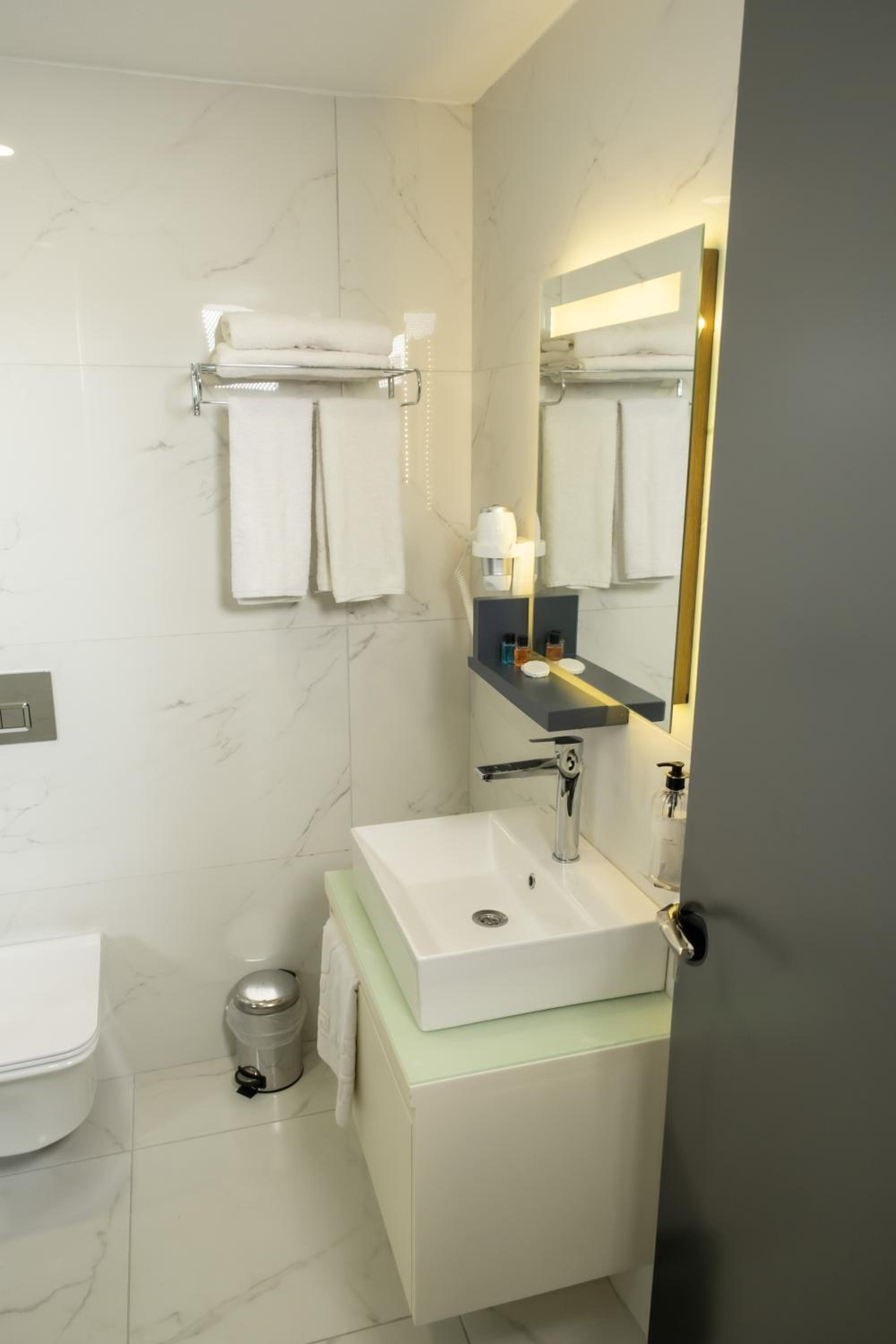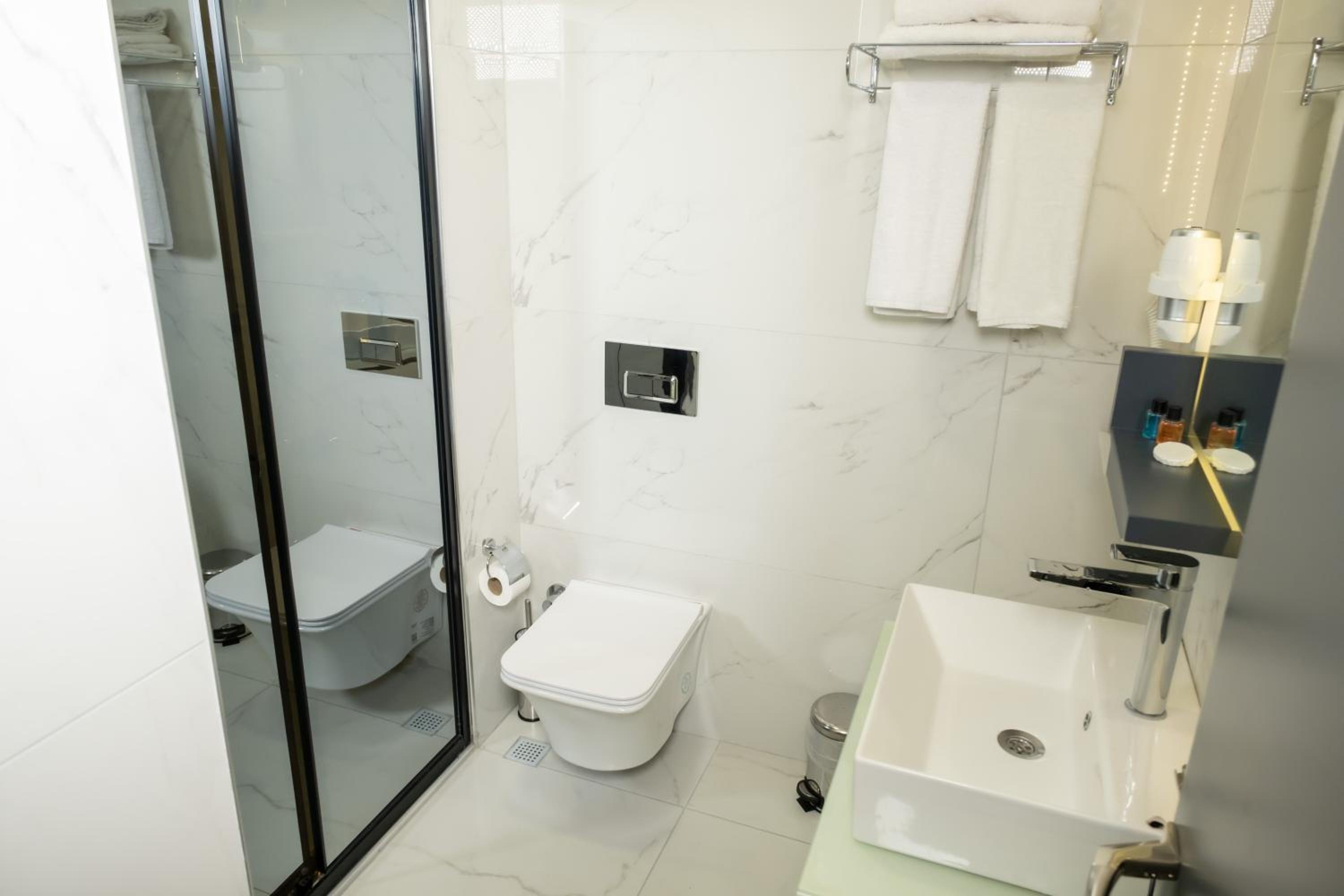 Experience comfort in the spacious rooms equipped with a flat-screen TV, soundproofing, and a walk-in shower. Bed linen, towels, and housekeeping service are provided for a relaxing stay.