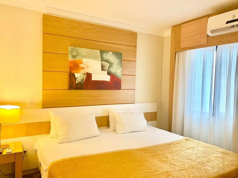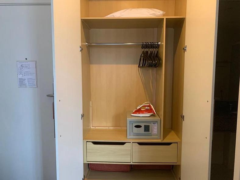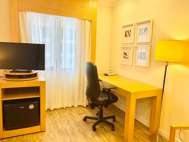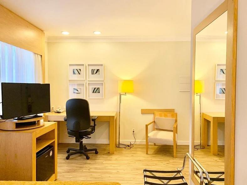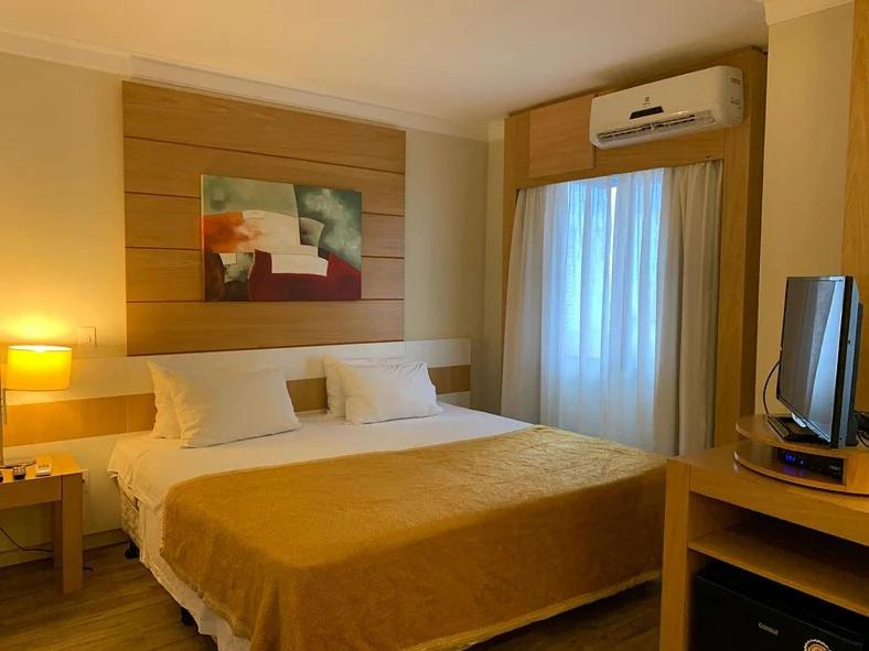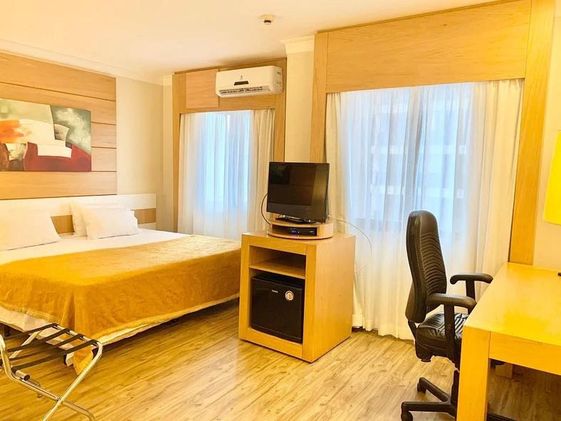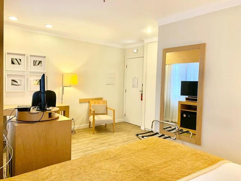 Gostei do ar condicionado que funcionava, por ser um hotel perto do aeroporto não tem barulho de avião, a acústica é boa, gostei da tábua de passar, ferro de passar, bom chuveiro, boa cama, boa mesa para trabalhar com cadeira giratória, água quente na torneira, papel higiênico e toalhas em massa disponível sem que precisássemos ficar pedindo, frigobar, microondas, cobertores, internet.