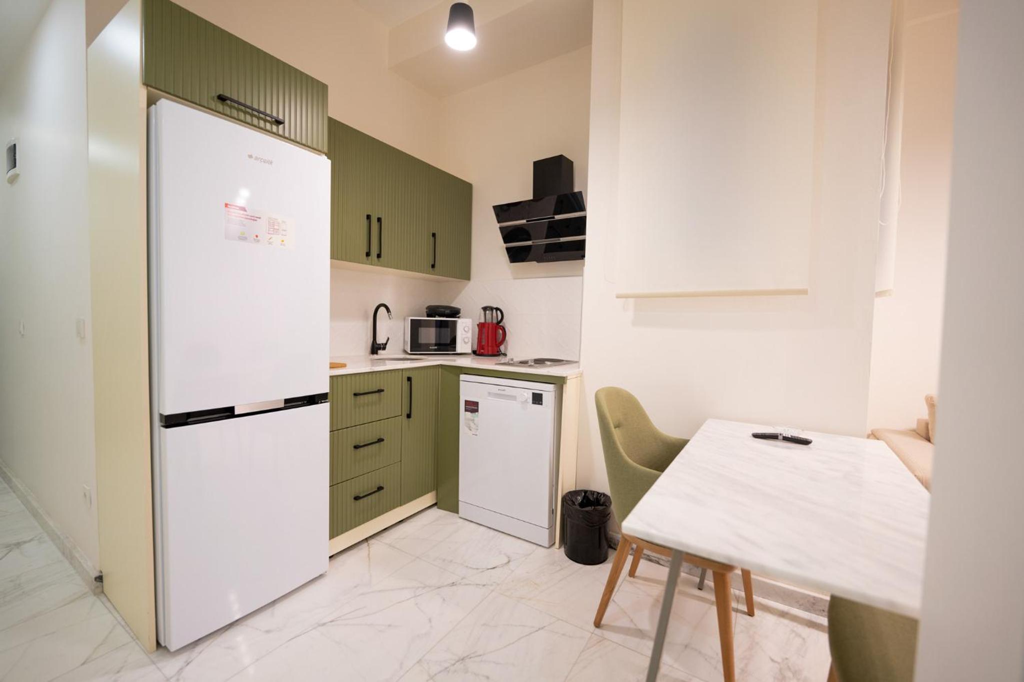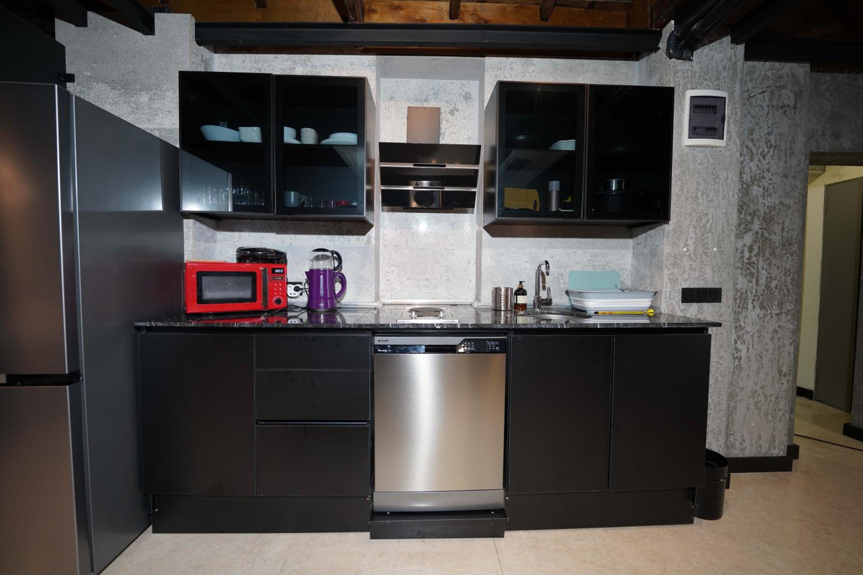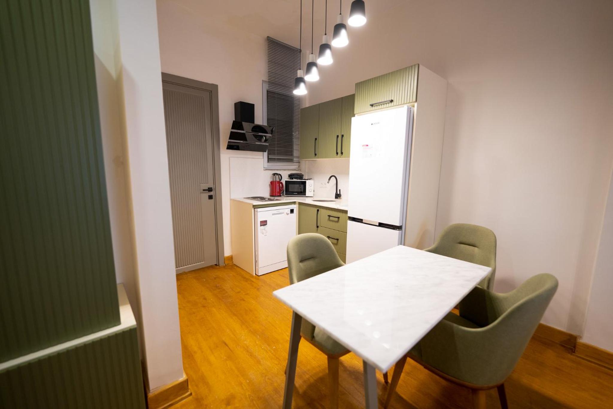 Really nice interiors in a historical building with all the amenities (shops, restaurants, metro and bus stations within a few meters). Water is very hot and the kitchen was equipped with everything you may need for a longer stay! Everything was very clean and bed was comfortable.