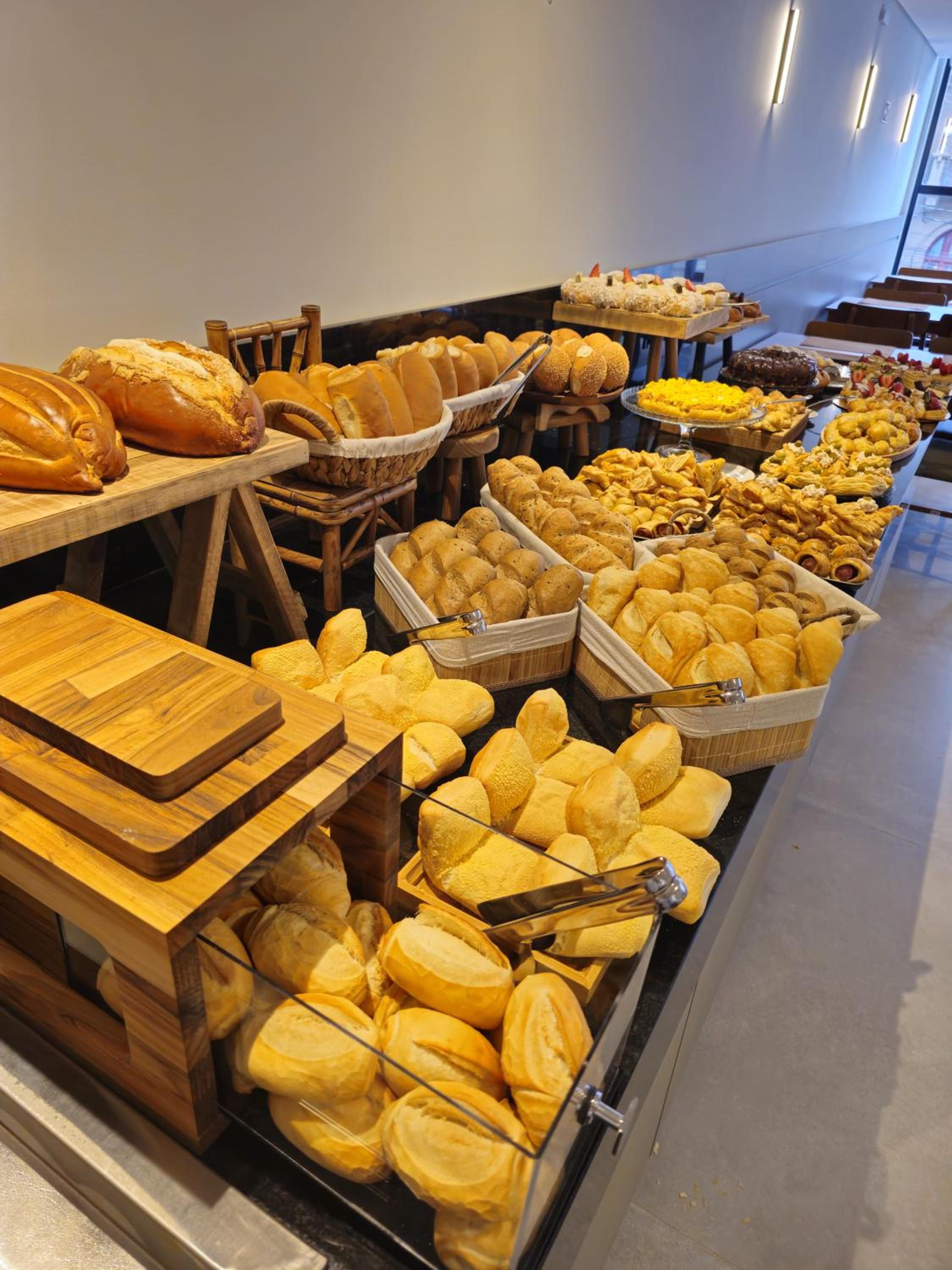 Café da manhã muito bom com variedade de frutas, pães e outro quitutes.