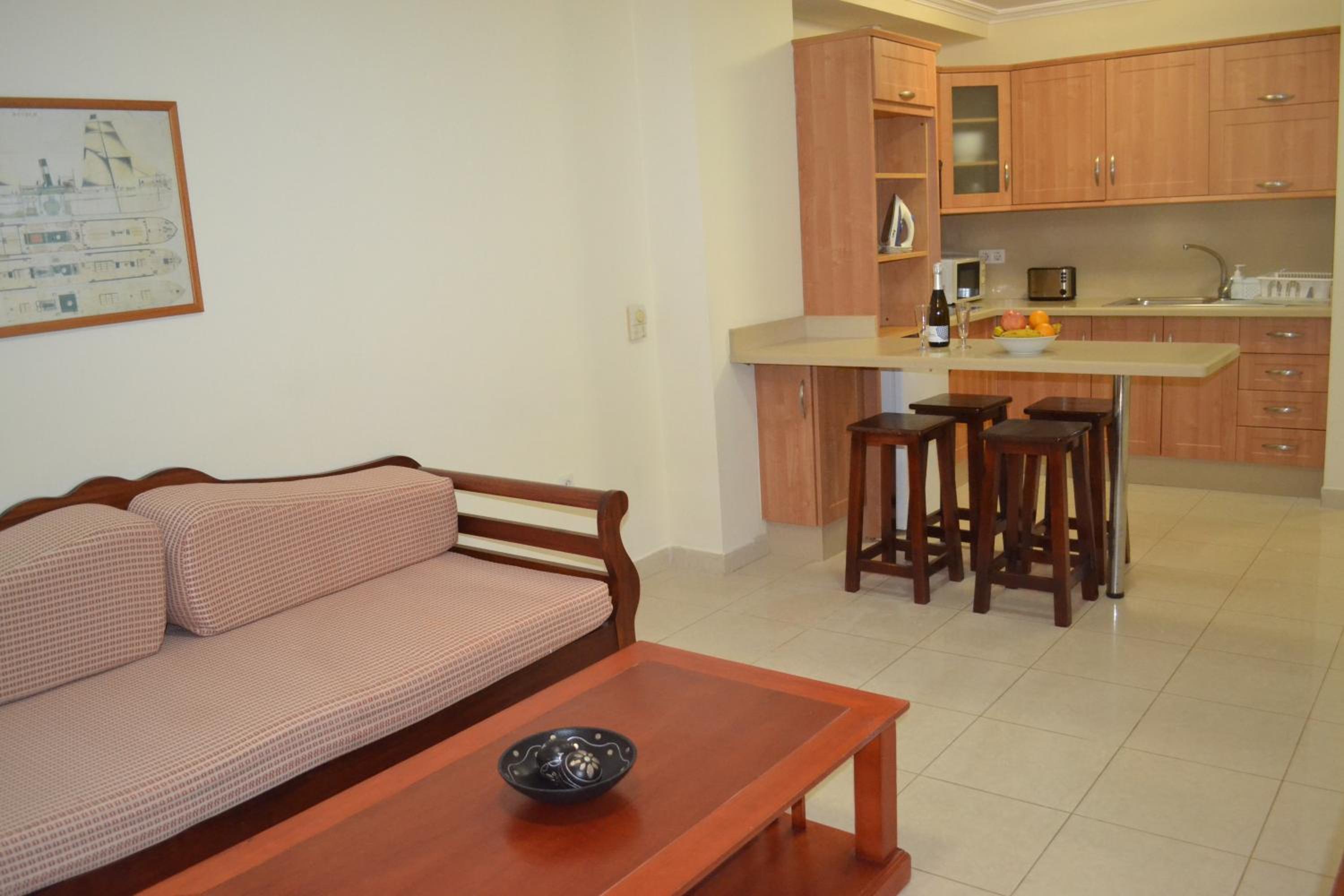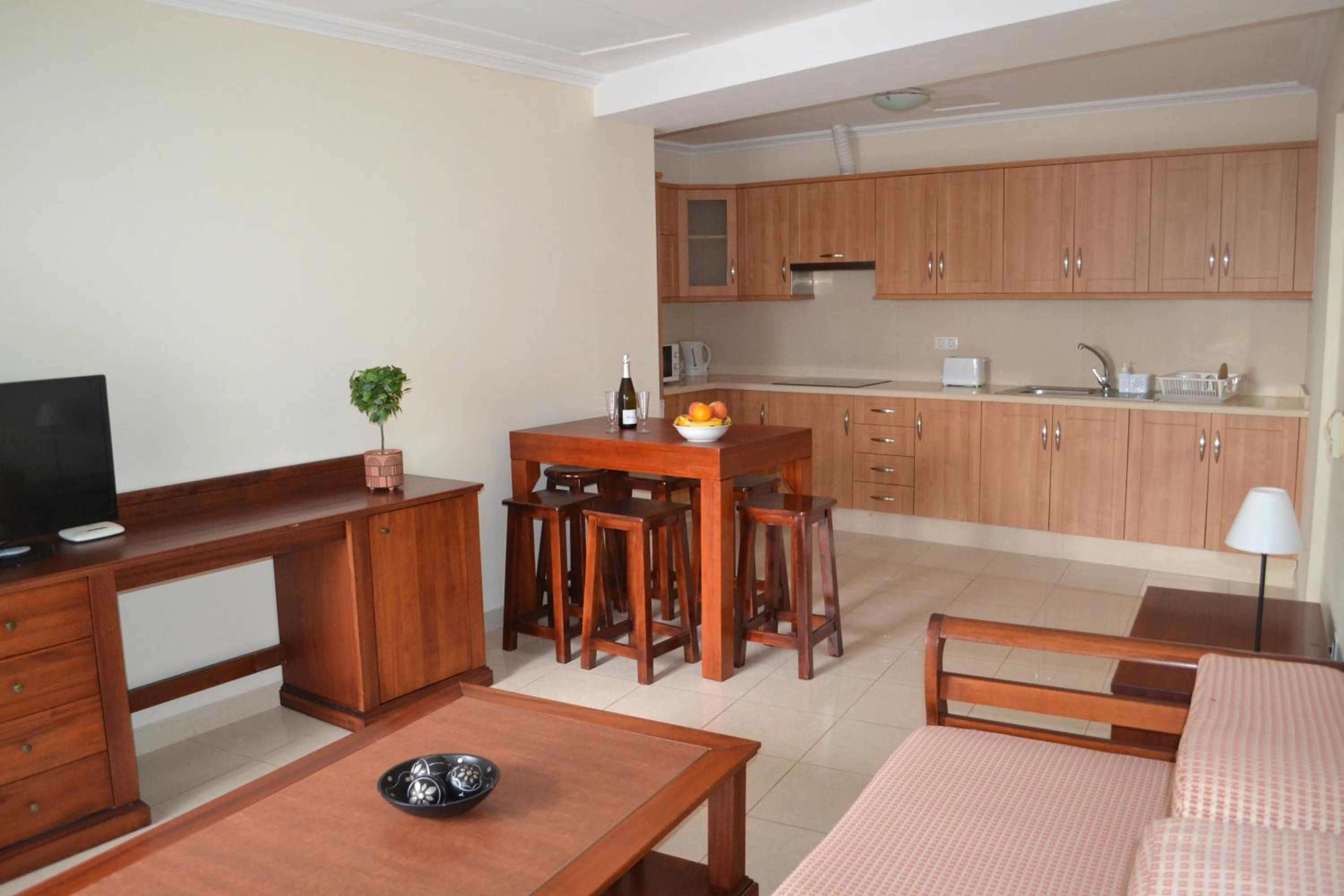 Fully Equipped Apartments for Comfort: Each unit features a terrace, fully equipped kitchen, dining and seating area with a flat-screen TV. The private bathroom includes a bidet and hair dryer for your convenience.