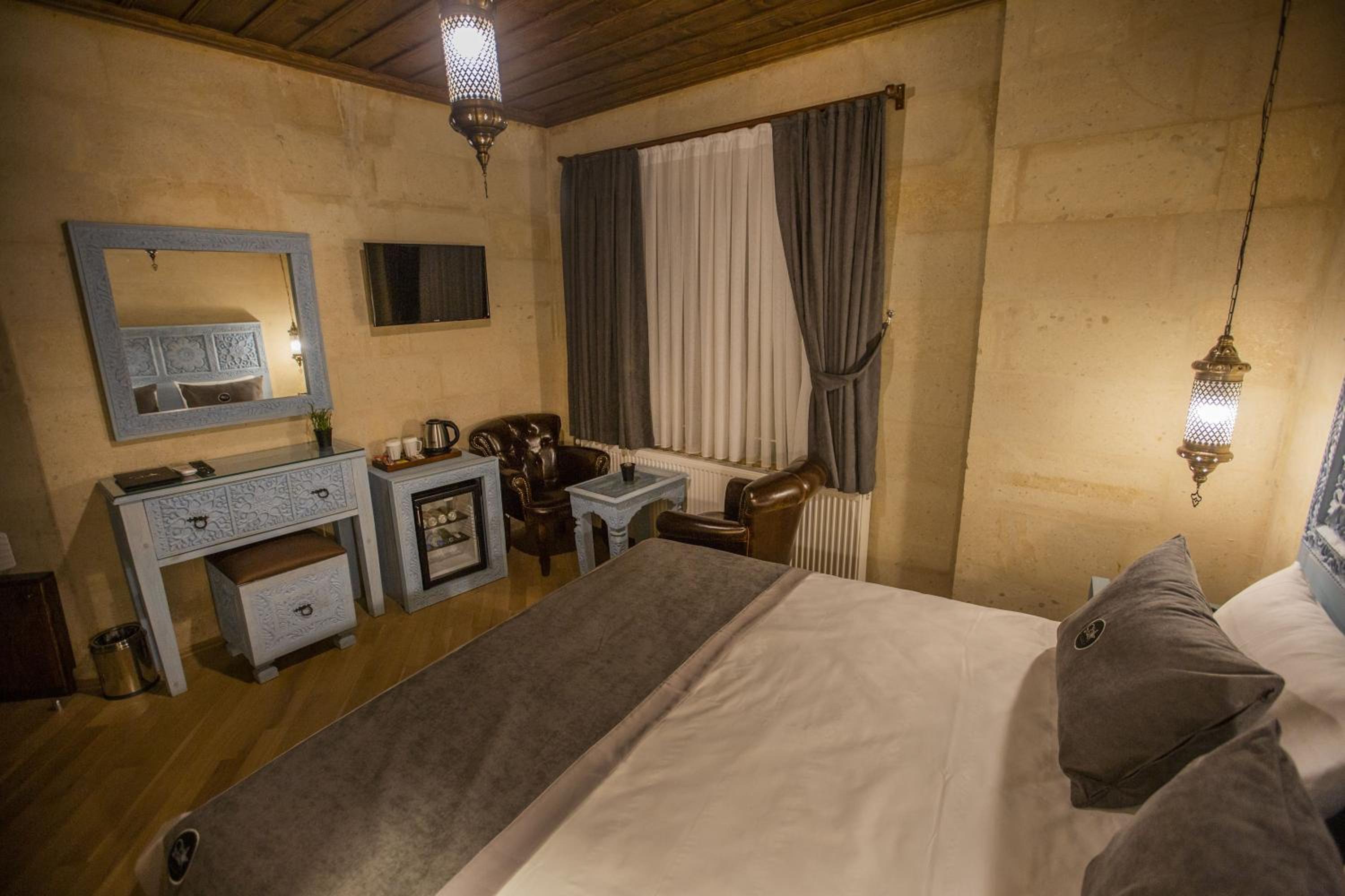 Sinasos Star Hotel in Urgup offers elegant non-smoking rooms with modern amenities including free WiFi, flat-screen TVs, and private bathrooms. Some rooms even feature balconies or patios with garden views, ensuring a comfortable stay for all guests.
