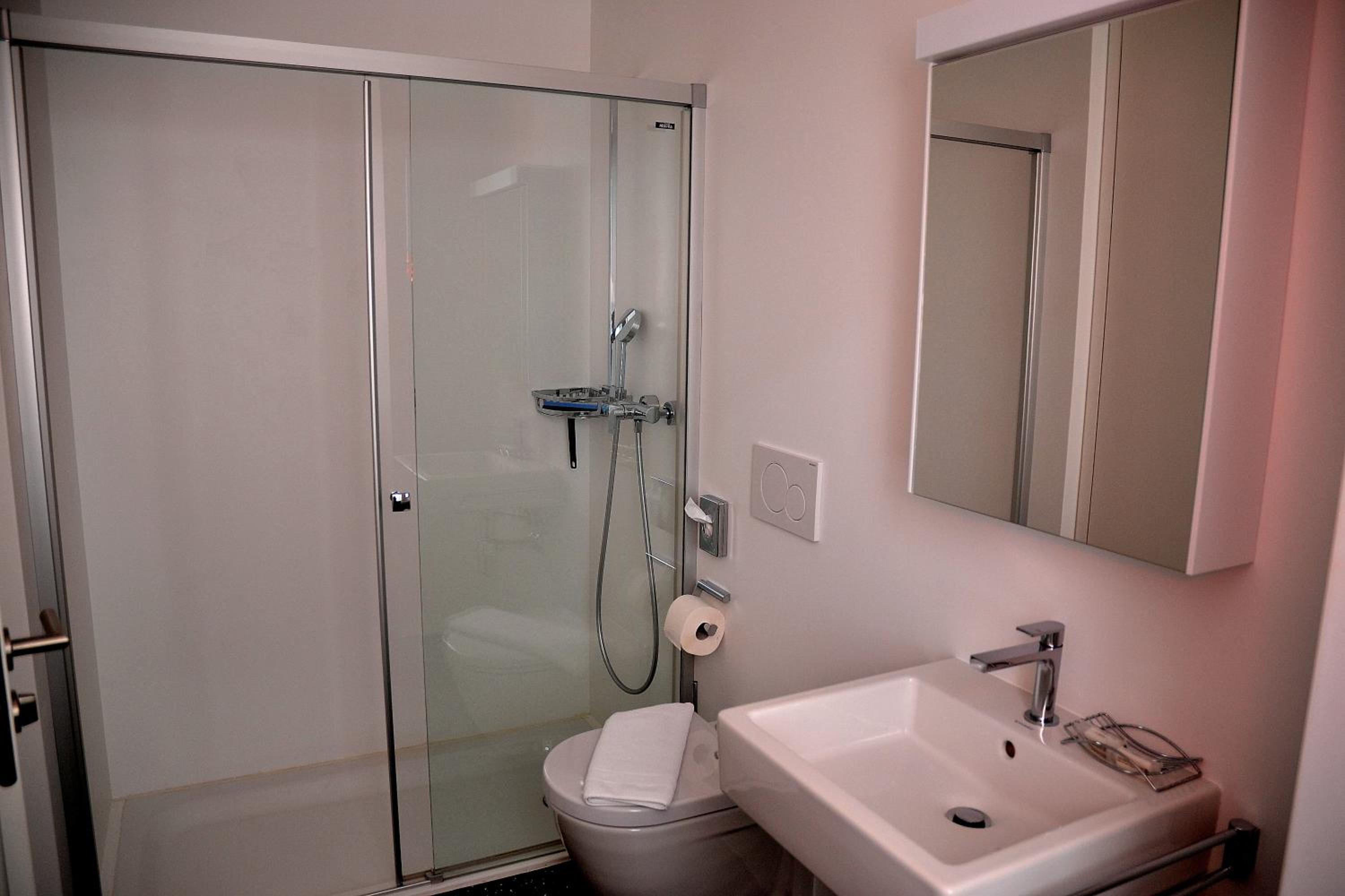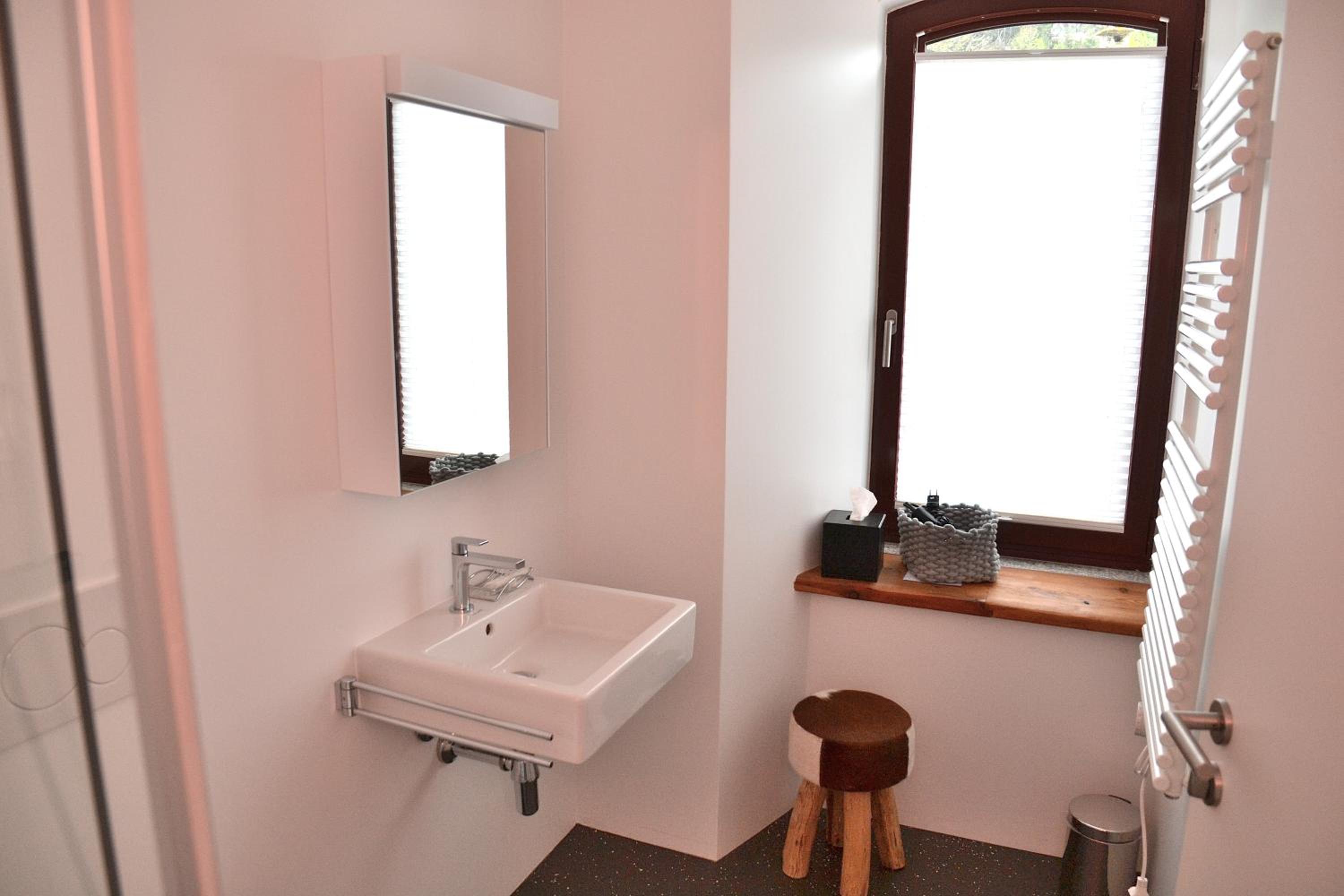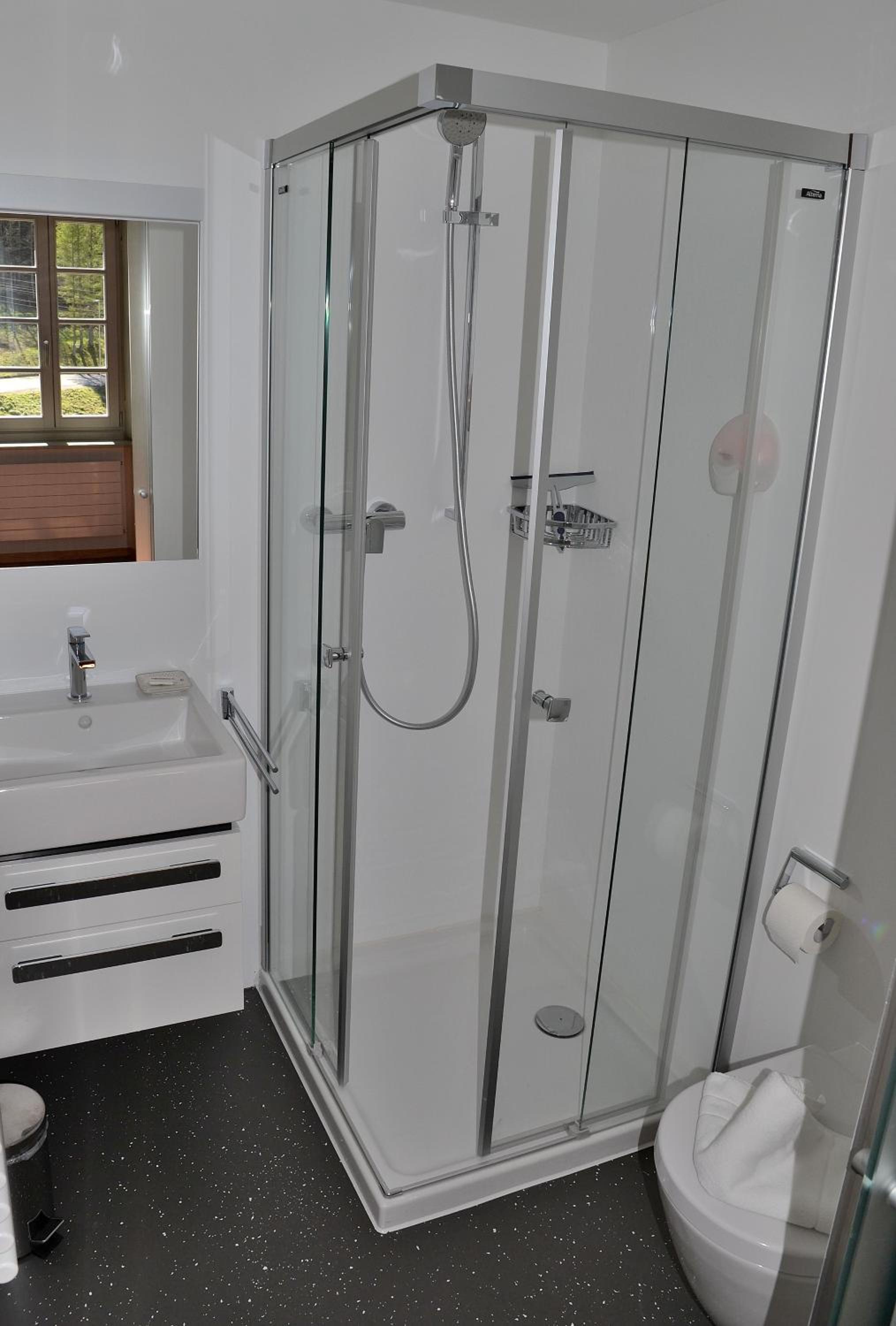 Sehr modernes, renoviertes Zimmer. Schöne Möbel. Modernes Badezimmer mit flacher Dusche.