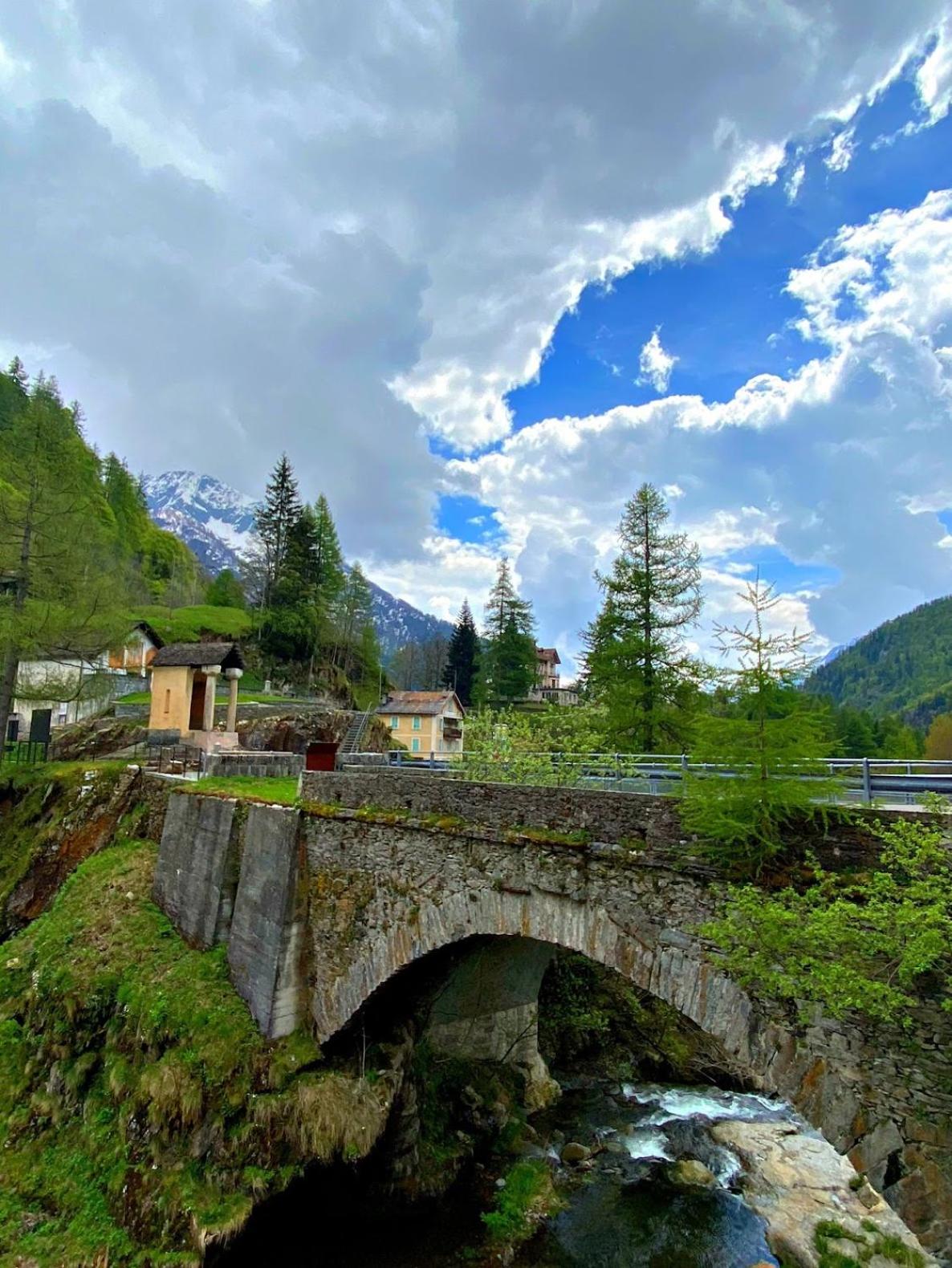 Magnifique emplacement à l’entrée du village, pont sur la Maggia et possibilité de baignade dans la rivière .