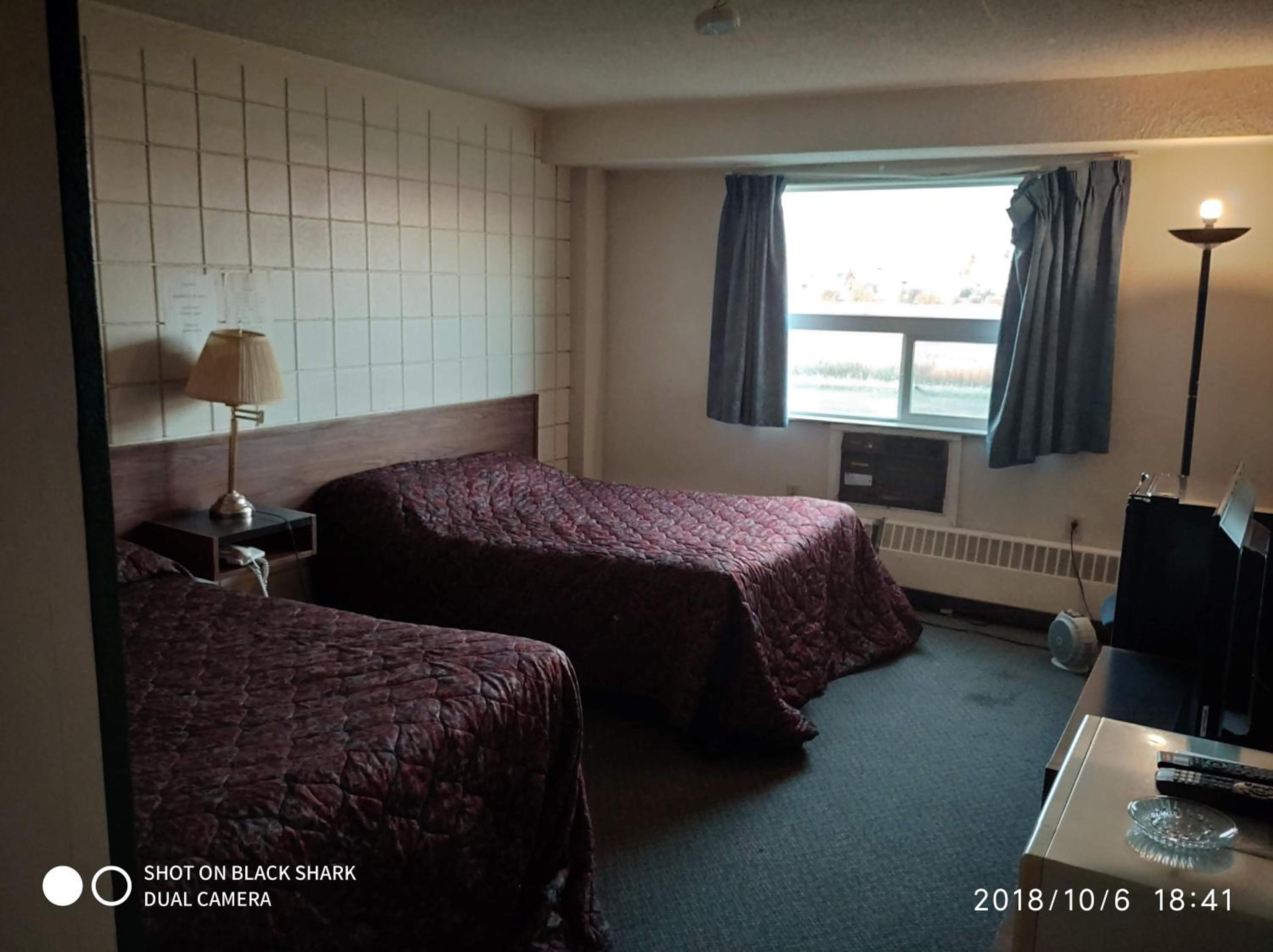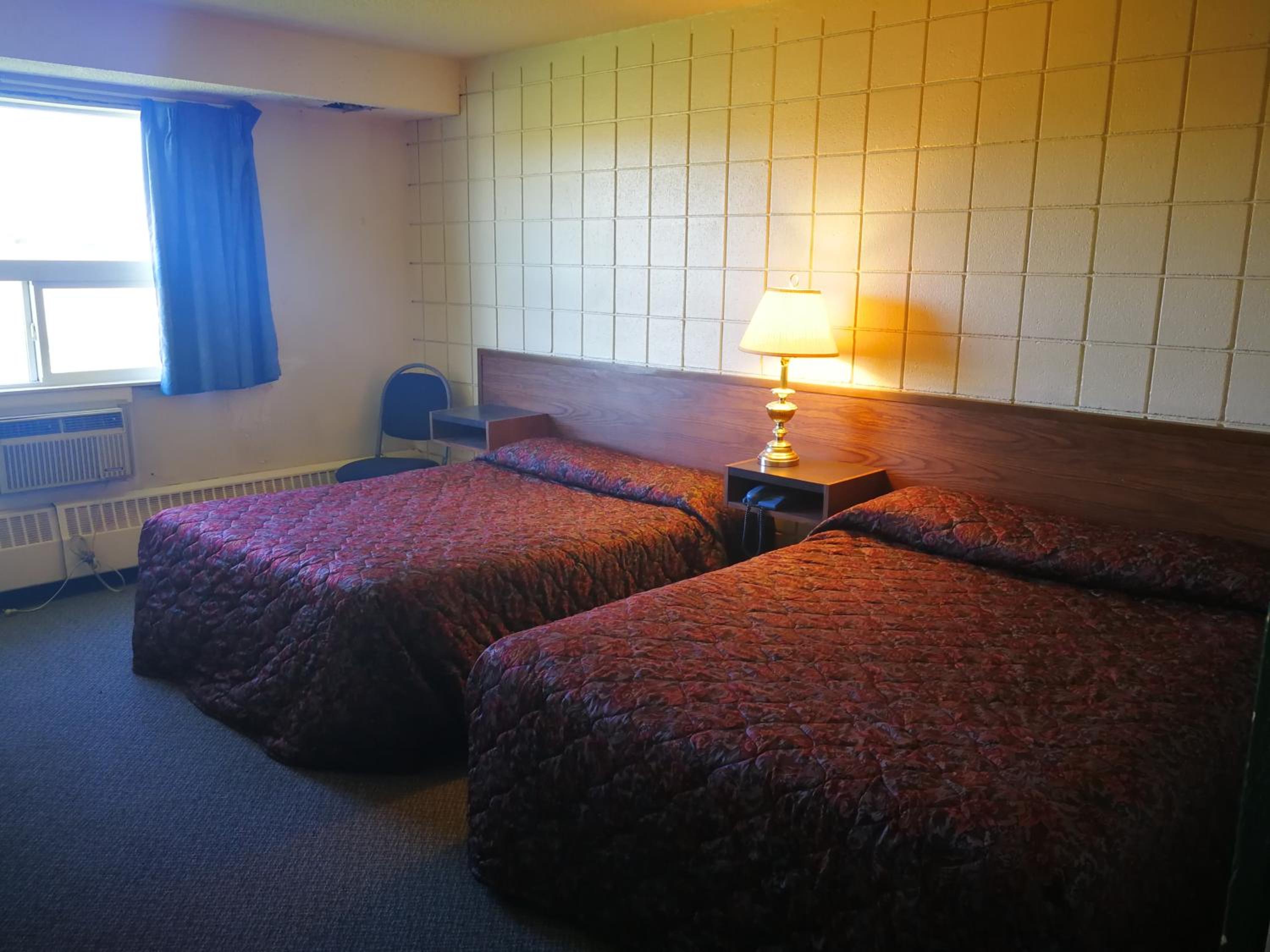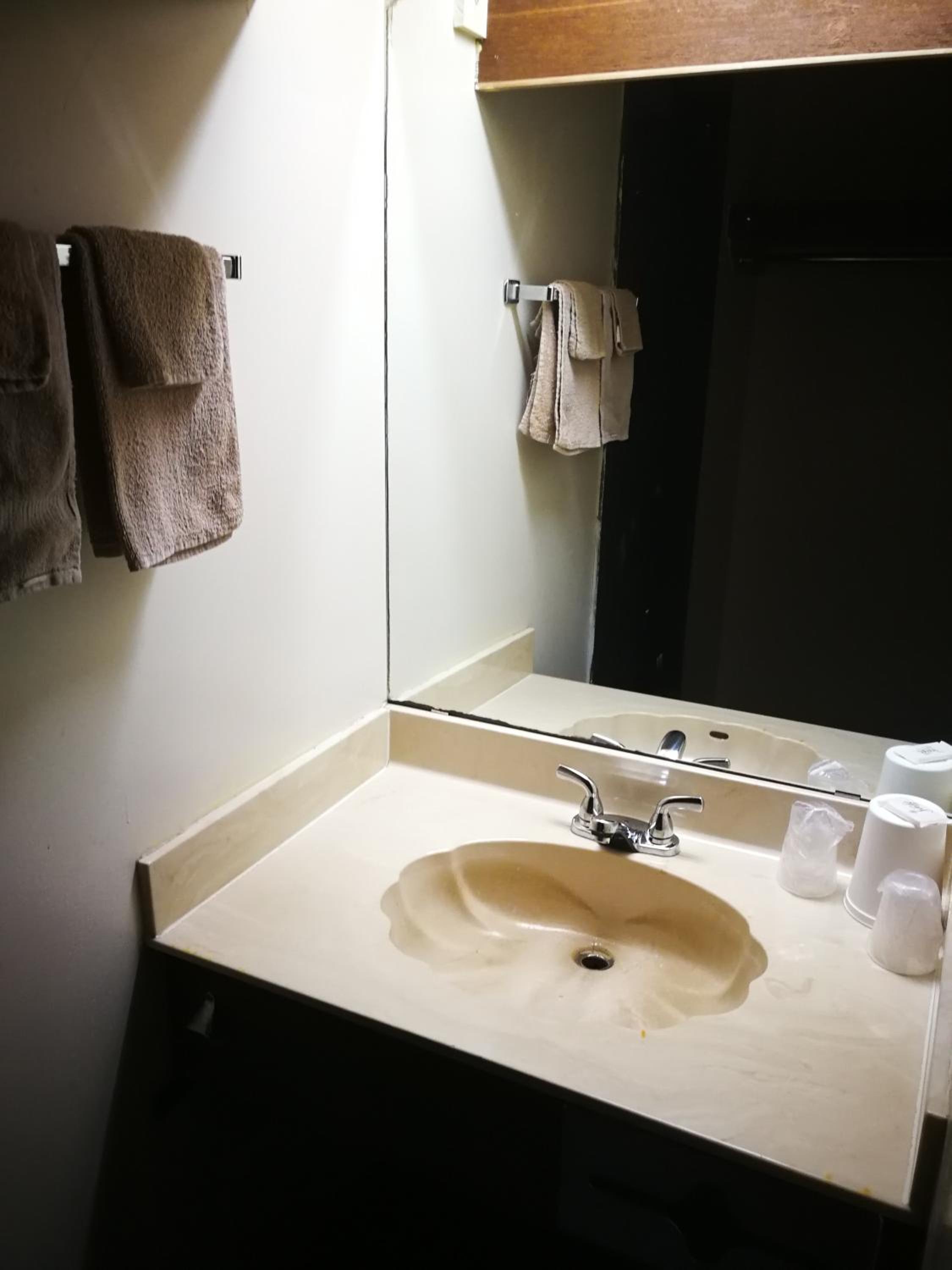 We checked in to a room that looked like someone peed on the wall. There was a drill bit lating on one bed that was broken on one corner. We were given another room that was 'cleaner' but had water damage and stains in yhe bathroom from above .