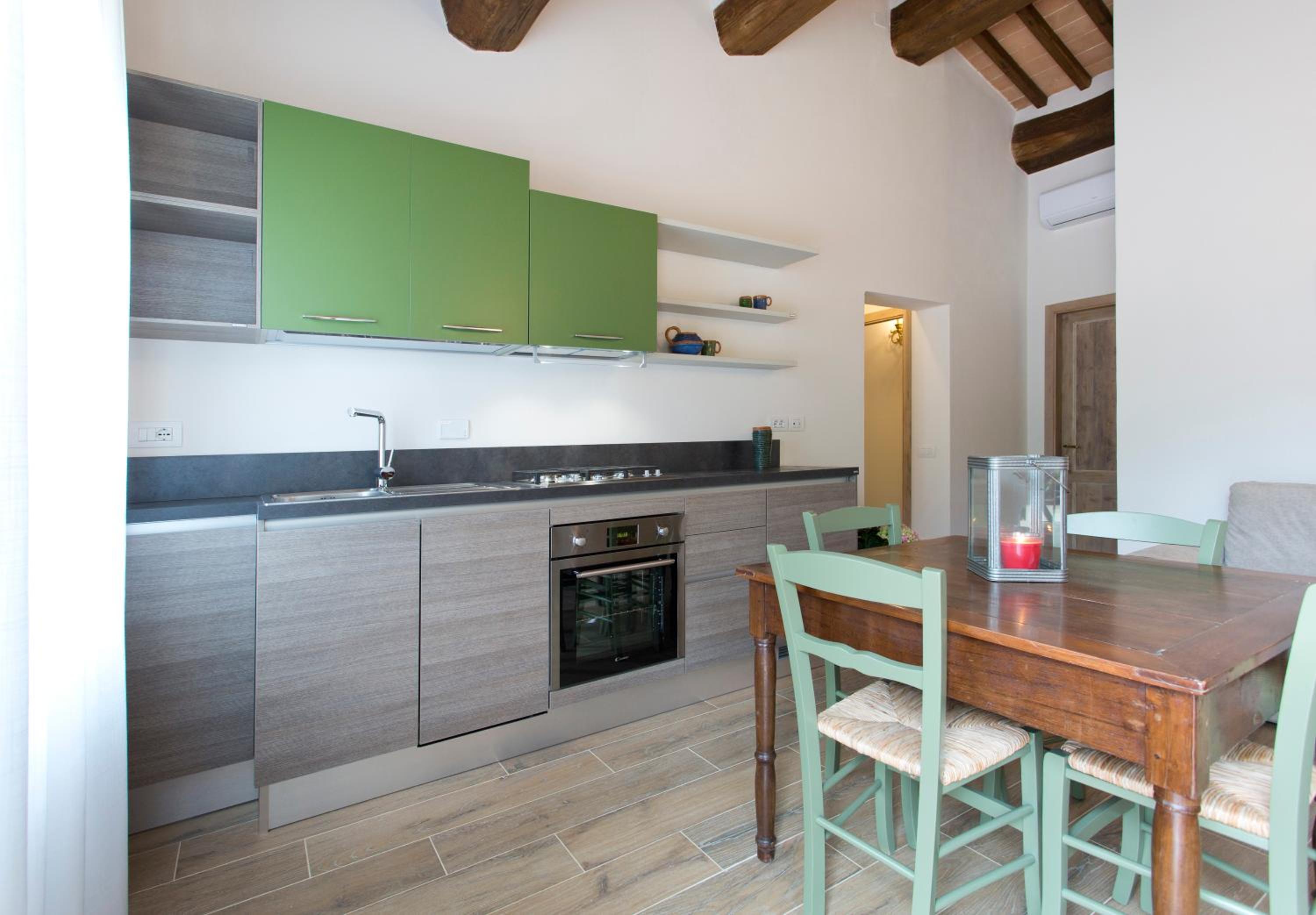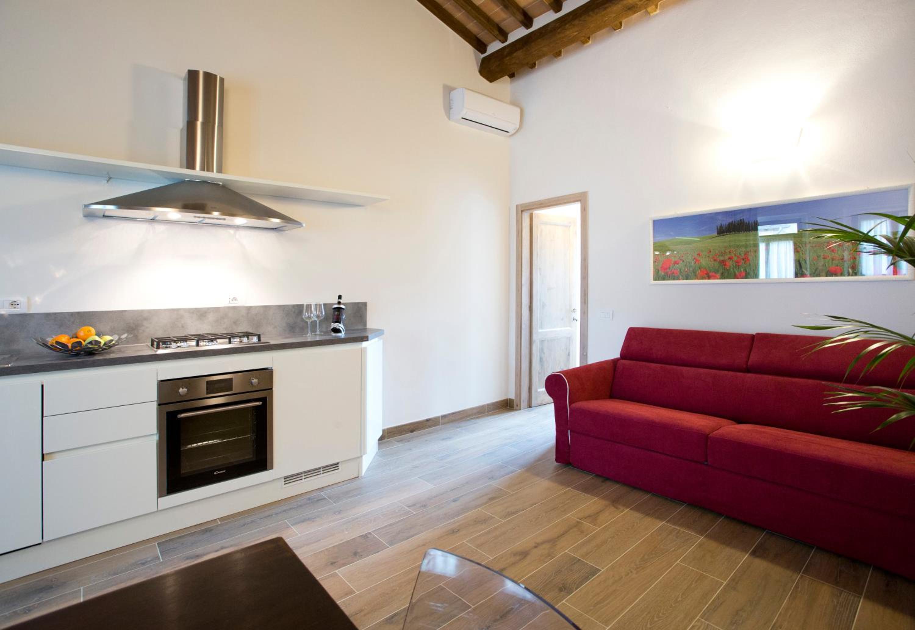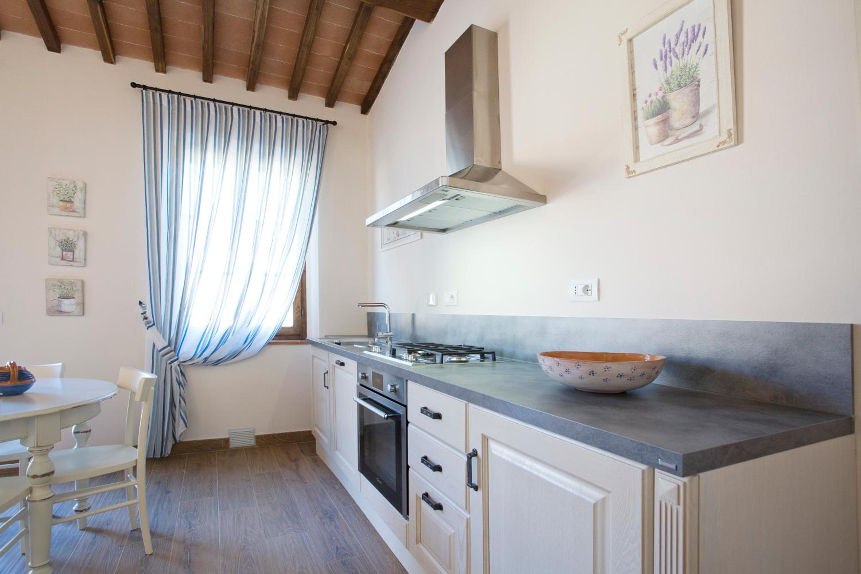 Casale San Galgano offers elegant units with modern amenities including flat-screen TVs, fully equipped kitchens, and private bathrooms. Some units even boast balconies with stunning lake views, perfect for a relaxing stay.
