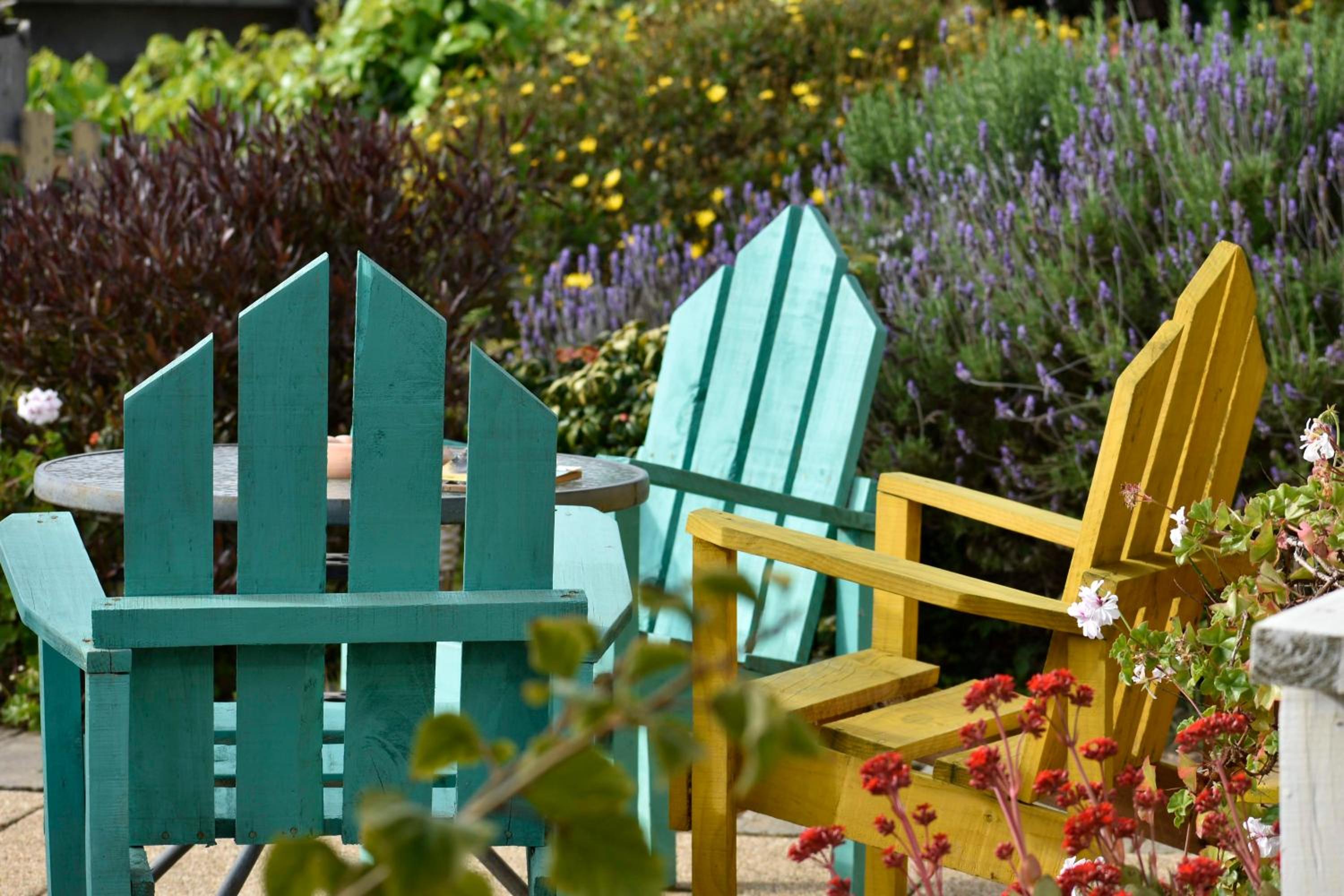 Guests can enjoy well-appointed rooms with modern amenities such as flat-screen TVs, private bathrooms, and garden-view patios for a relaxing stay.