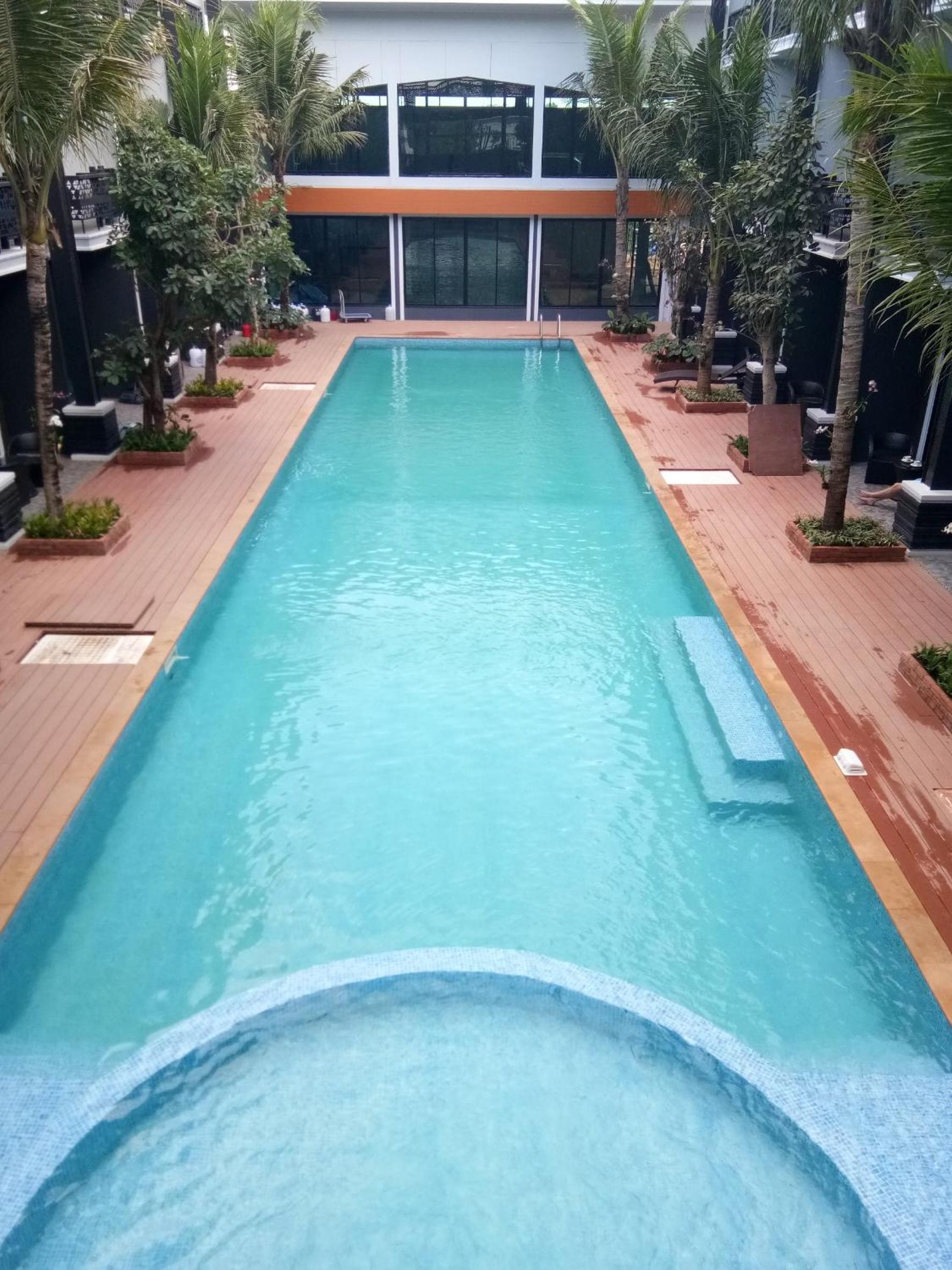 Der Pool hat keine Möglichkeiten wie Sessel oder Liegen, man kann nur hineinhüpfen und wieder gehen. Voll unter Beobachtung der seitlich angeordneten Zimmer.