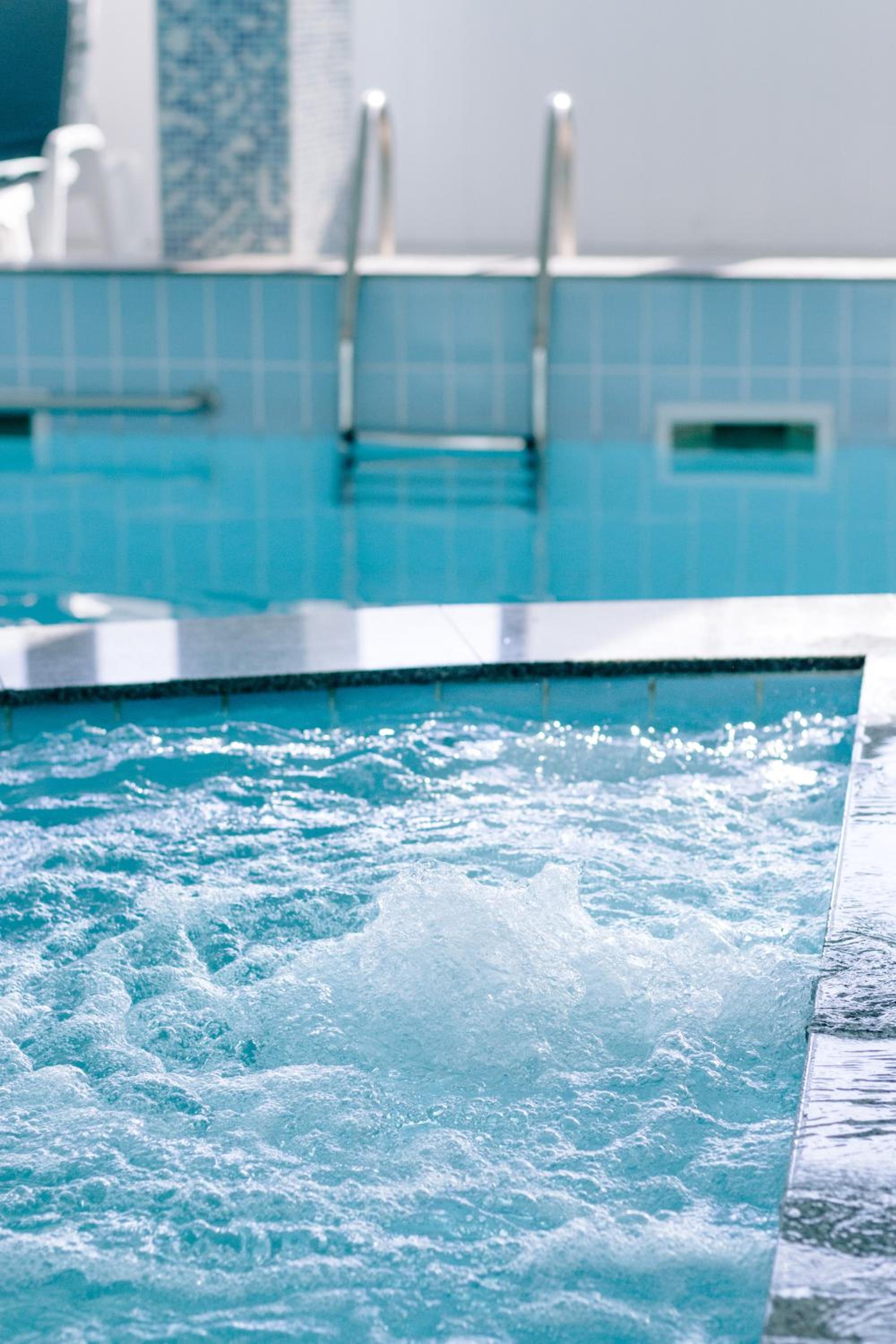 Студената вода в басейна и джакусито. Няма парапети на стълбите за удобство и безопасност.