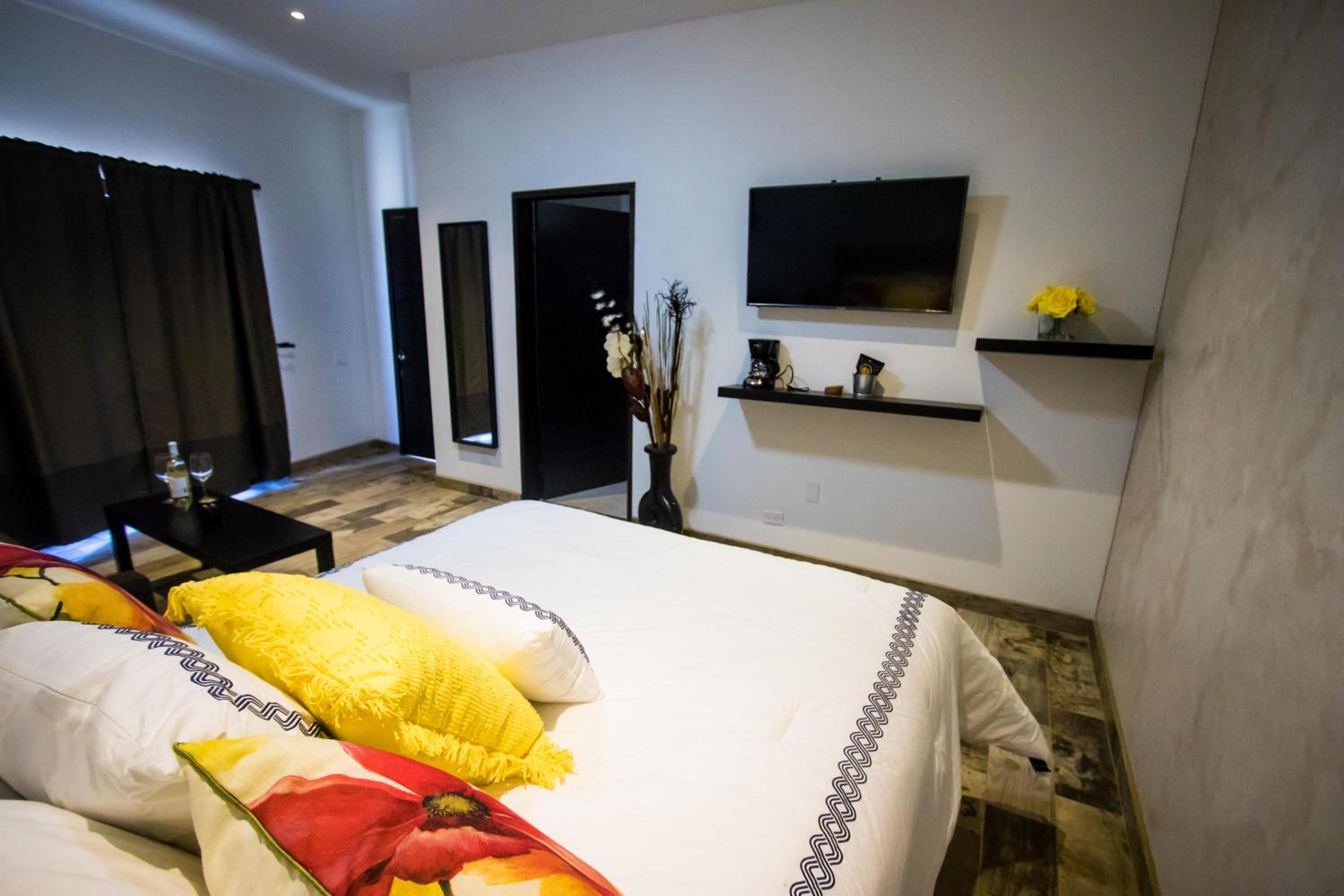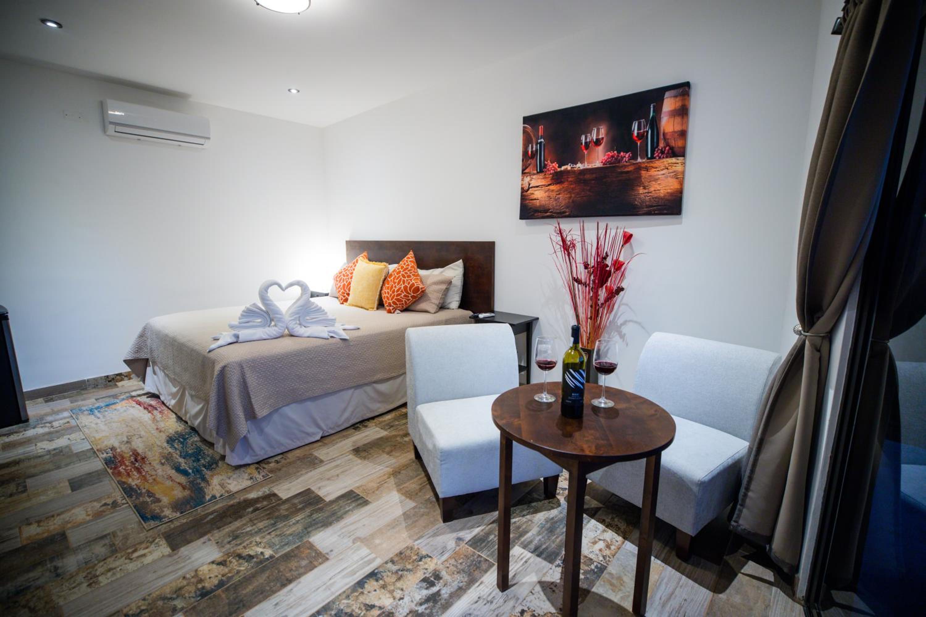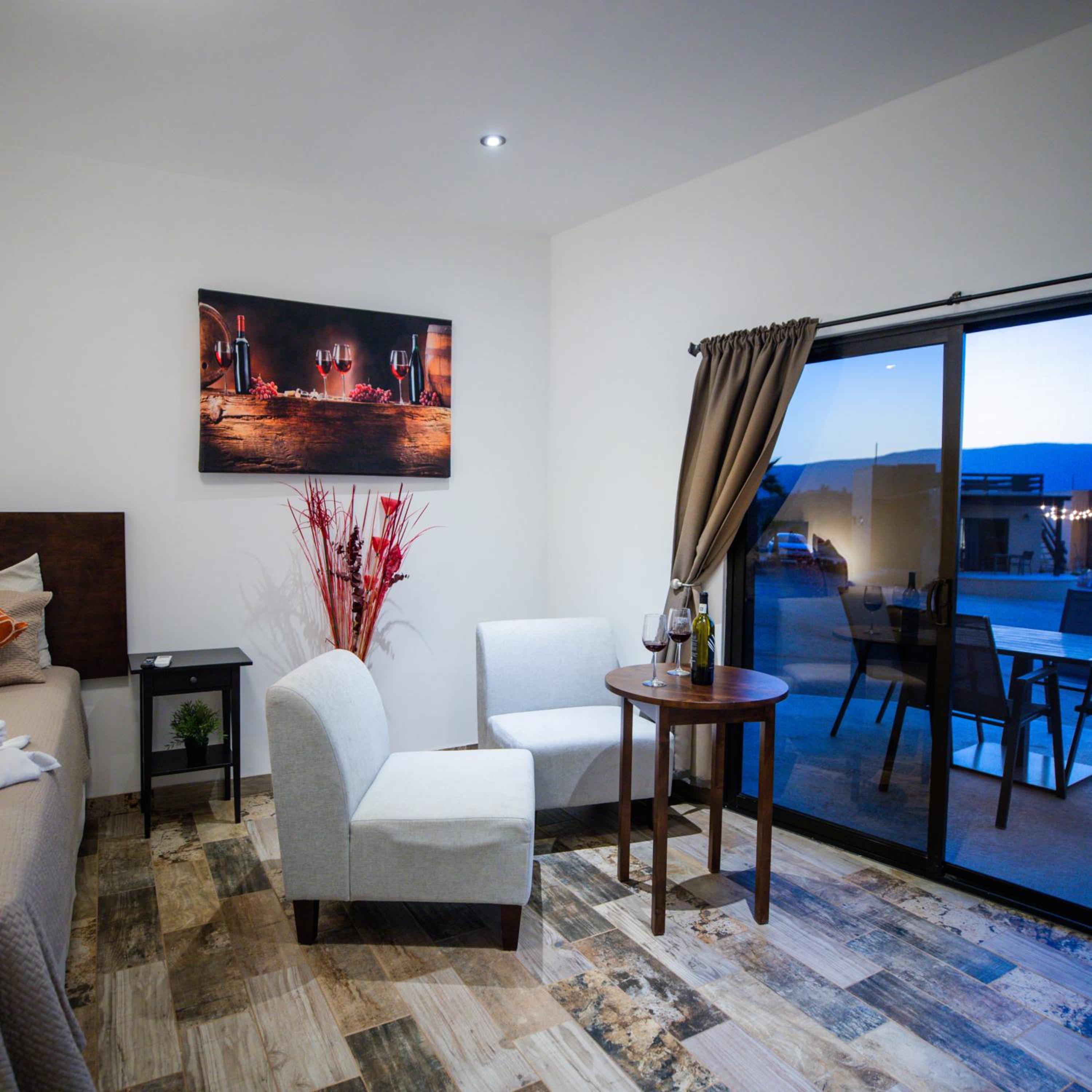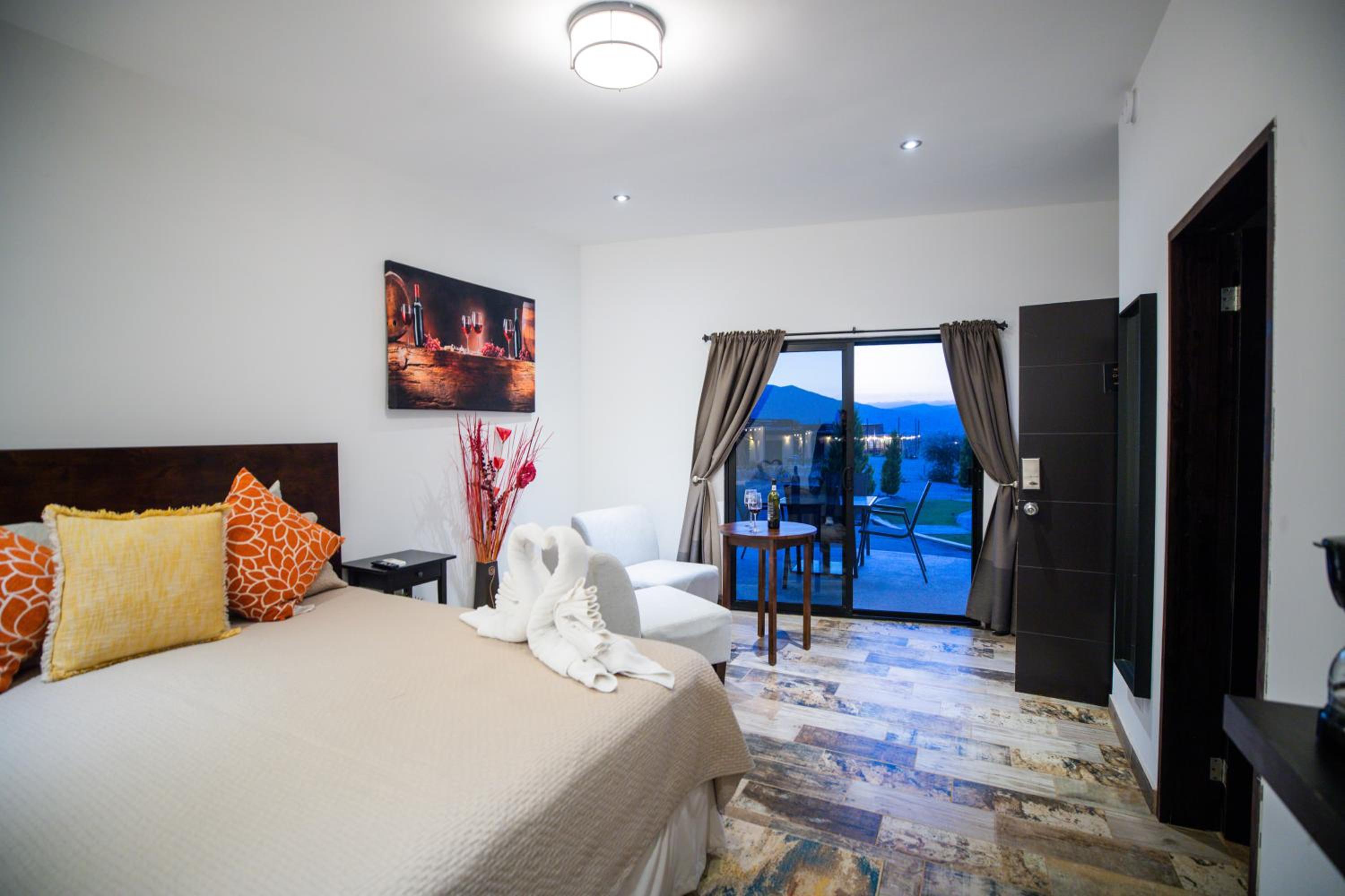 Cuatro Lunas Hotel Boutique in Valle de Guadalupe offers elegantly designed rooms with modern amenities including air conditioning, flat-screen TVs, and private terraces with stunning mountain views. Guests can unwind in comfort with plush bedding and a fridge in each room.