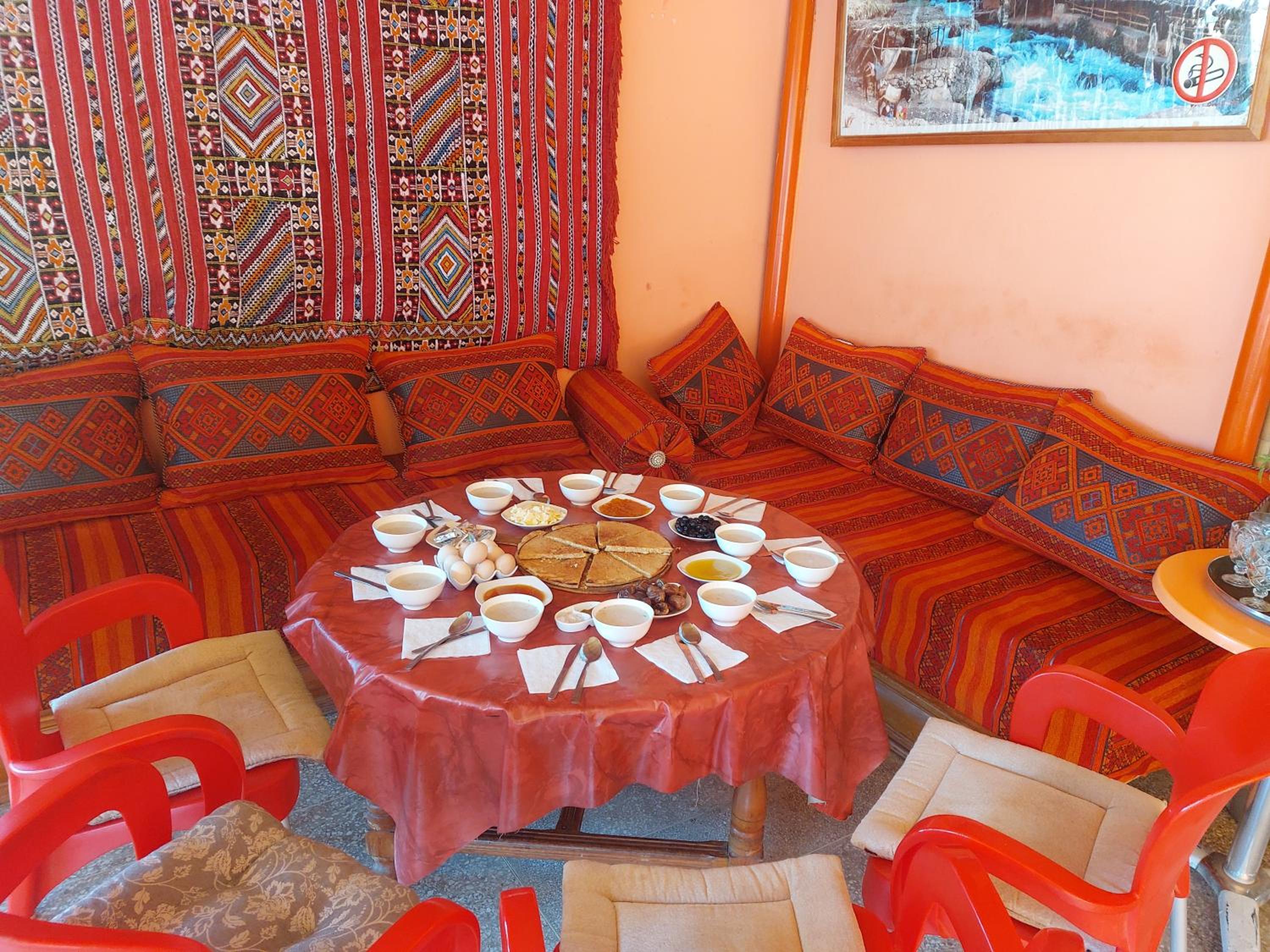 Mi è piaciuta moltissimo la colazione, favolosa, tutto fresco, con datteri e burro di arachidi fatto in casa. Anche la tajina che abbiamo mangiato per cena era molto buona. La stanza era confortevole e riscaldata. La vista dalla terrazza che da sulle cascate spettacolare. Consiglio vivamente questa tappa a chiunque passi di lì. Il proprietario è stato anche così gentile da accompagnarci a vedere le cascate dopo colazione.
