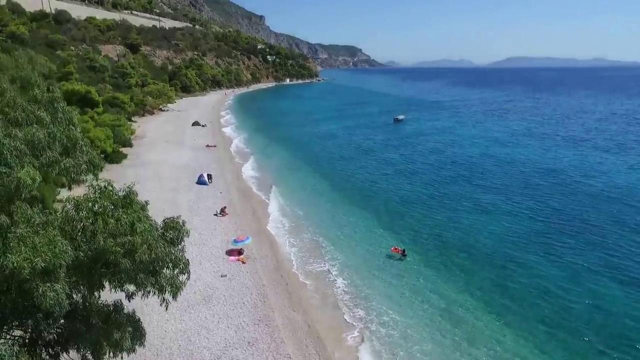 Heerlijk direct aan het (kiezel) strand. Gratis strandbedjes. Een beach bar om wat te eten en drinken.