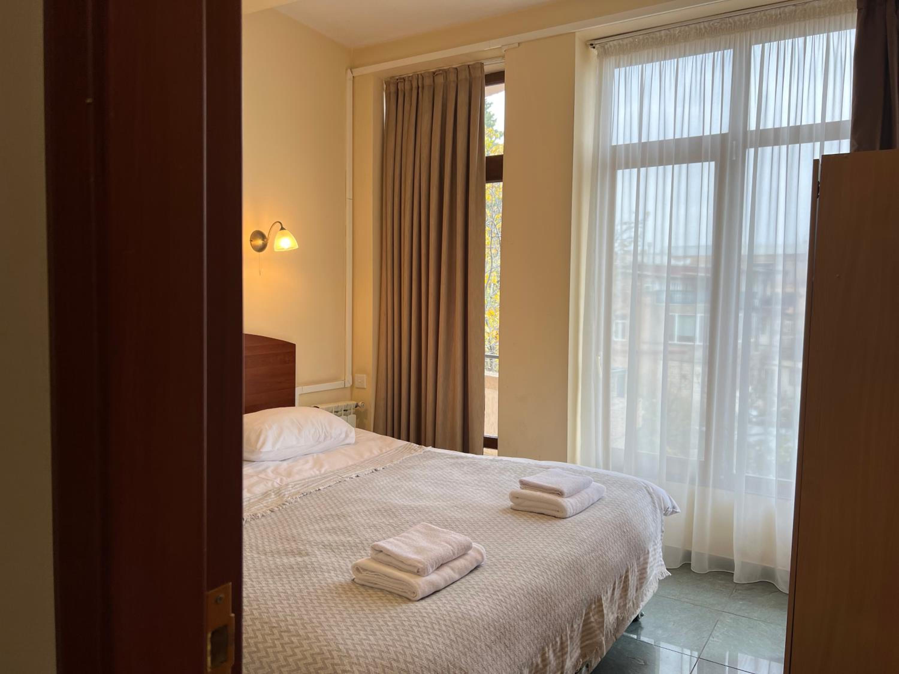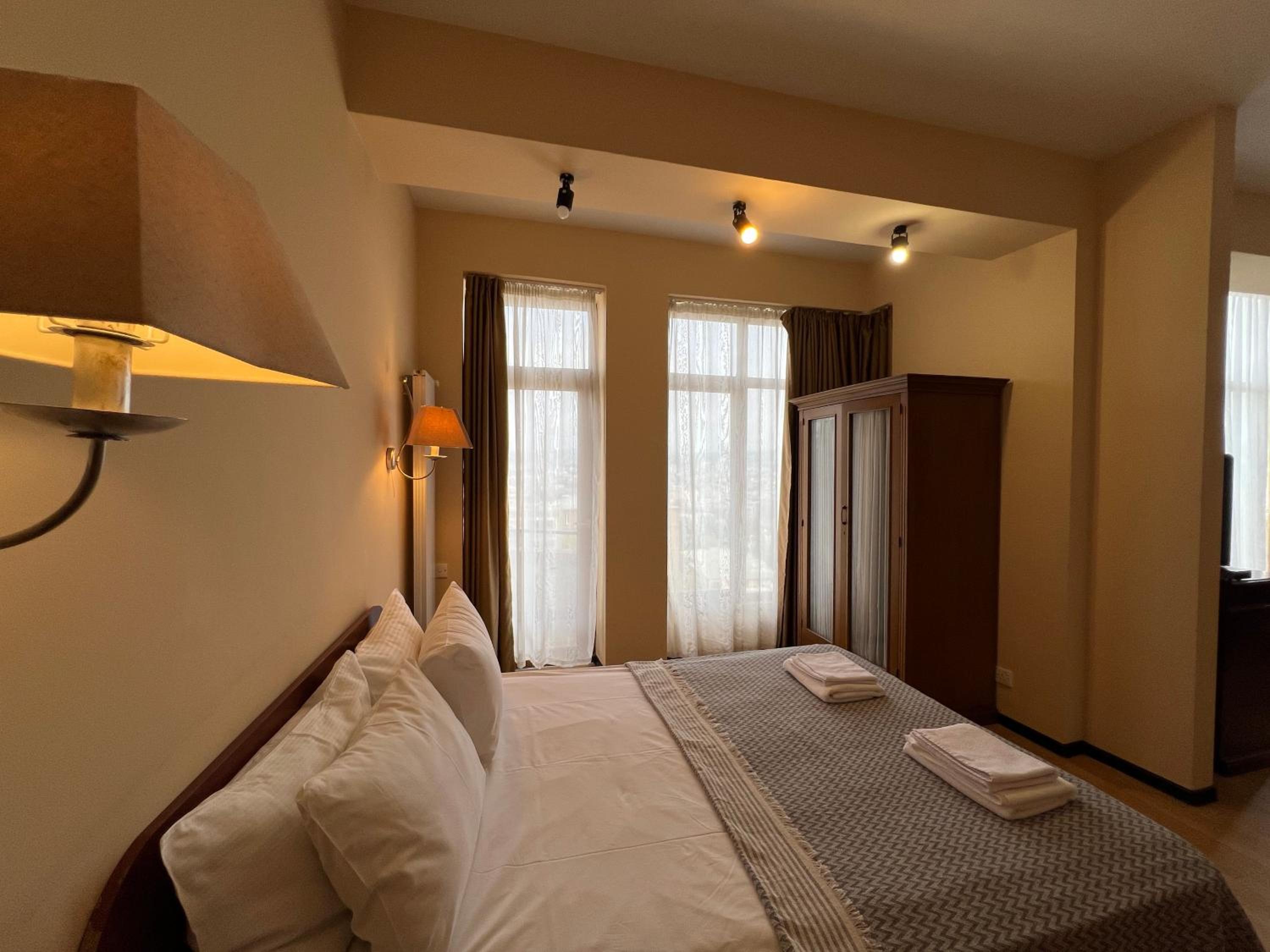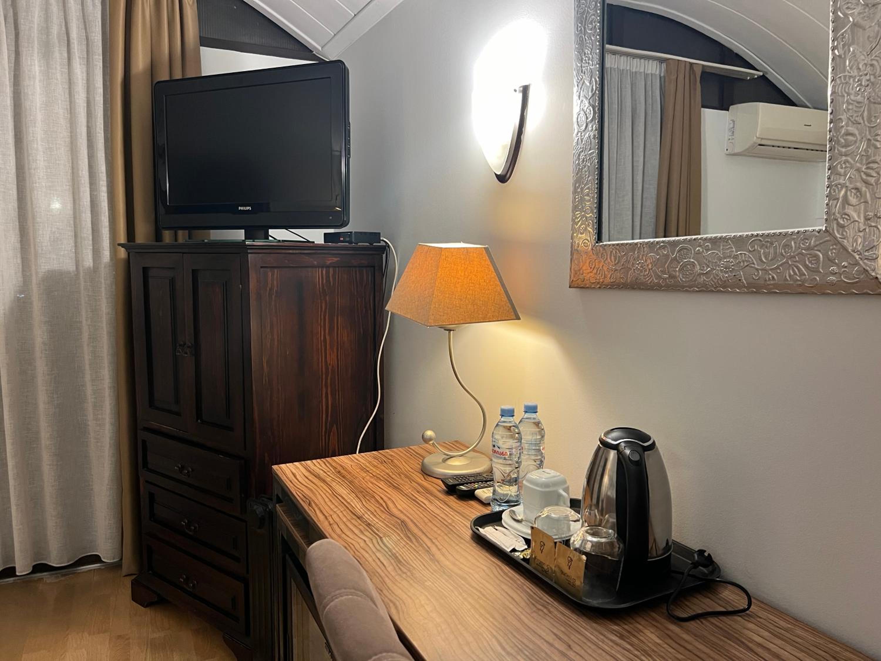 Loved this fantastic hotel. We stayed in the family room and loved the layout. It was really hot outside but the room stayed cool with the help of the A/C and ceiling fan. This hotel had the best bathroom of all the hotels we've stayed in in Georgia - there was no mold and everything worked the way it should. The pool was great and it was nice you could get drinks at the bar (with a daily happy hour!). The views were great and there is a bus stop literally outside the hotel. Our room had two balconies. The breakfasts were quite good and the staff was wonderful and spoke great English. We loved the two cats that would join us outdoors for breakfasts.