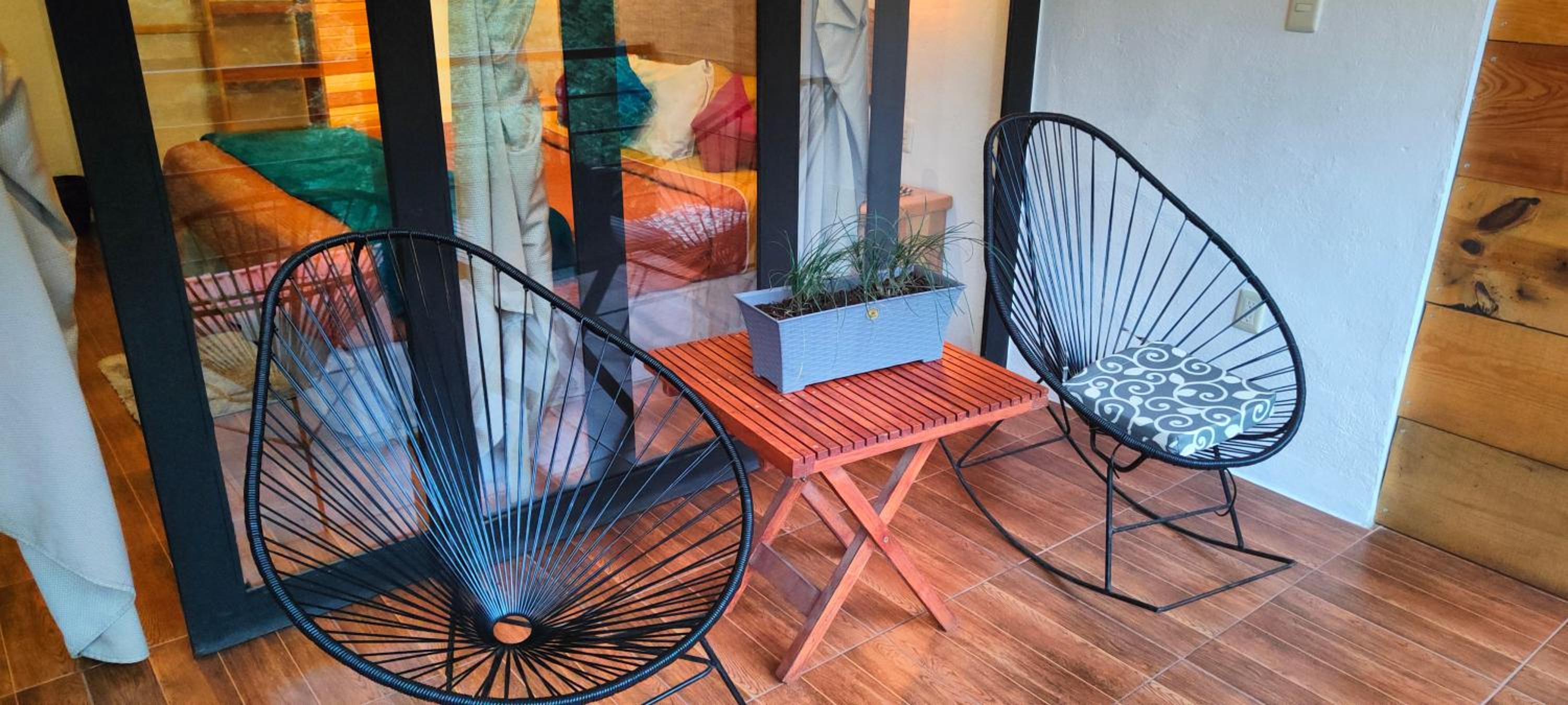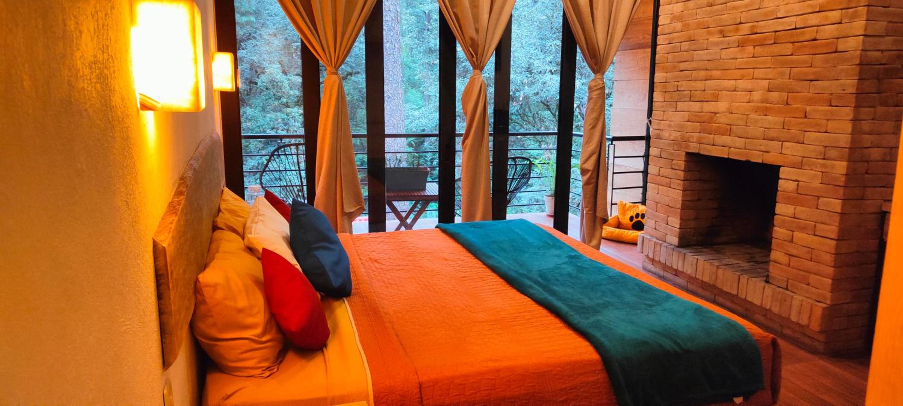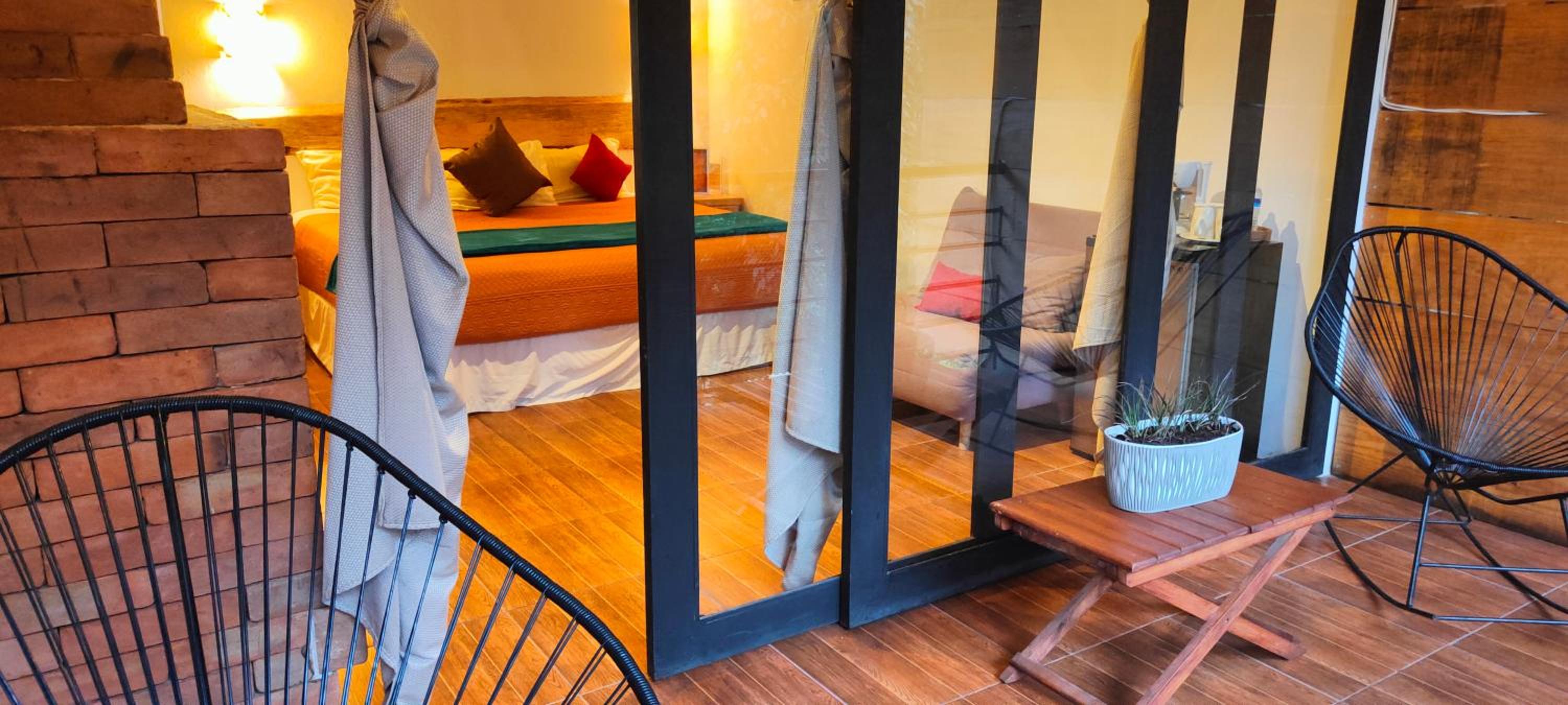 La vista de la habitación 4 es muy bonita, la cama cómoda y el.sillon frente a la fogata. Oedi decoración de cumpleaños y estuvo bonito.