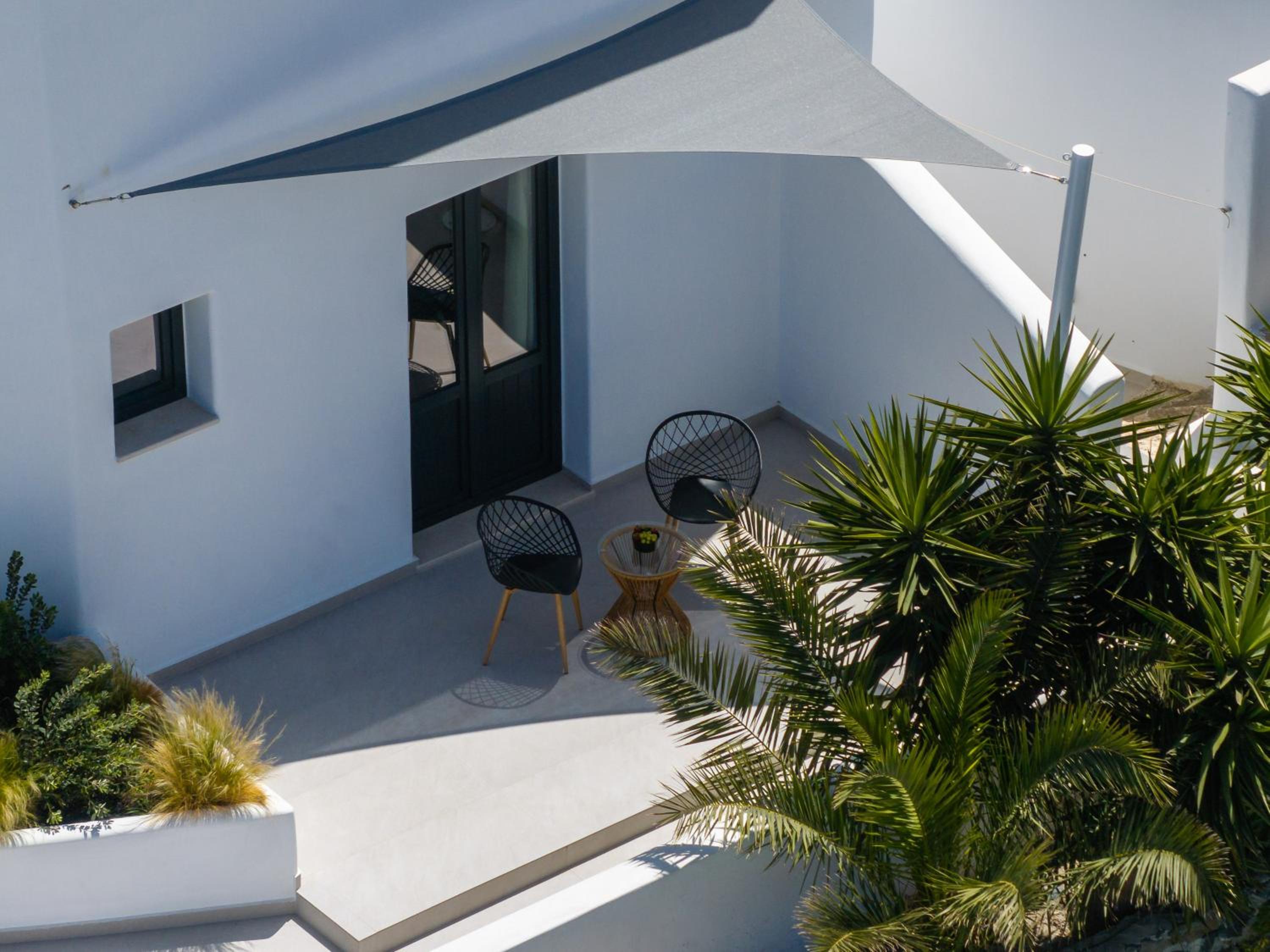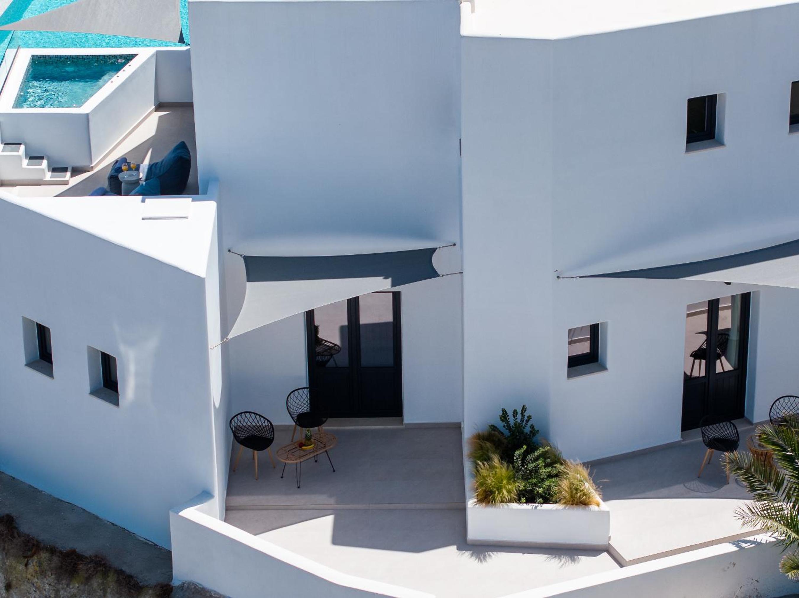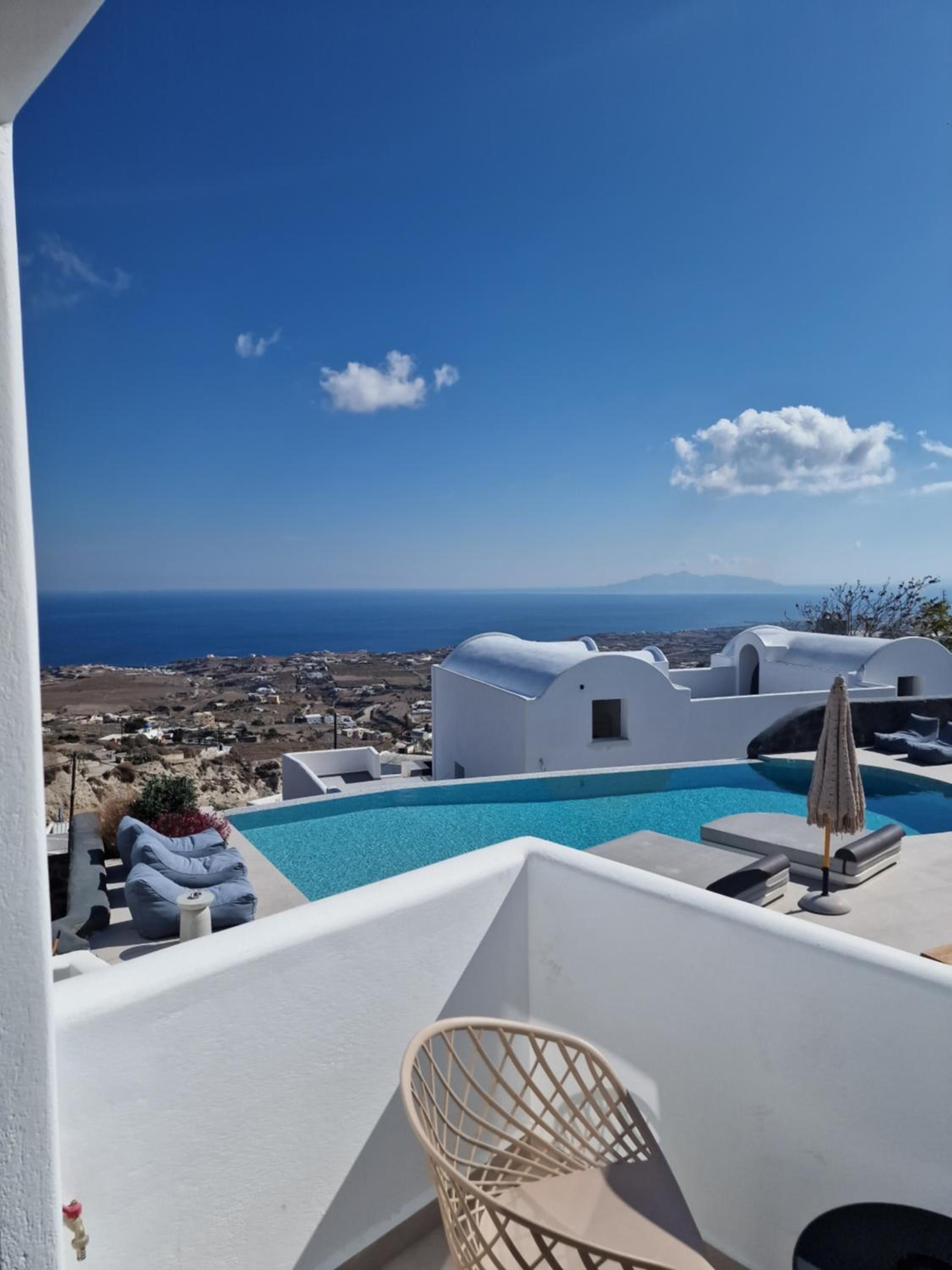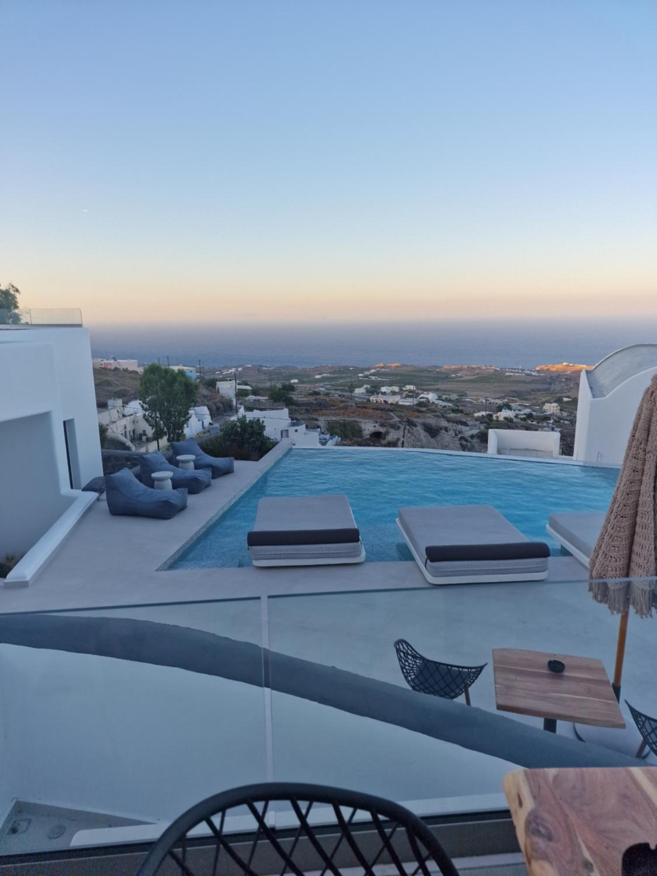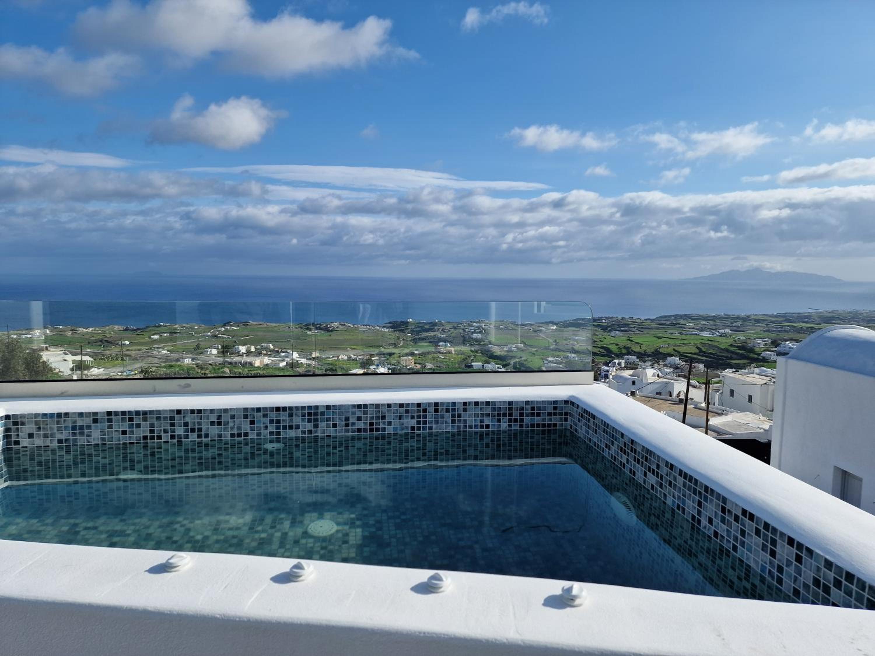 Very high standard of accommodation. Pool area very well furnished and comfortable. The room was immaculate with very comfortable bed and amazing shower. The hot tub on our balcony was a lovely addition and always at the perfect temperature. The staff were incredible especially Eva. She arranged a lovely surprise with my fiancé for my birthday and throughout our stay she was outstanding. She arranged our airport transfers and buggy hire. Property has a great location about a ten minute walk to the center of Fira but lovely restaurants next to the property and a mini market across the road. There was a very reasonably priced selection of drinks at reception and Eva always had ice, glasses, snacks on hand which was a lovely touch. I cannot recommend this property highly enough. You will not be disappointed. We are already planning our return visit.