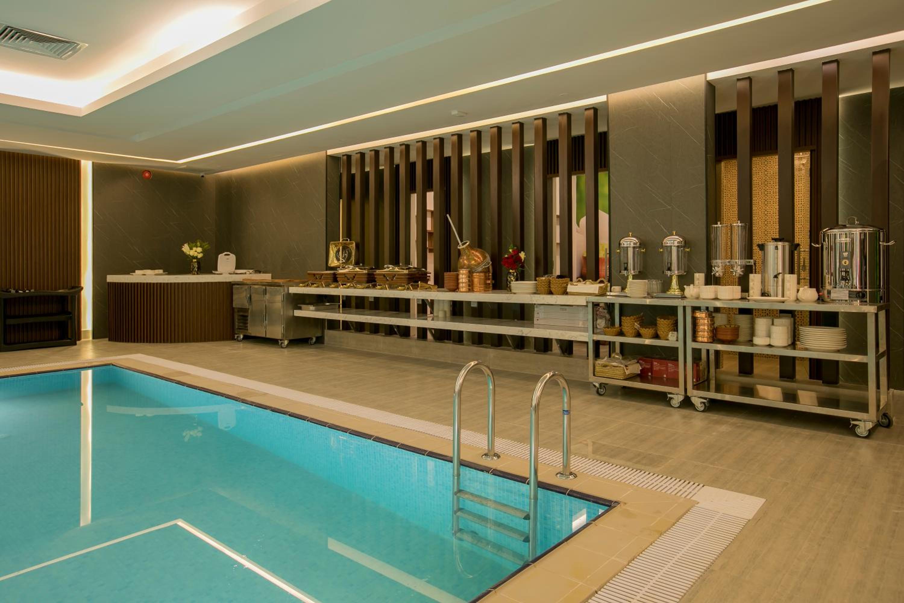 Piscina interna tra i tavoli del ristorante e acqua fredda.