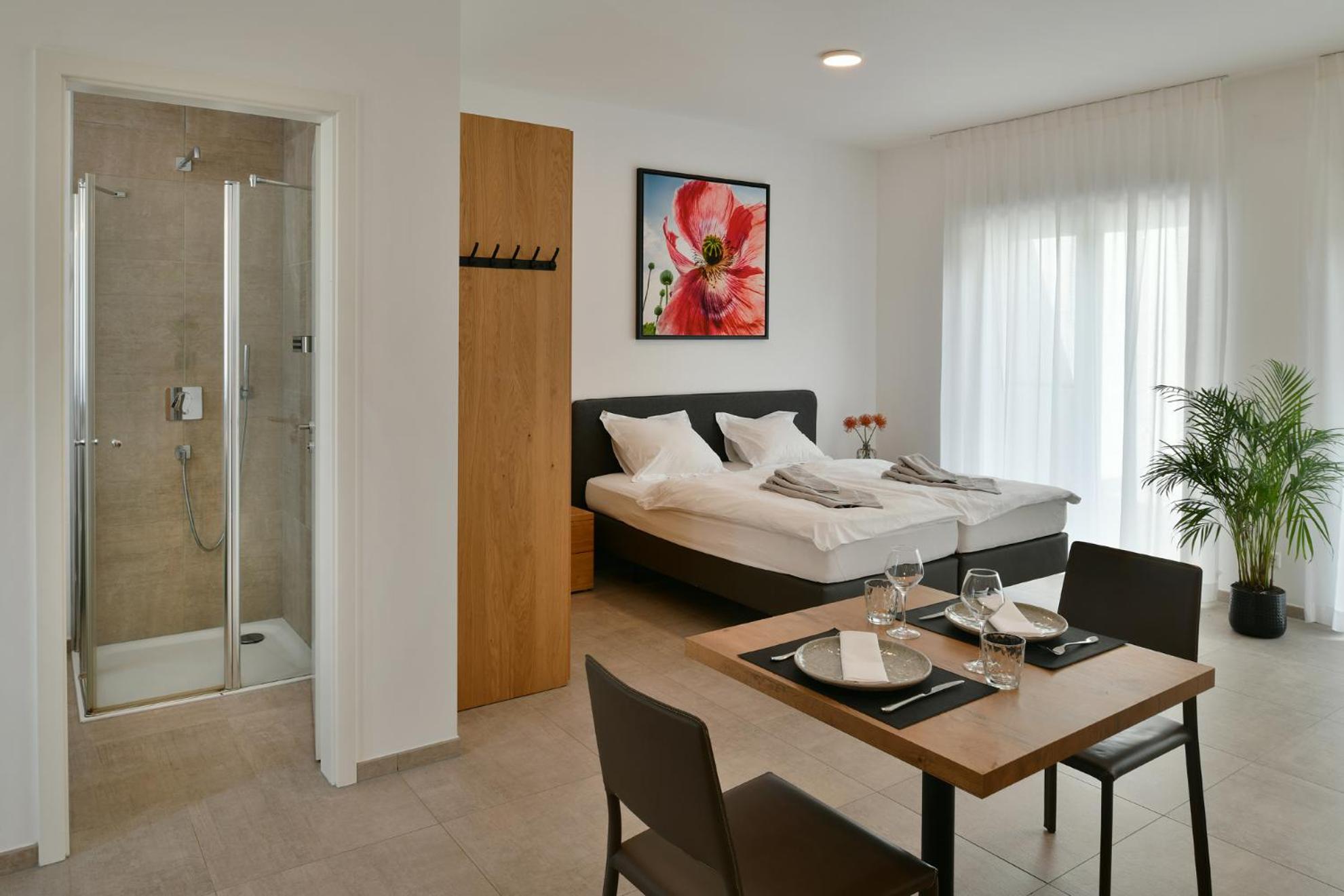 Each room at K-Stables is equipped with modern amenities including a flat-screen TV, coffee machine, and a private bathroom with free toiletries.