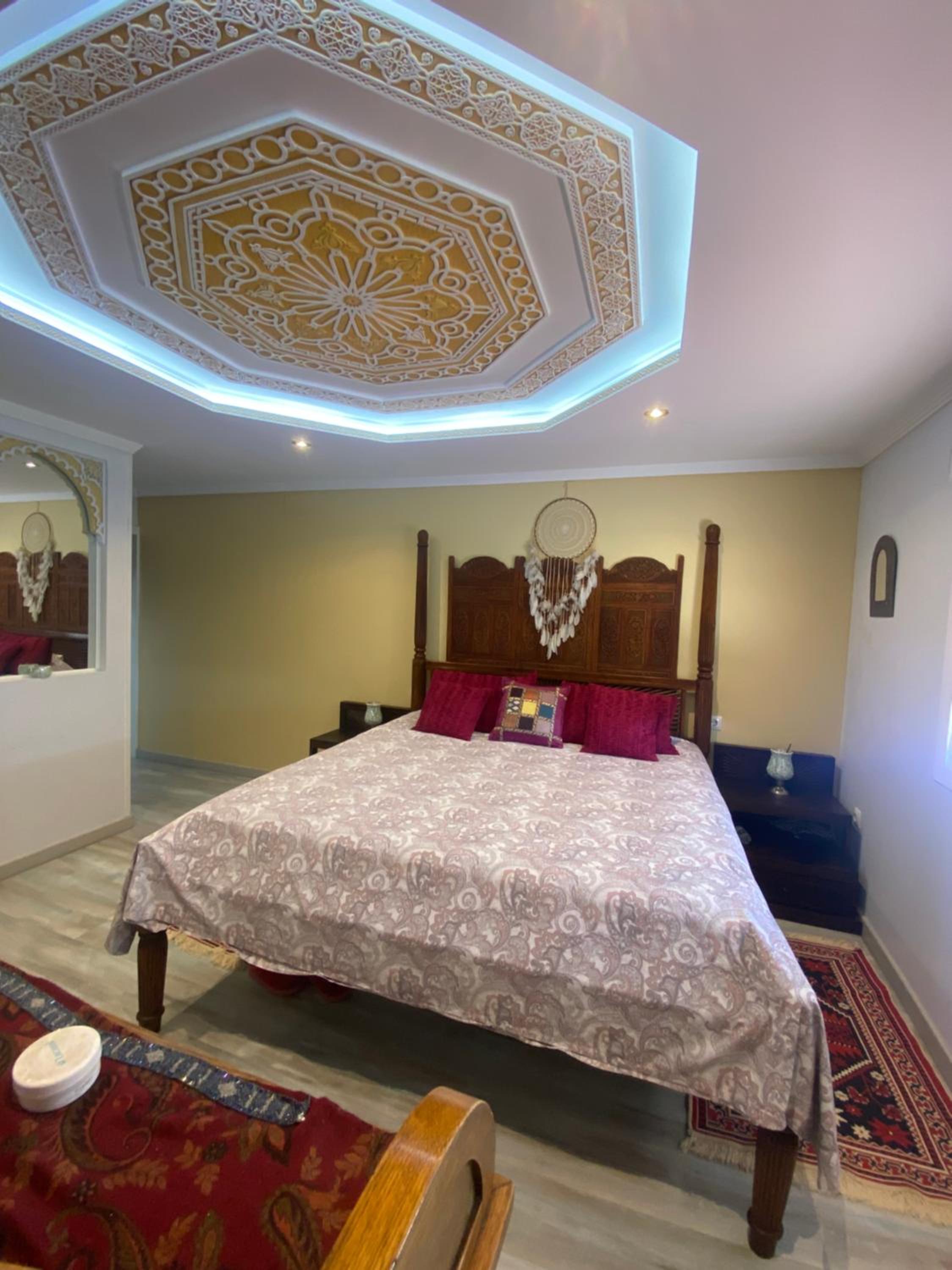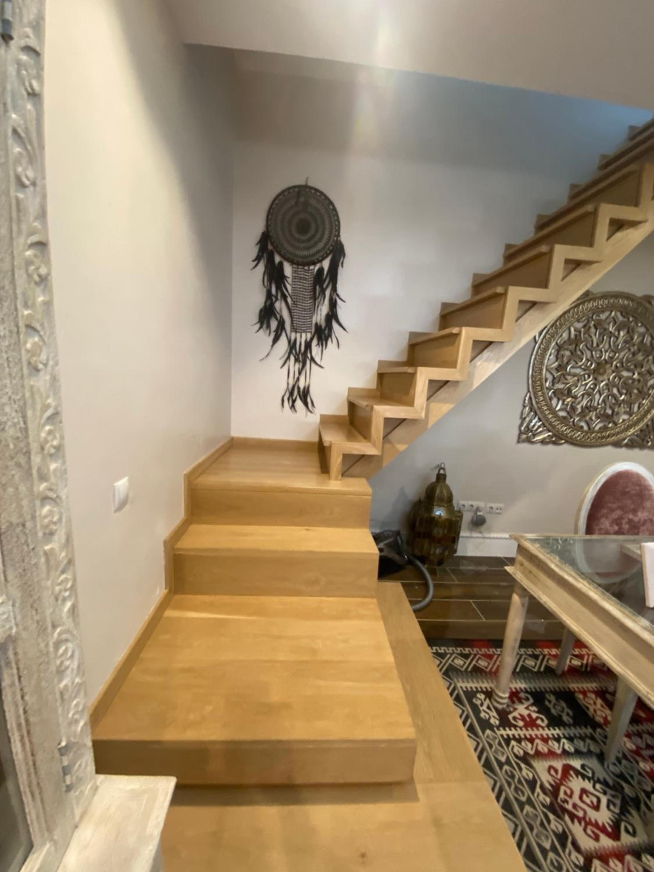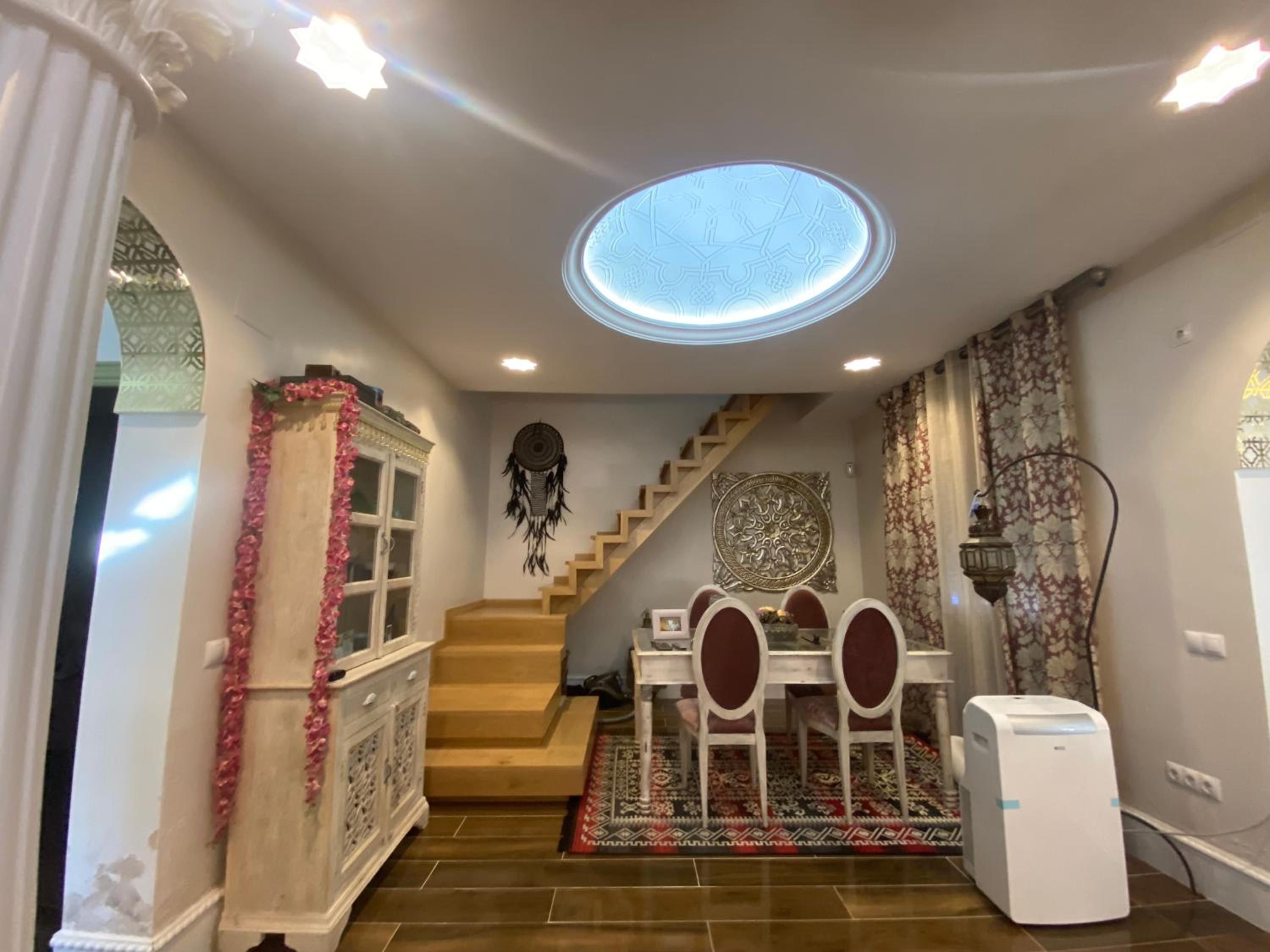 Tenían una terraza muy acogedora. Una casa que invita a la paz con su decoración y libros budistas, también contaban con decoración estilo árabe para pasar las mil y una noches descansando. La cama de la planta de arriba era enorme y muy cómoda, con baño propio. En la habitación de abajo el baño estaba fuera pero justo en frente. A nuestra disposición cocina grande con isleta para comer allí y salón con mesa comedor, Tv grande y minibiblioteca. Tranquilidad en la casa. Libros interesantes al alcance para leer. La habitación de abajo tiene Tv grande, la de arriba cuenta con un escritorio enorme estilo antiguo inspirador para amantes de la escritura. Muchos detalles en la decoración y muebles muy bonitos. Volvería a esta casa.
