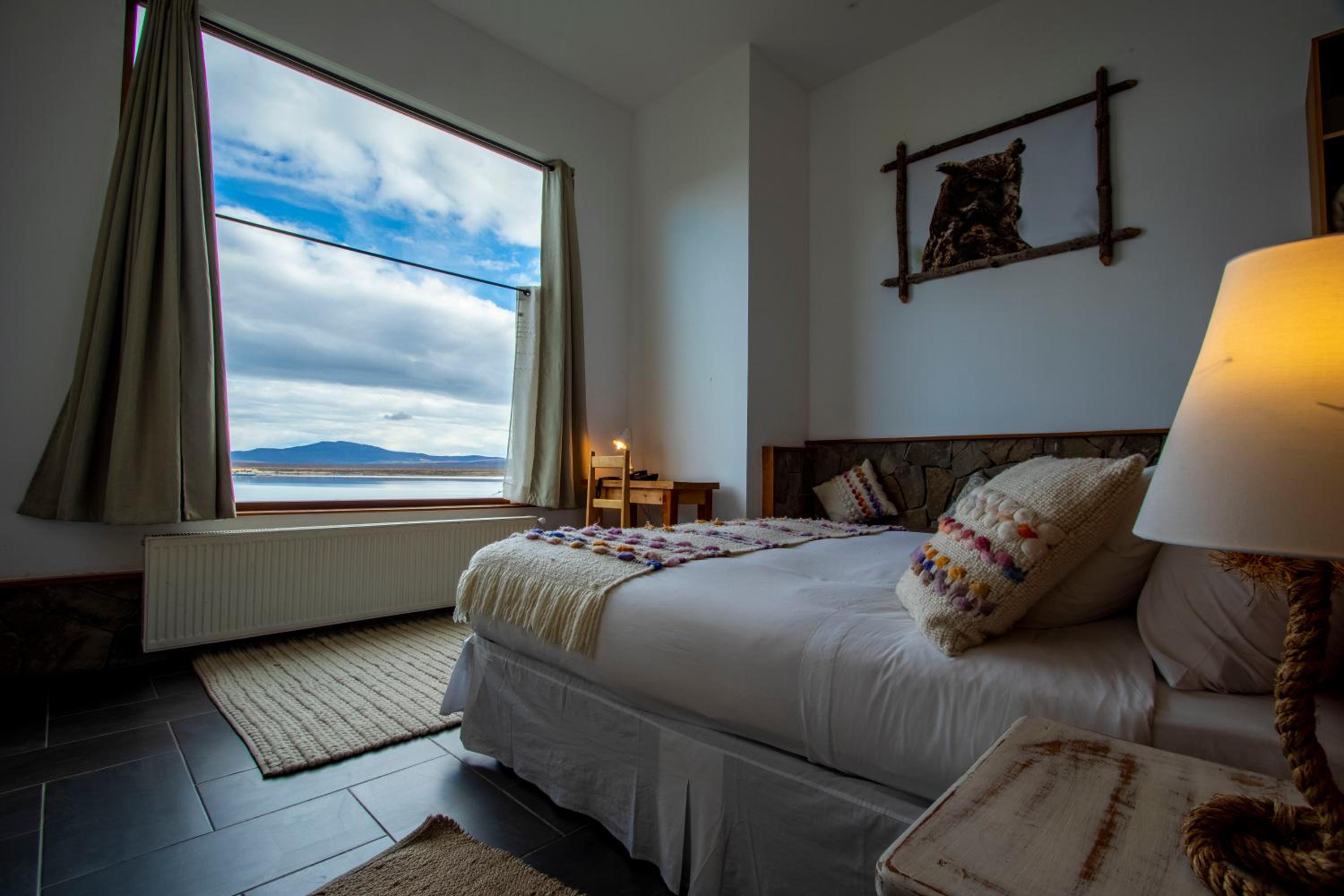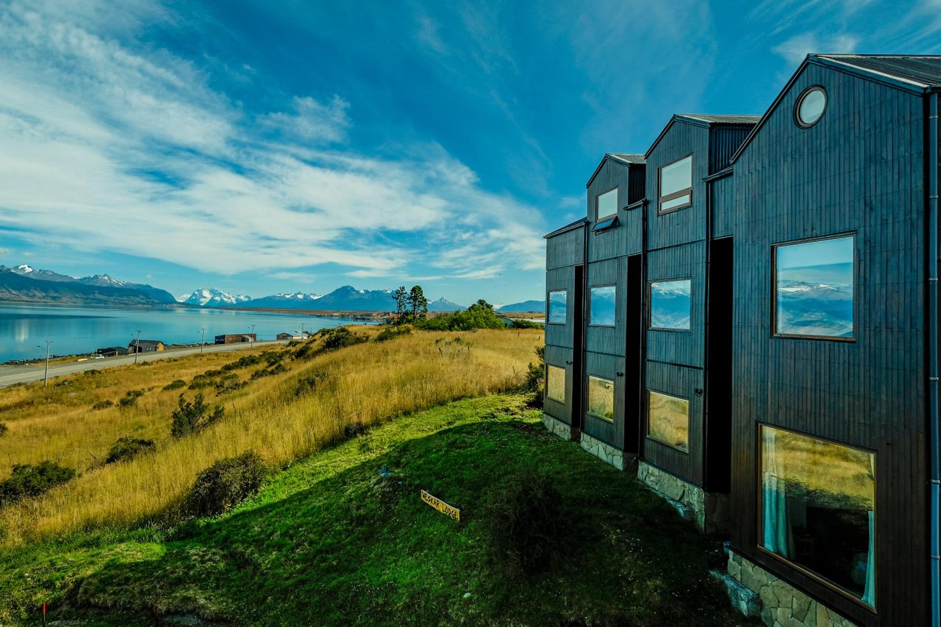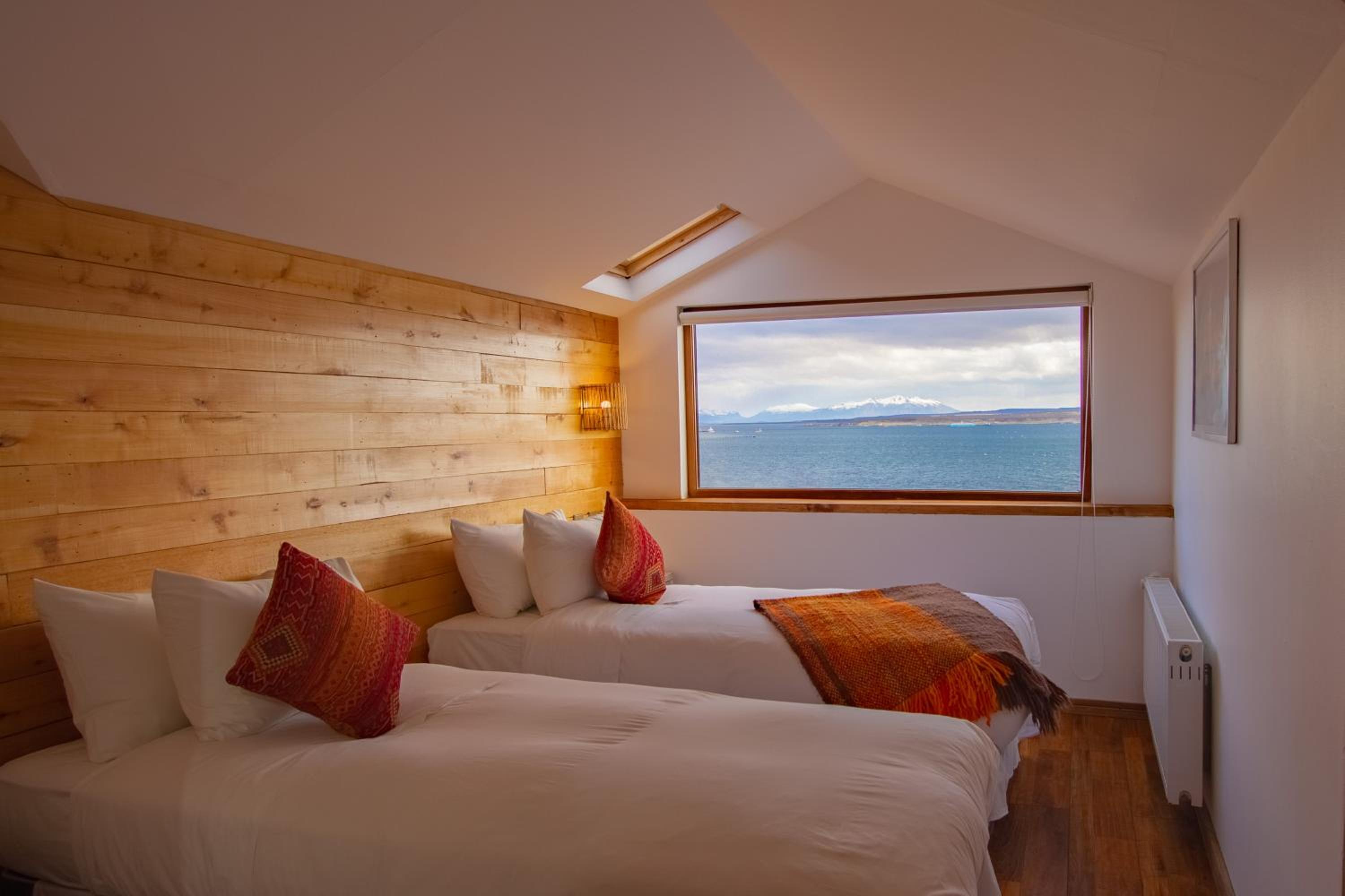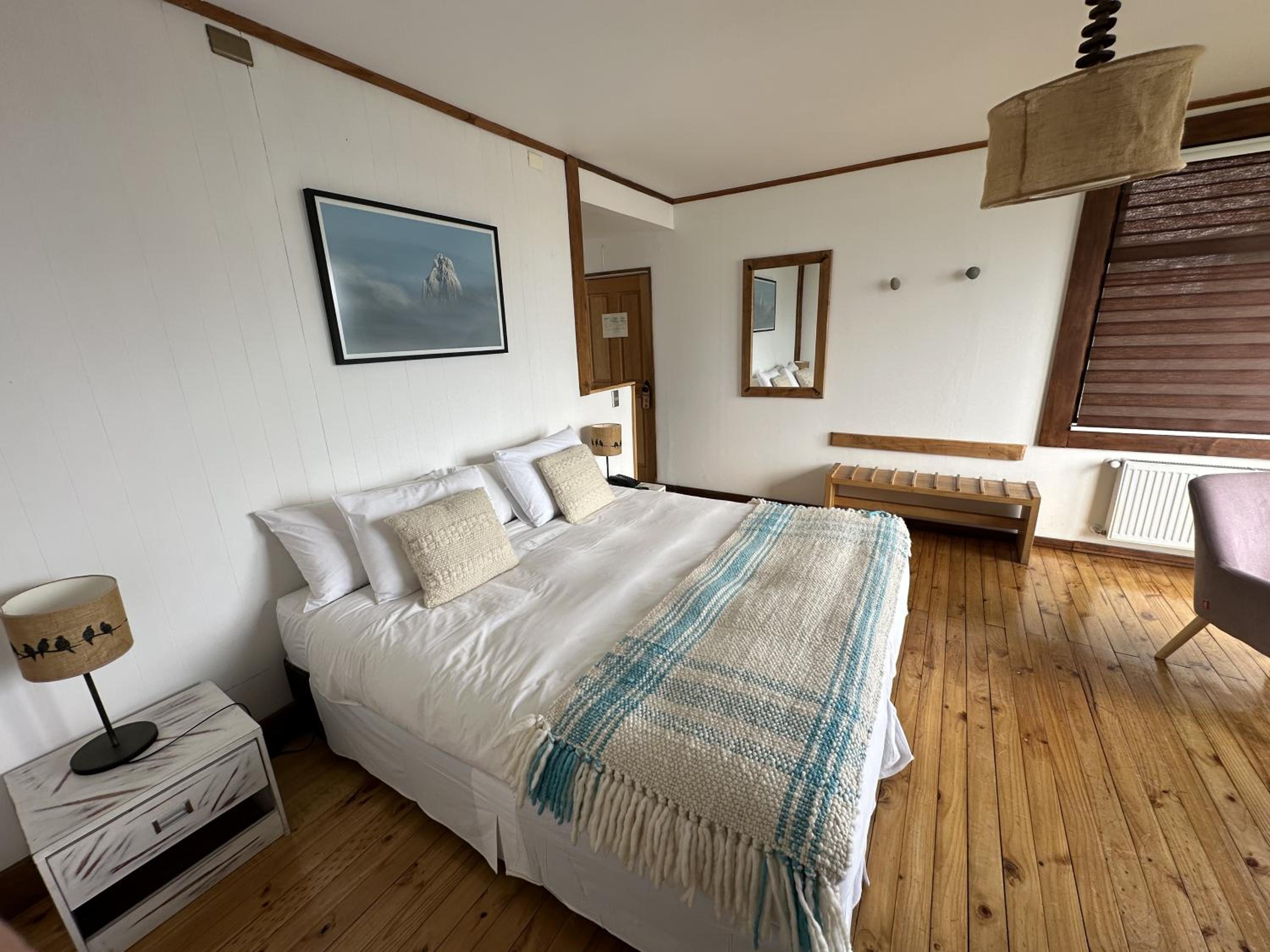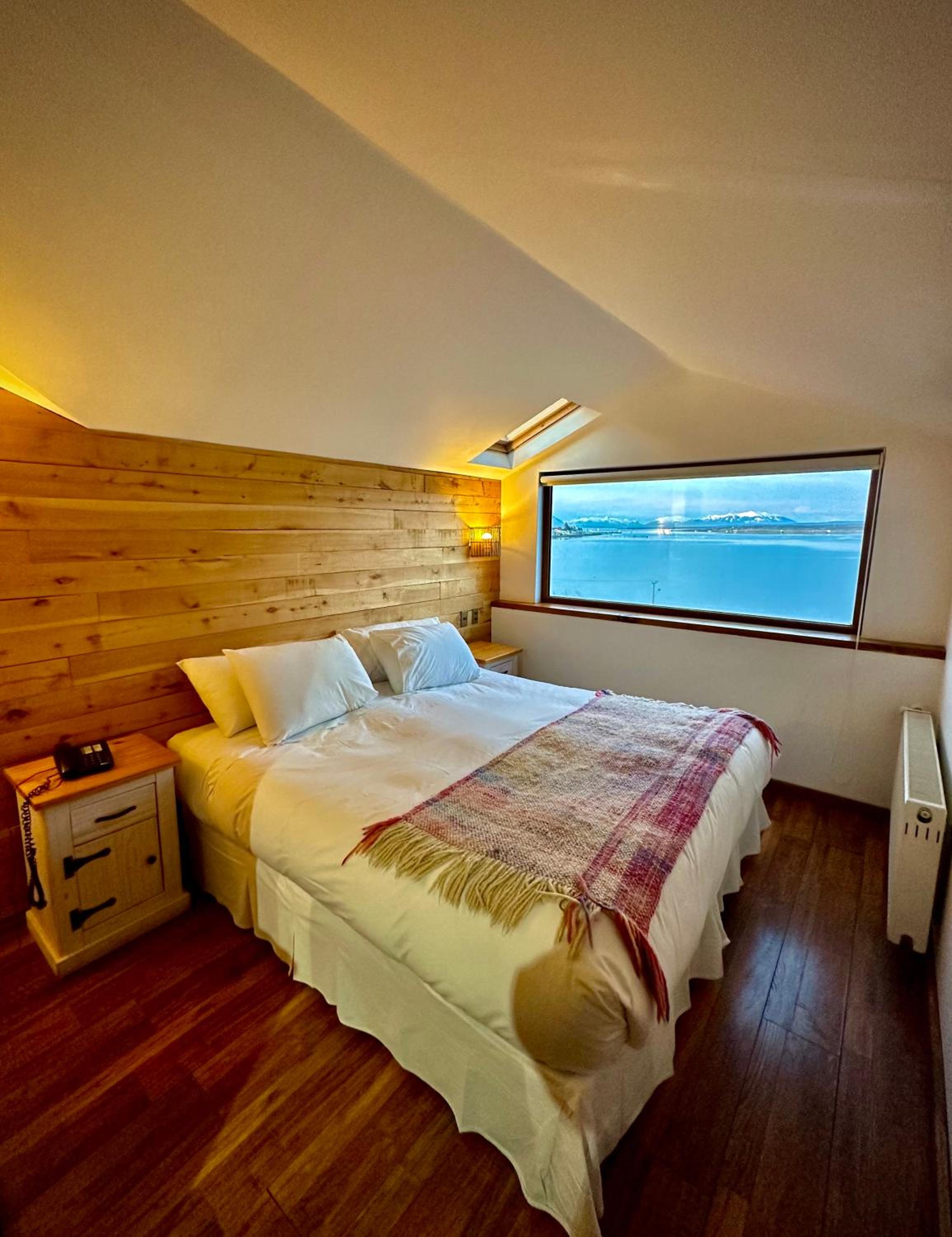 Nestled against a stunning Patagonian mountain backdrop, Weskar offers a cosy retreat with decked wooden walls and grey carpets in every room, providing a truly immersive mountain lodge experience.