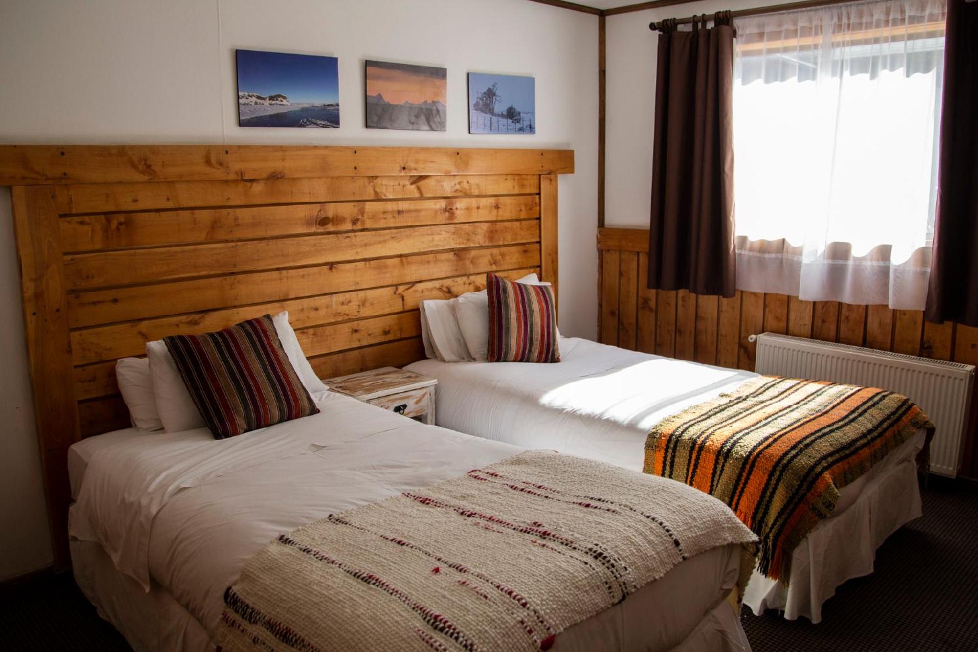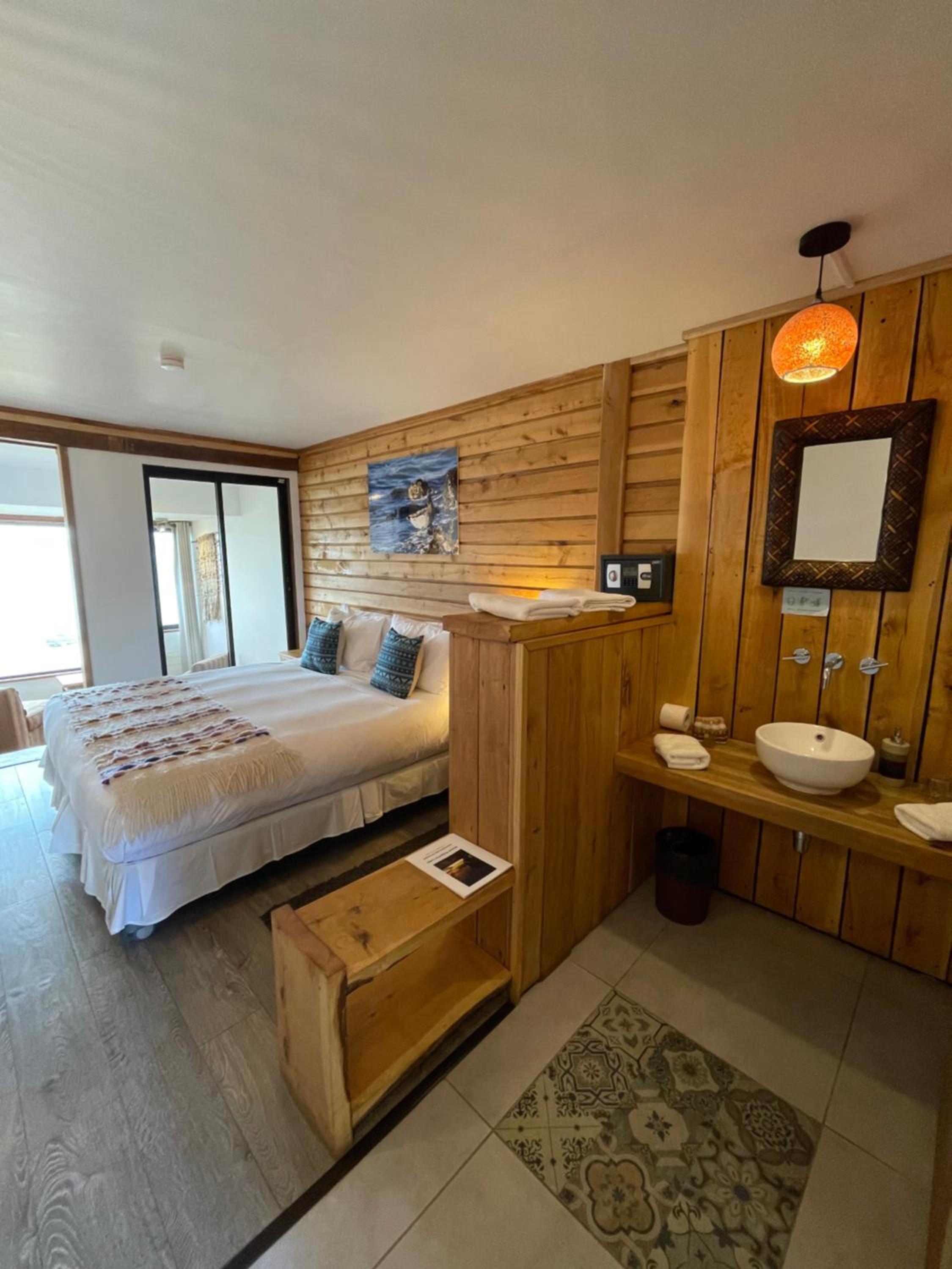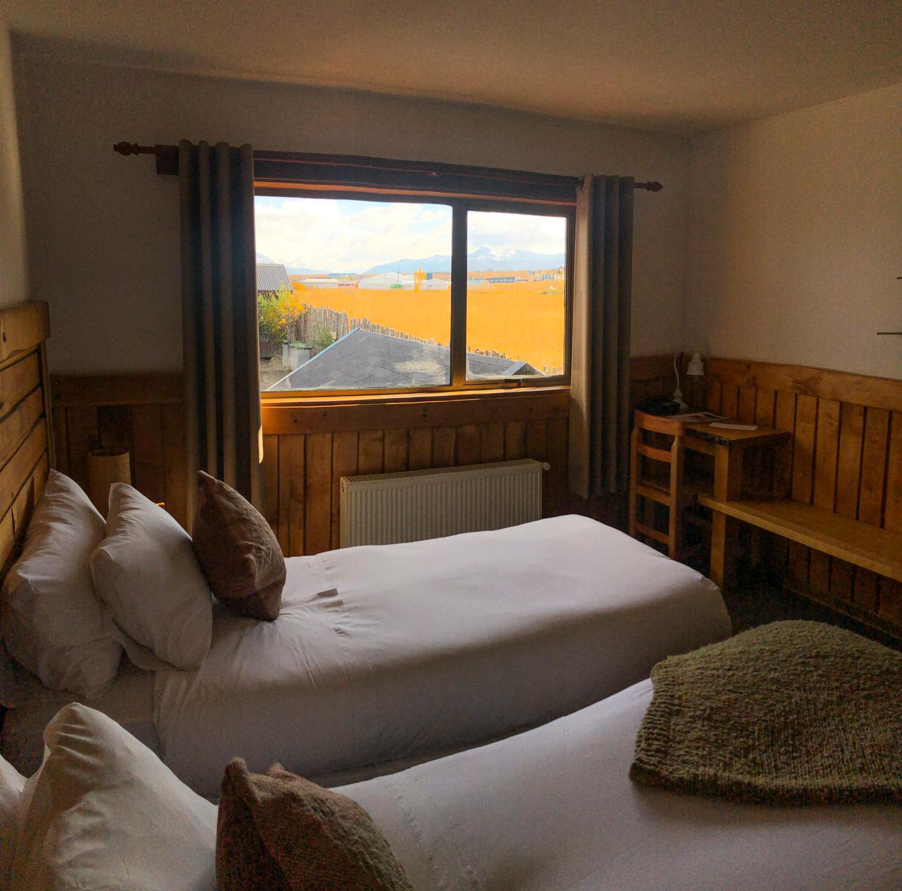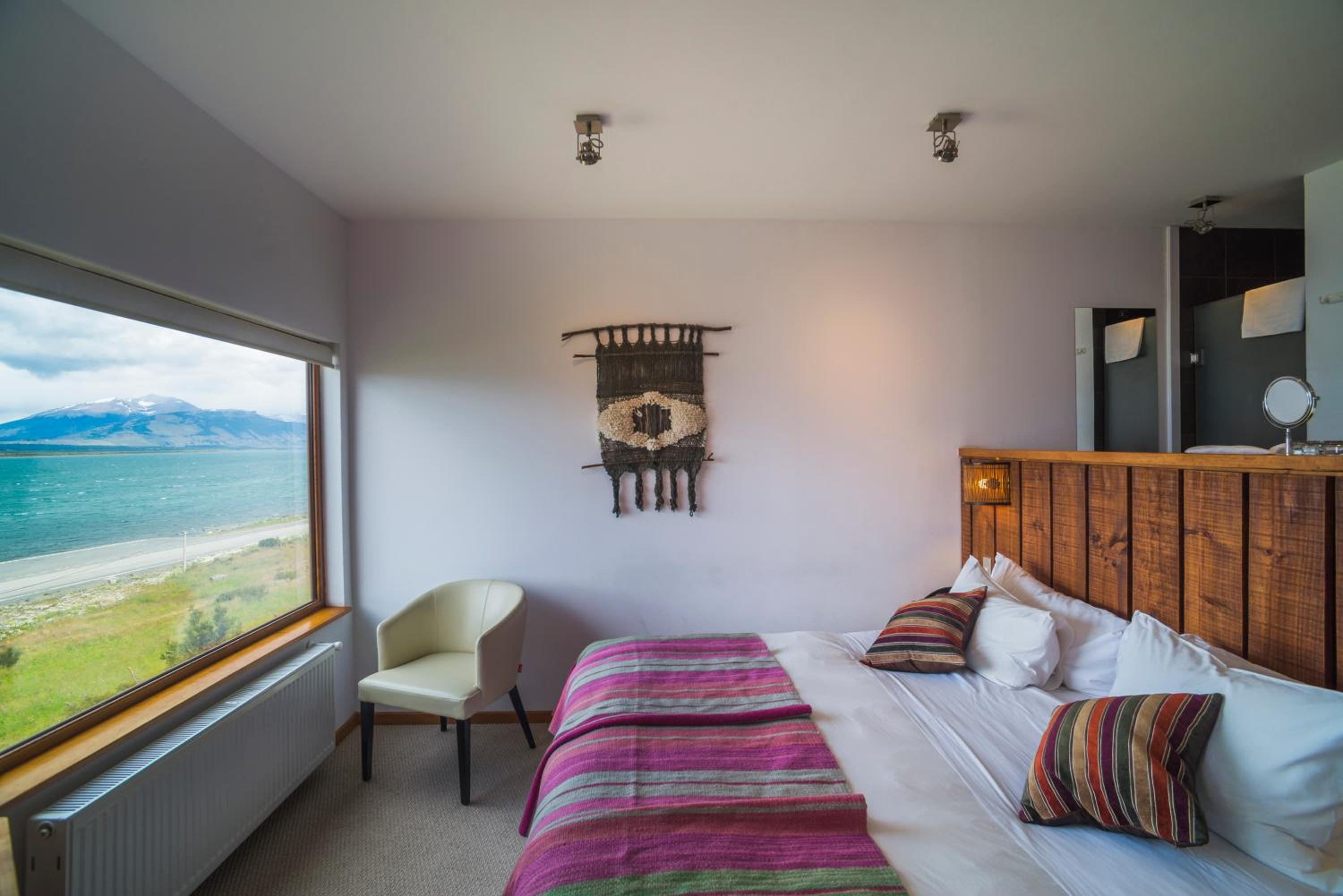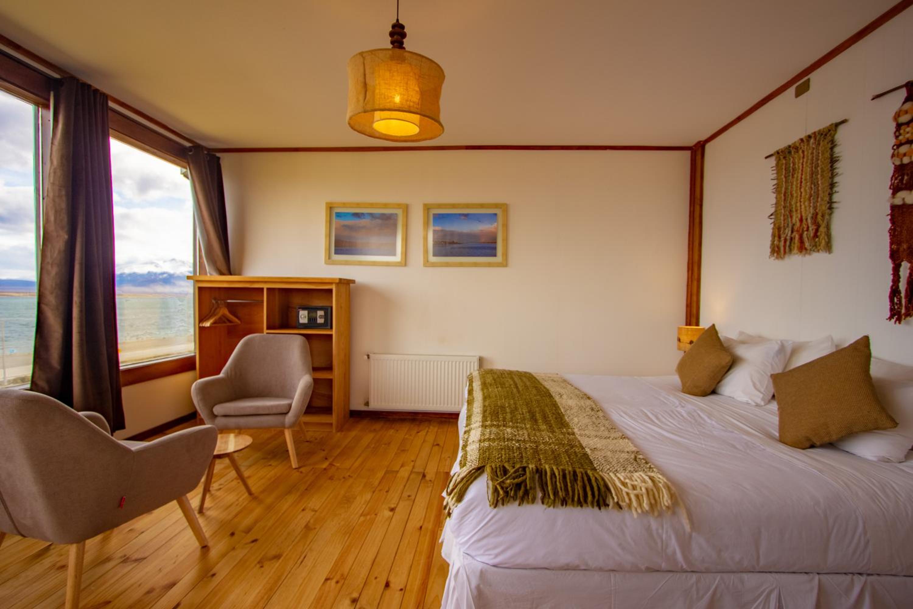Nestled against a stunning Patagonian mountain backdrop, Weskar offers a cosy retreat with decked wooden walls and grey carpets in every room, providing a truly immersive mountain lodge experience.