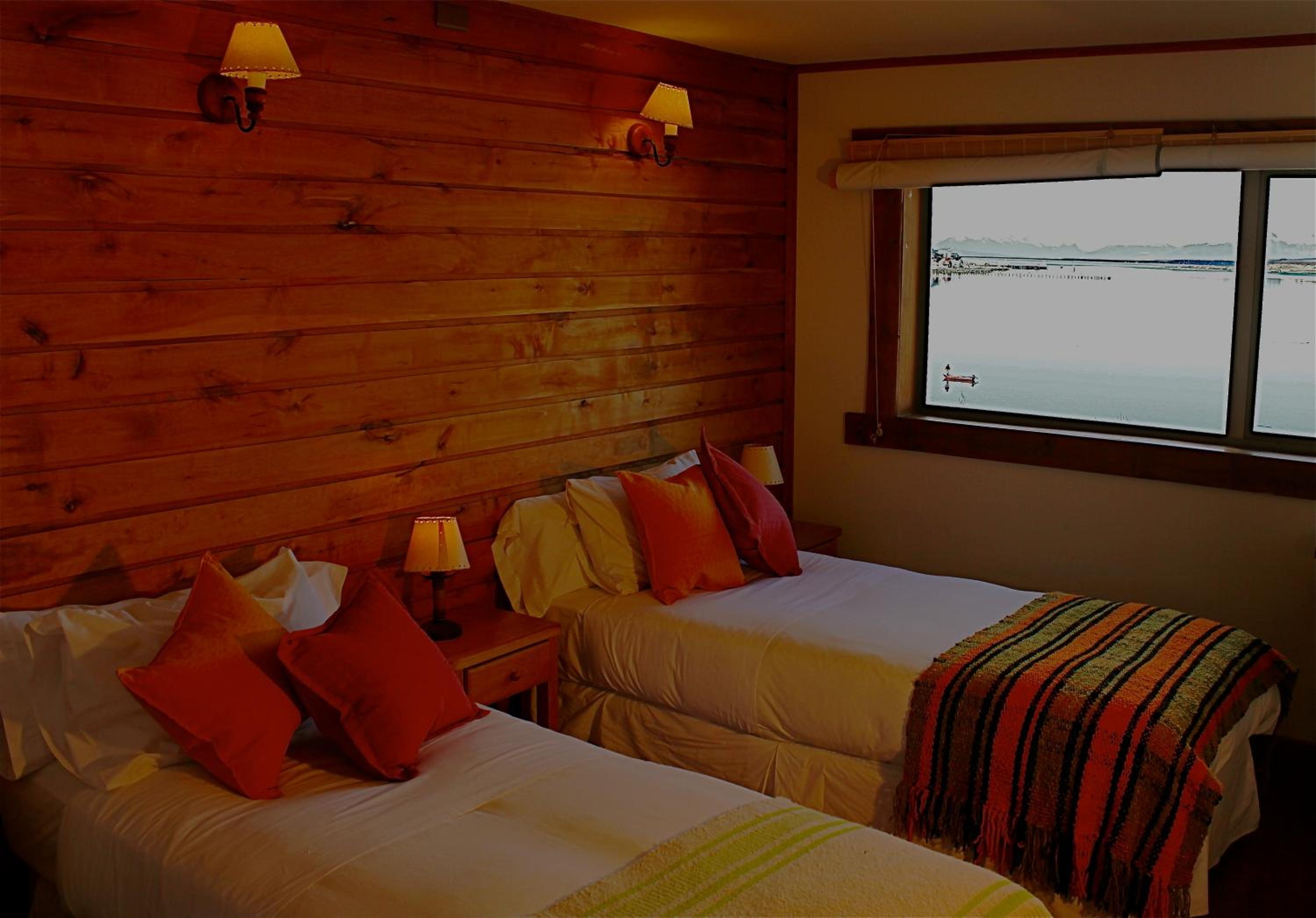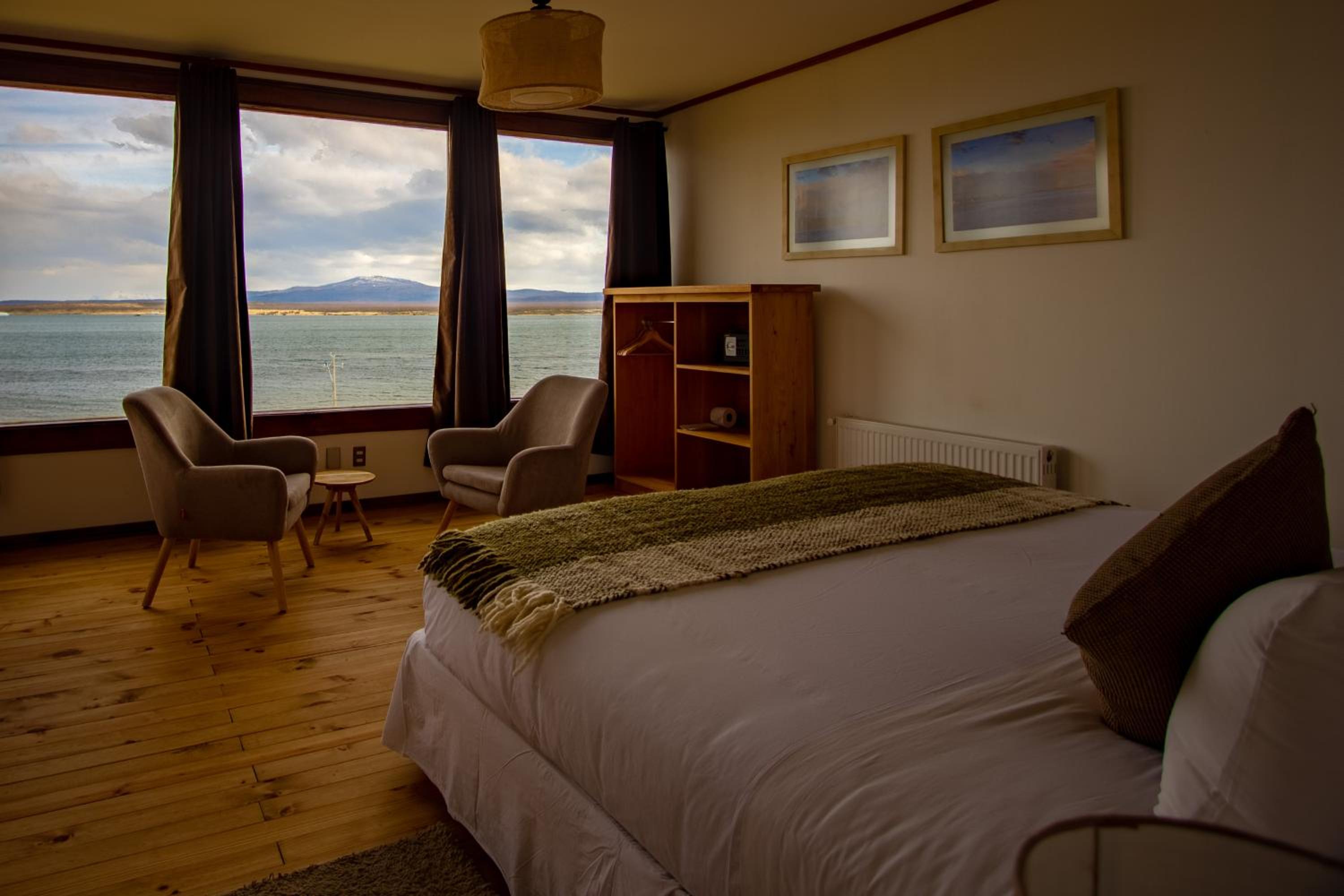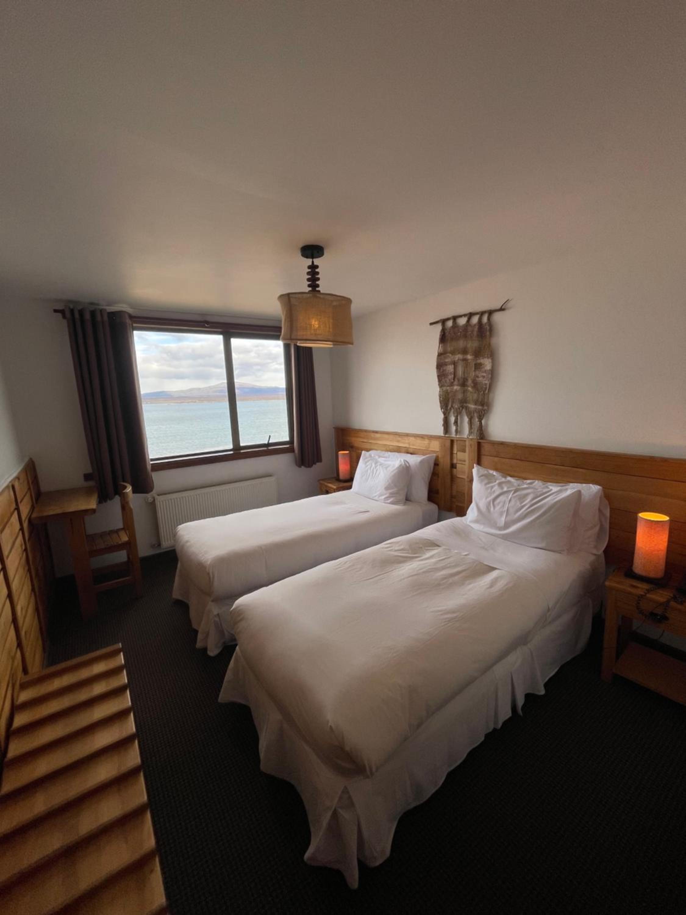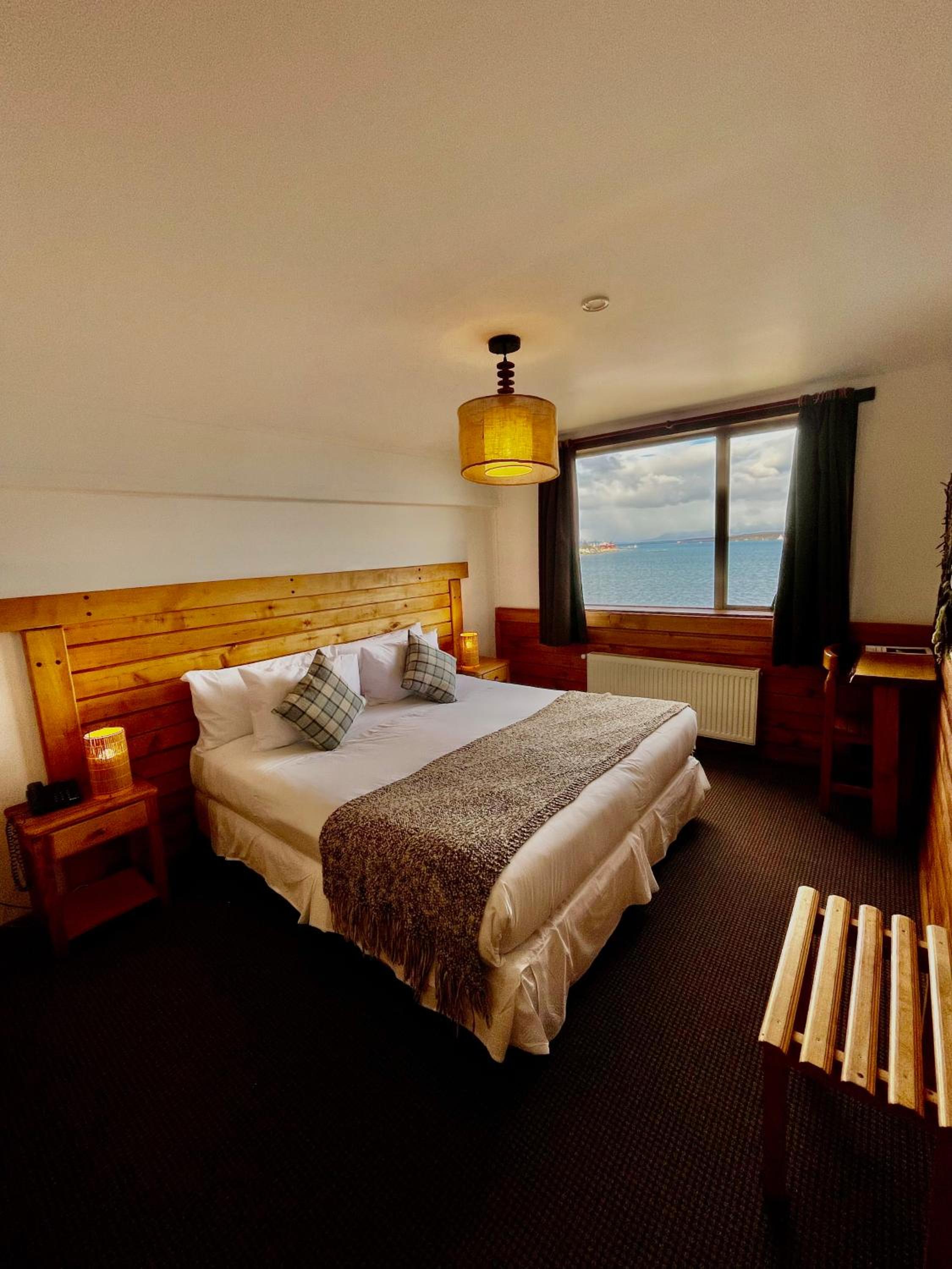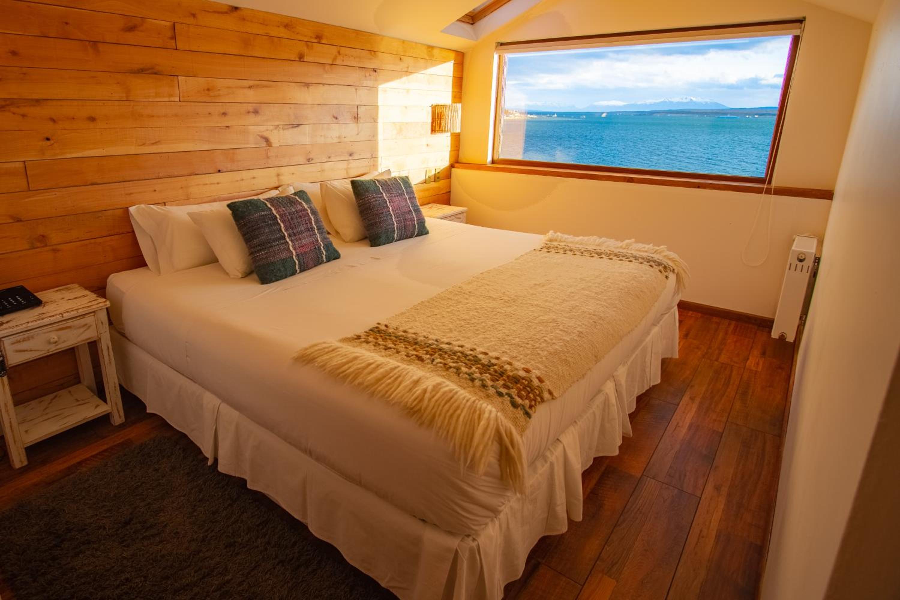 Nestled against a stunning Patagonian mountain backdrop, Weskar offers a cosy retreat with decked wooden walls and grey carpets in every room, providing a truly immersive mountain lodge experience.