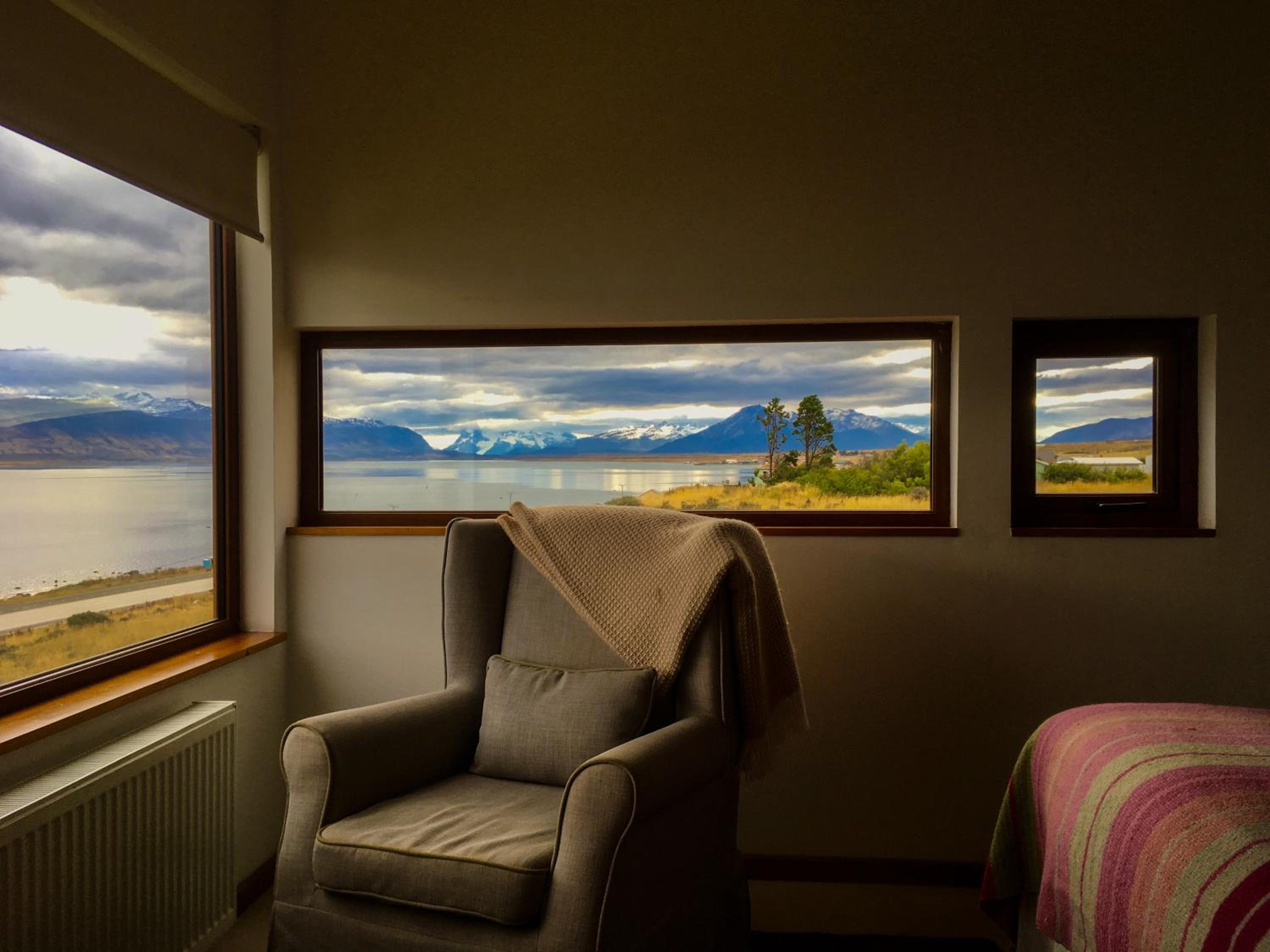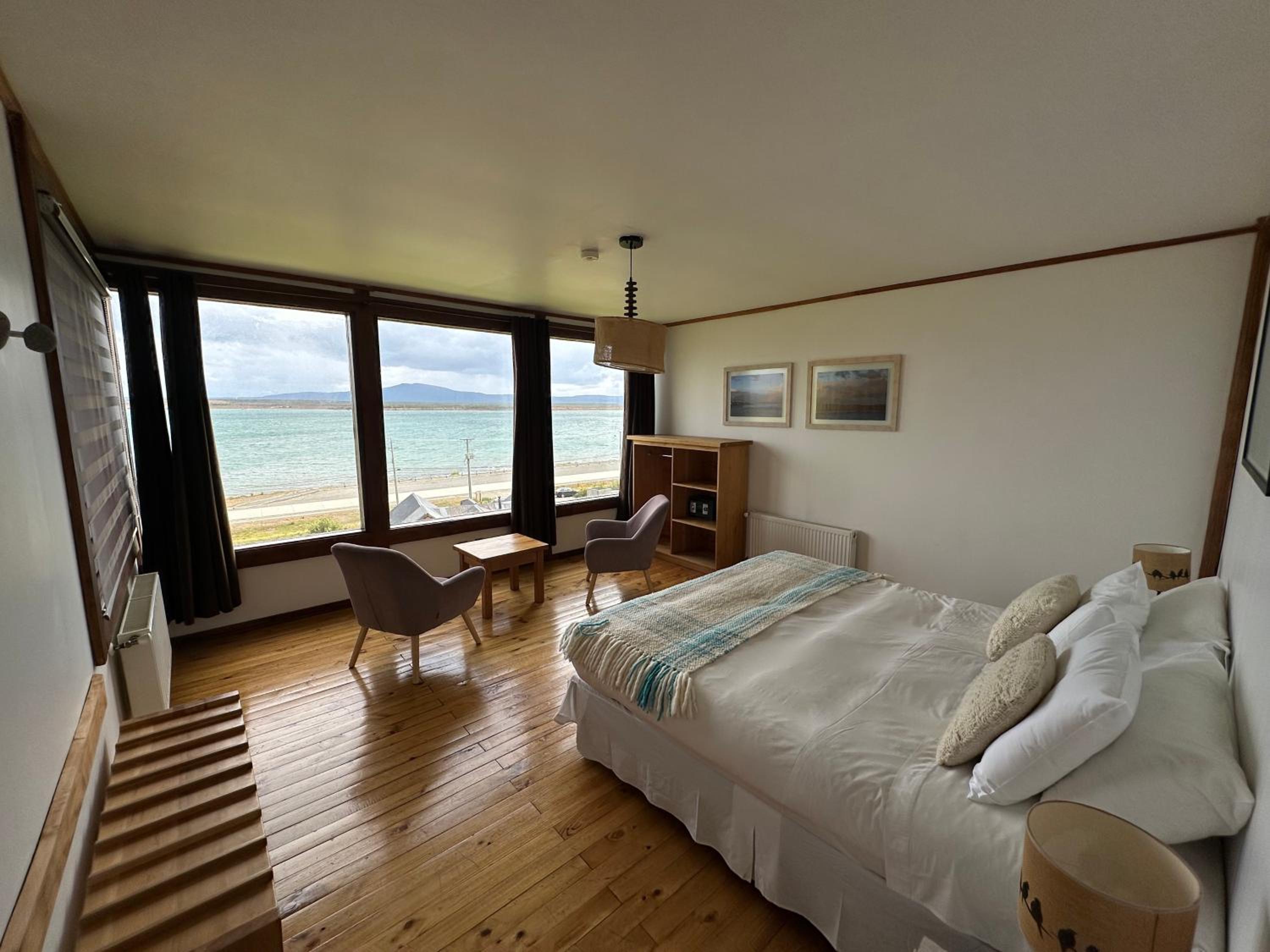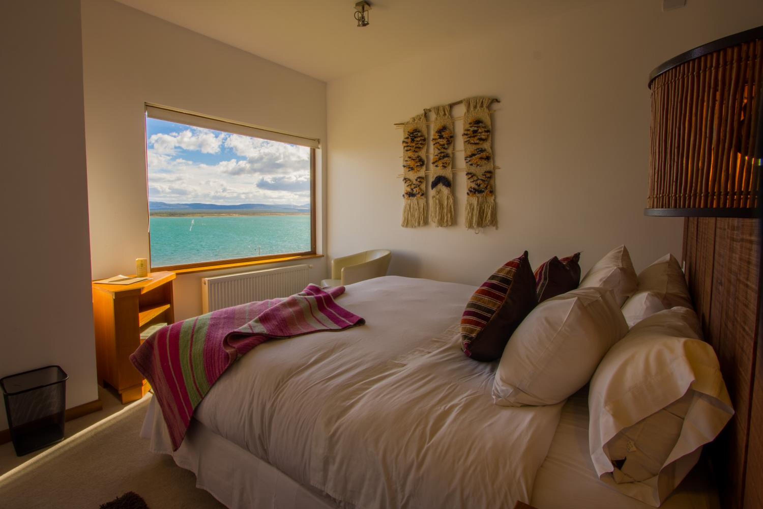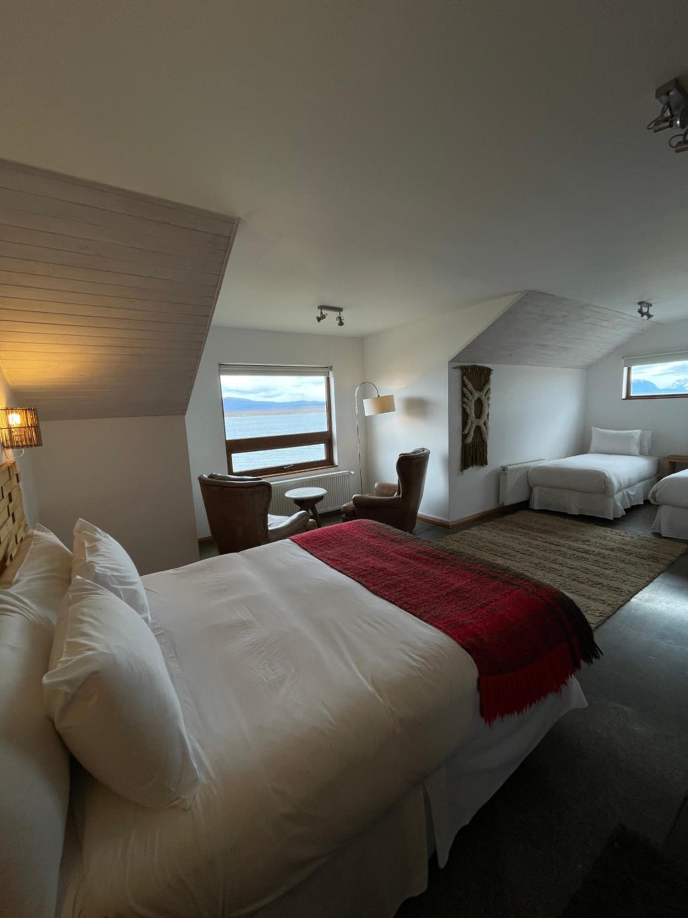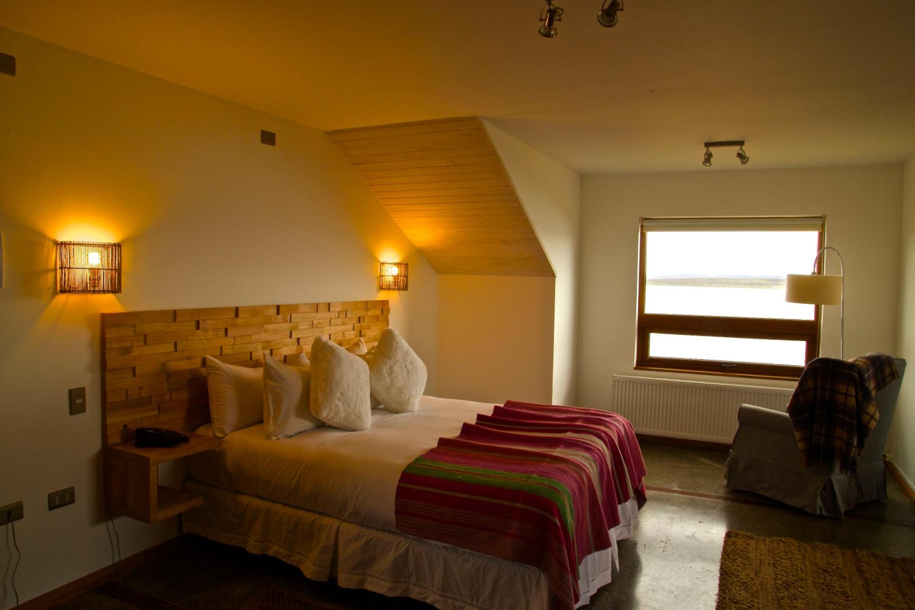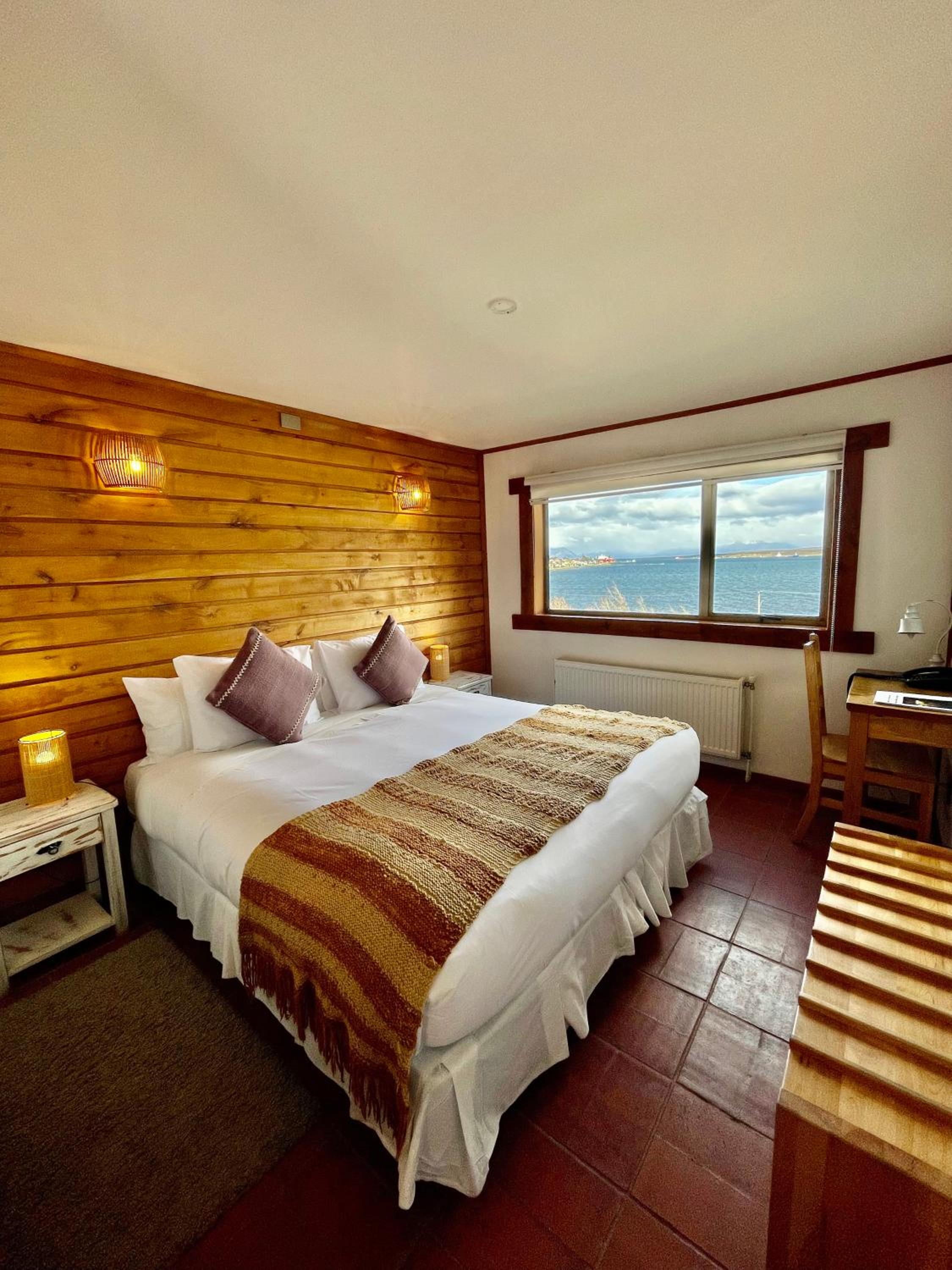 Nestled against a stunning Patagonian mountain backdrop, Weskar offers a cosy retreat with decked wooden walls and grey carpets in every room, providing a truly immersive mountain lodge experience.