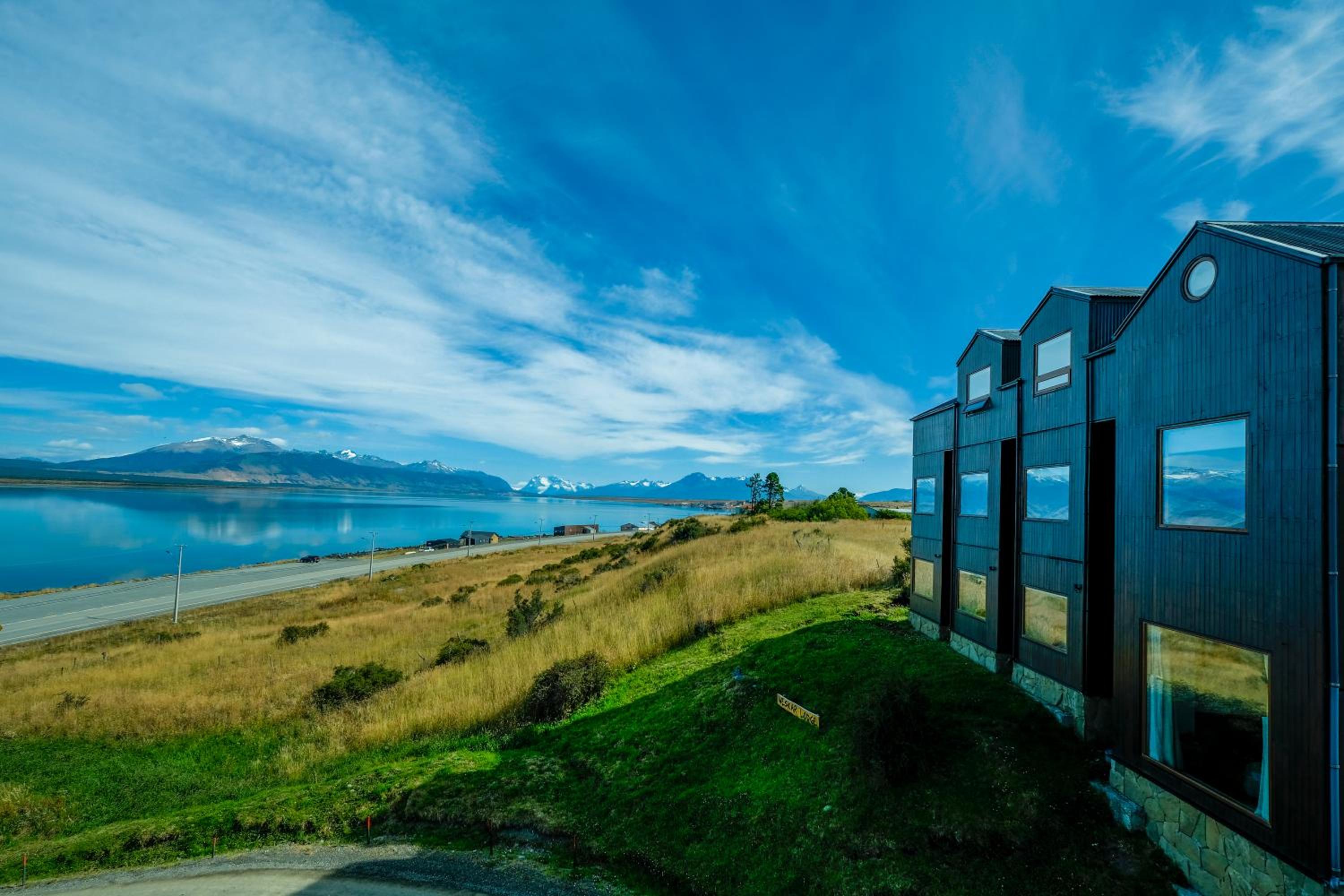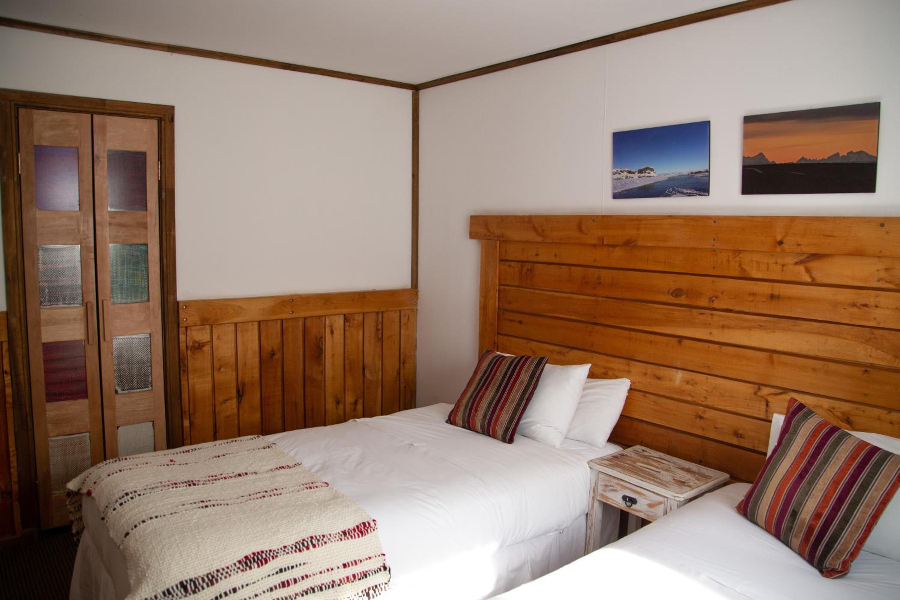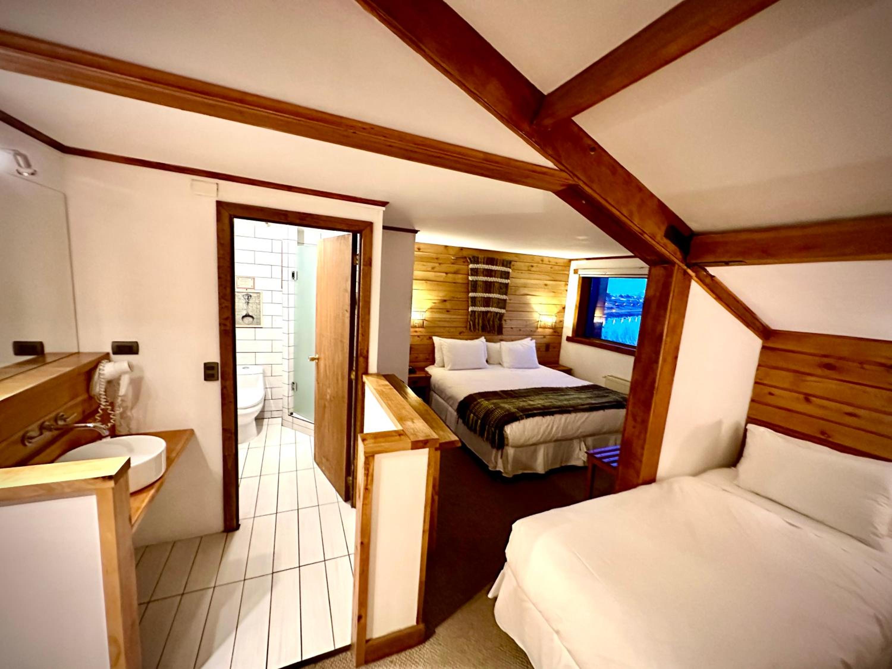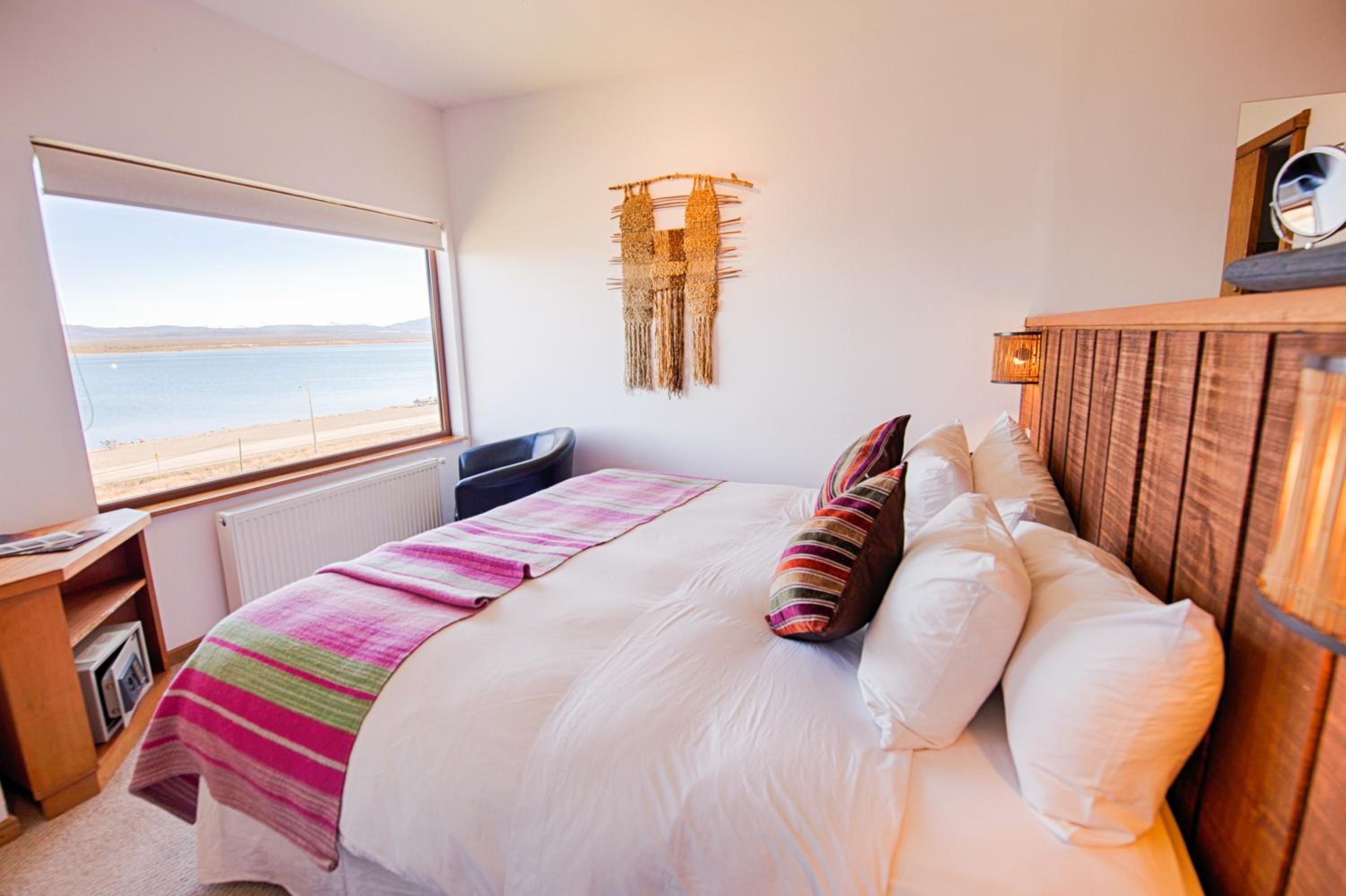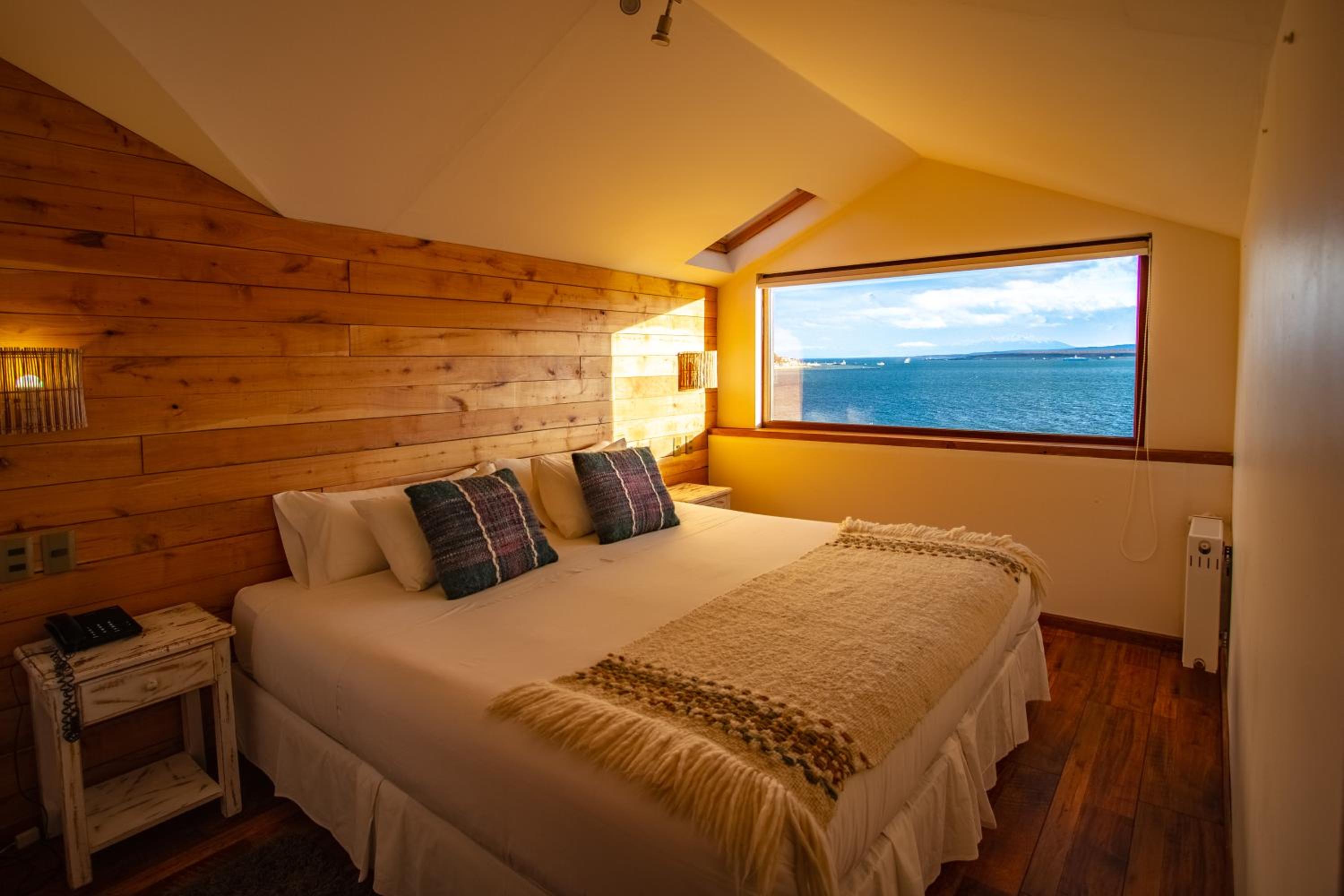 Nestled against a stunning Patagonian mountain backdrop, Weskar offers a cosy retreat with decked wooden walls and grey carpets in every room, providing a truly immersive mountain lodge experience.