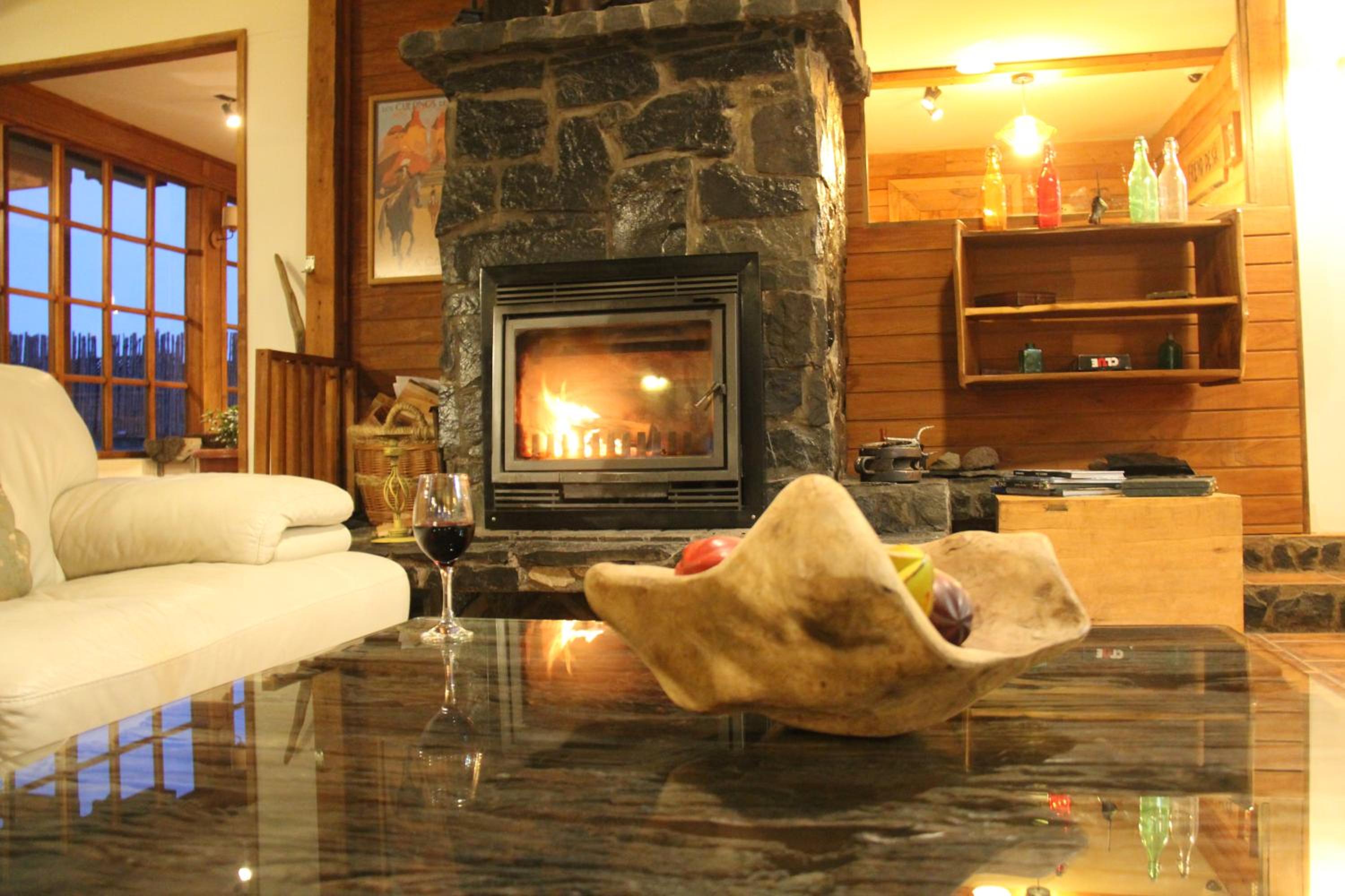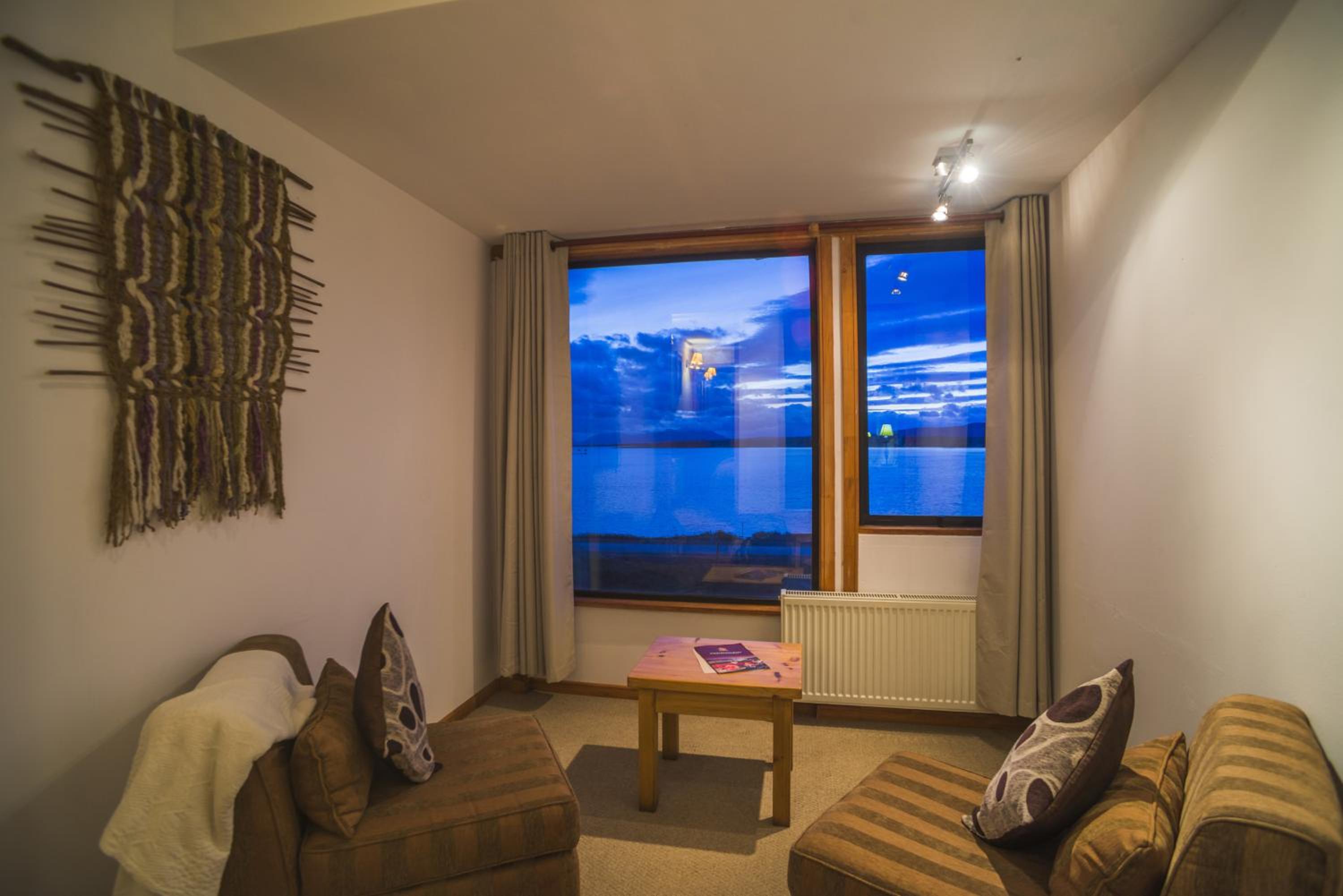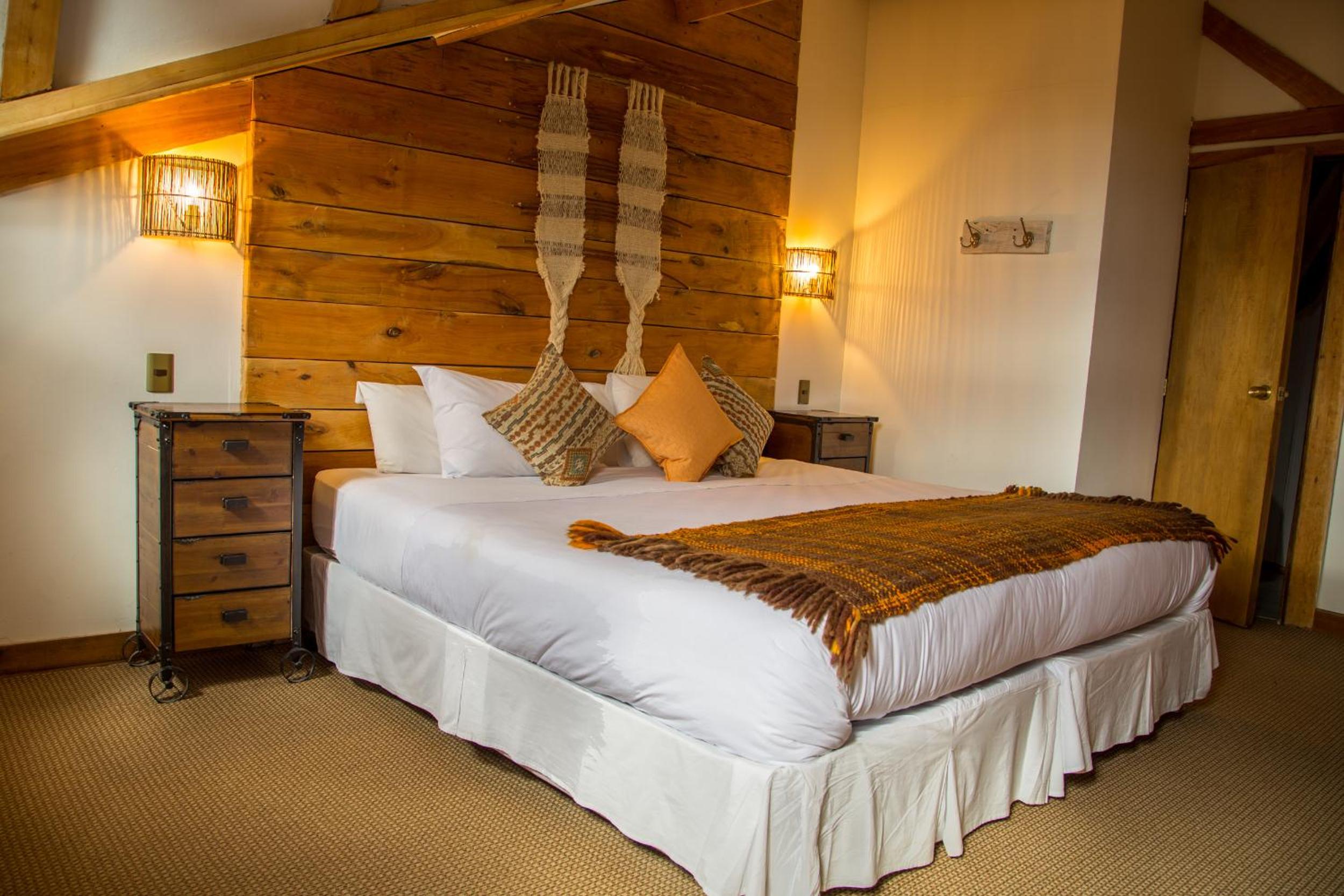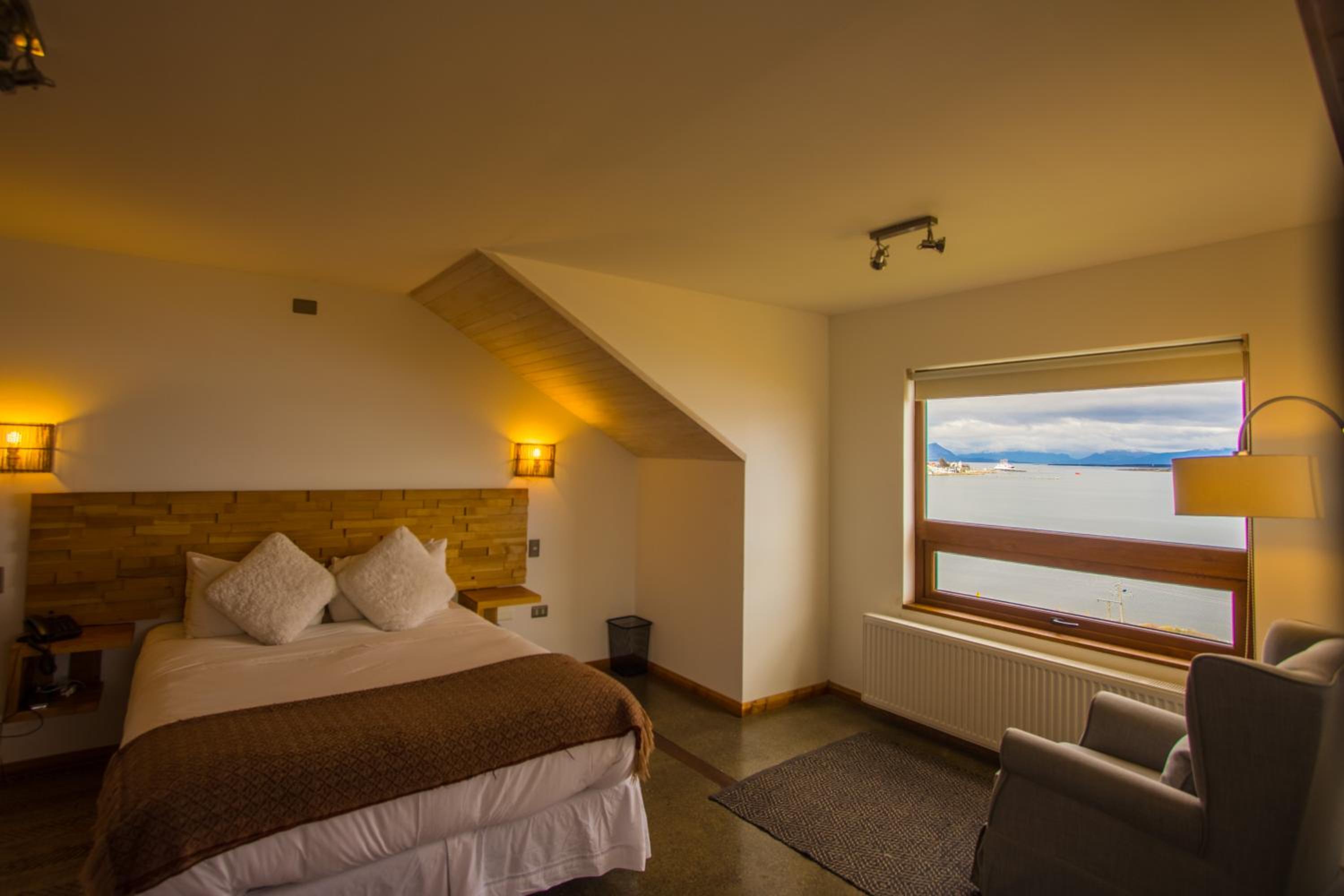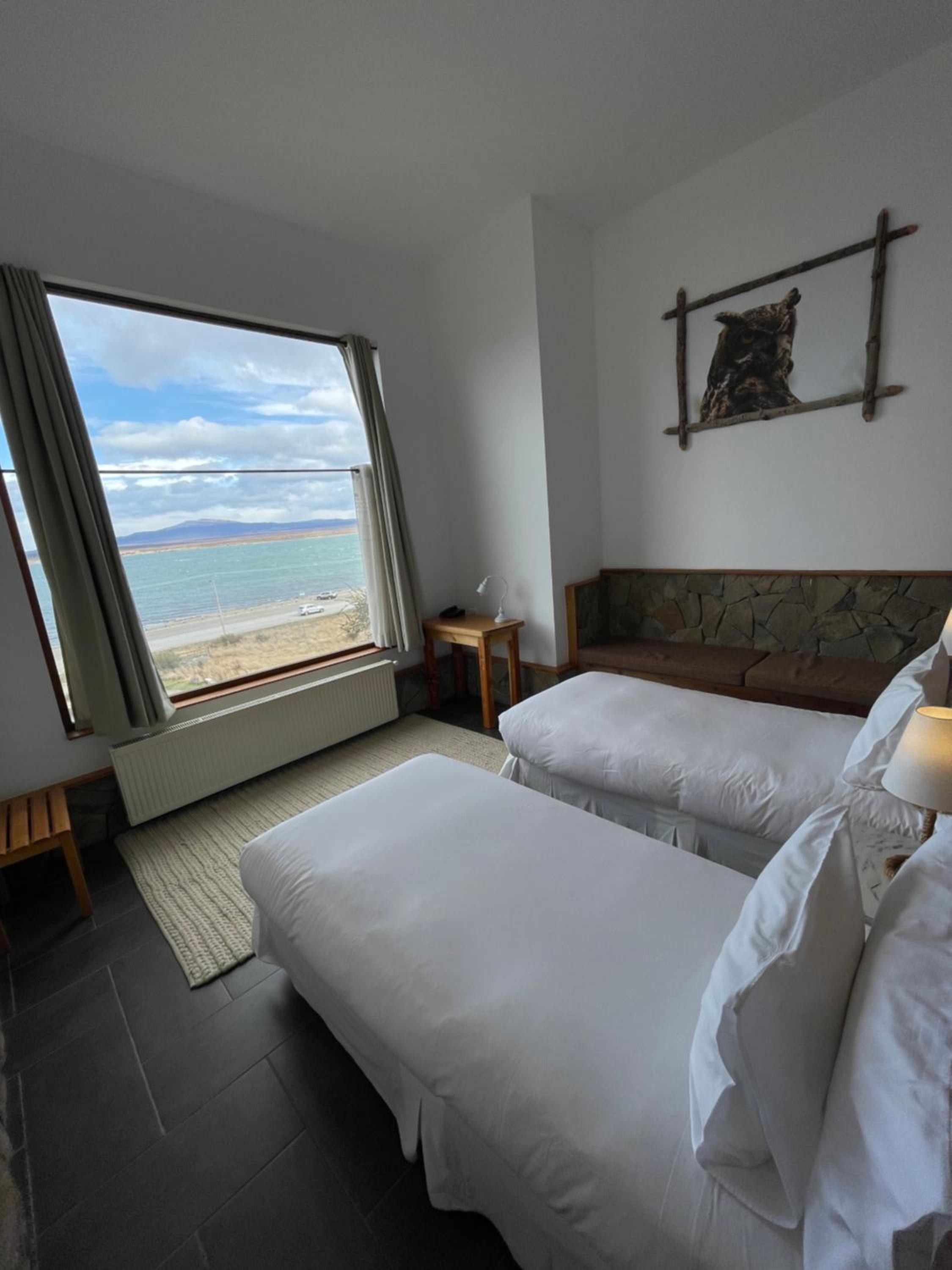 Nestled against a stunning Patagonian mountain backdrop, Weskar offers a cosy retreat with decked wooden walls and grey carpets in every room, providing a truly immersive mountain lodge experience.