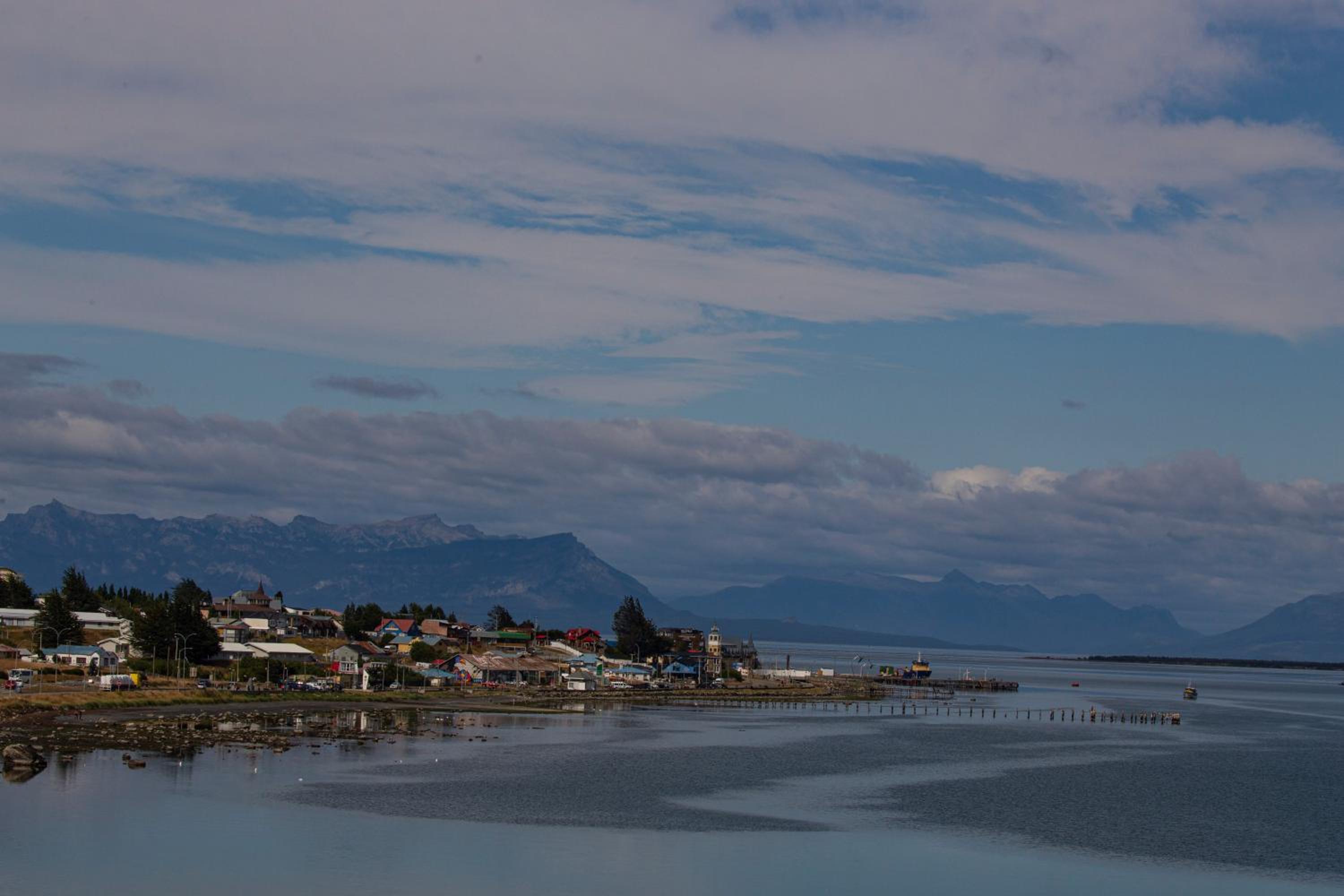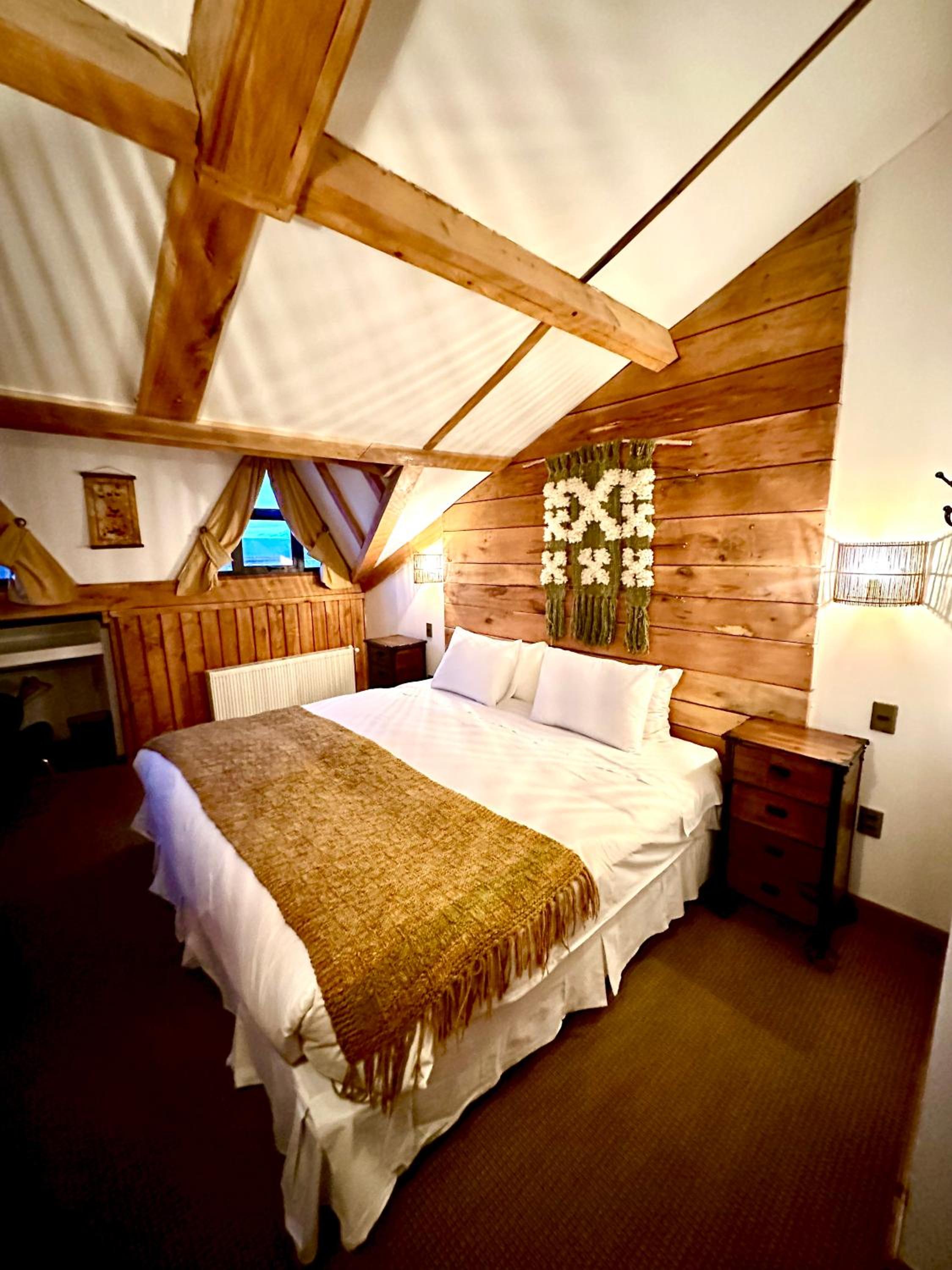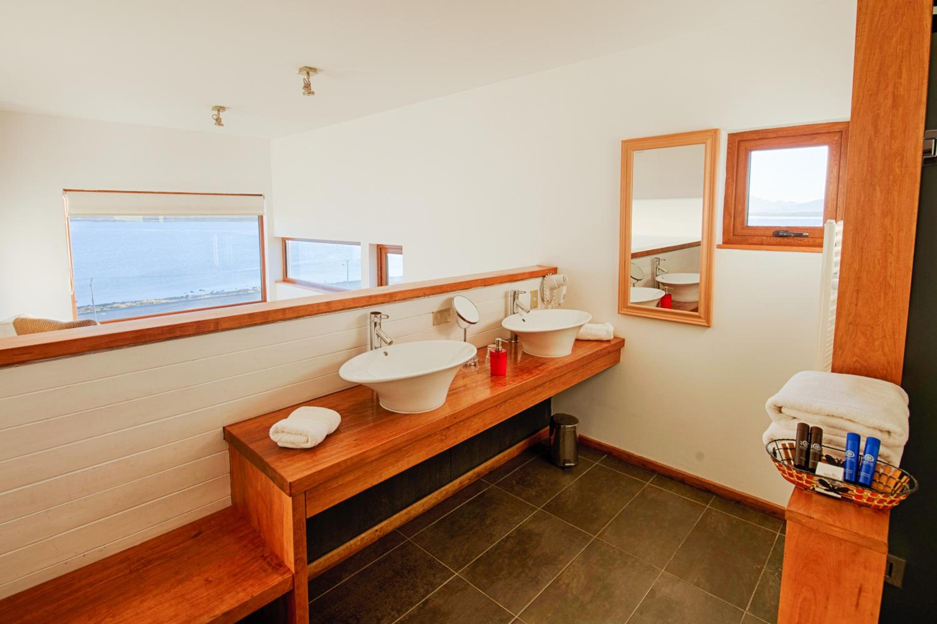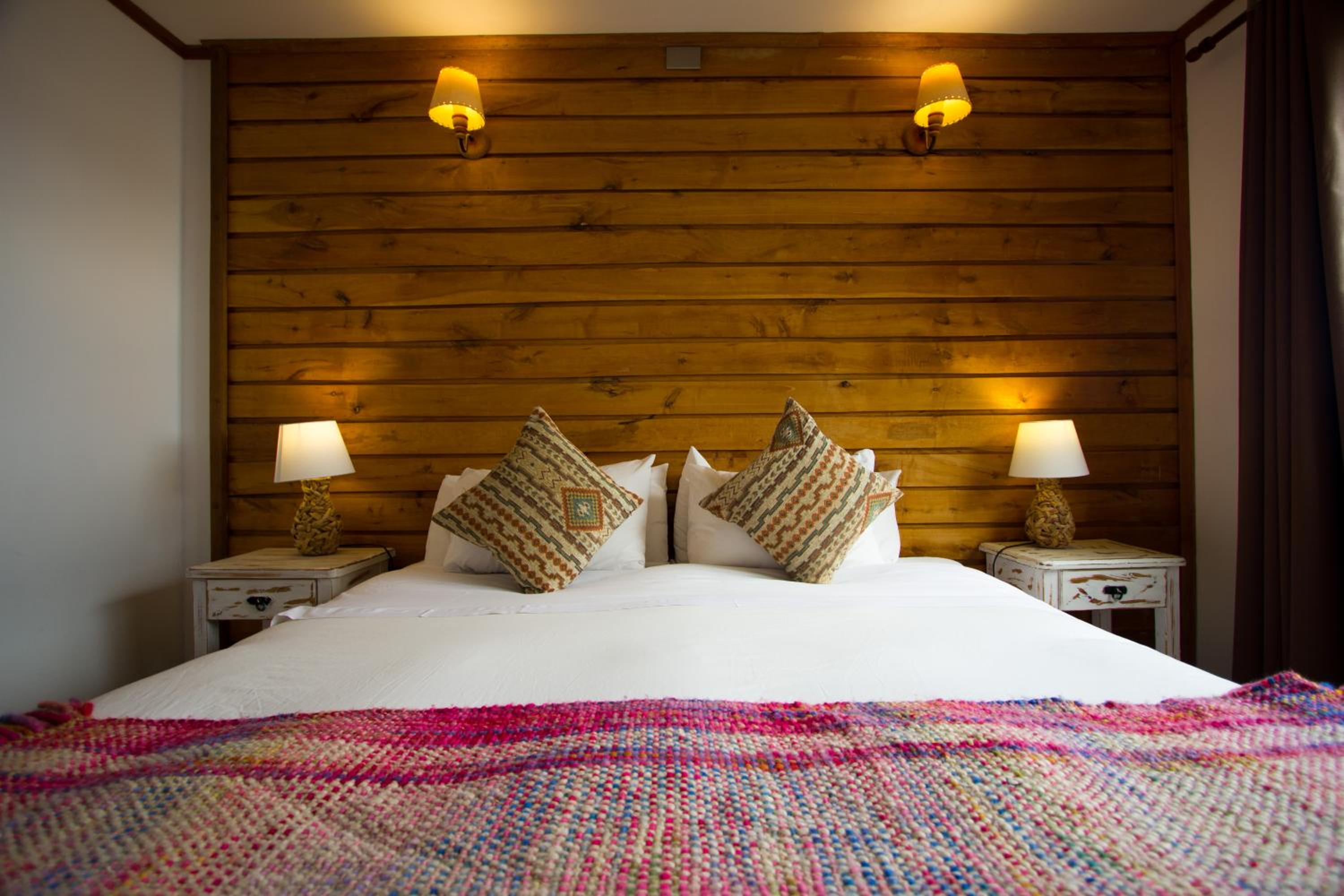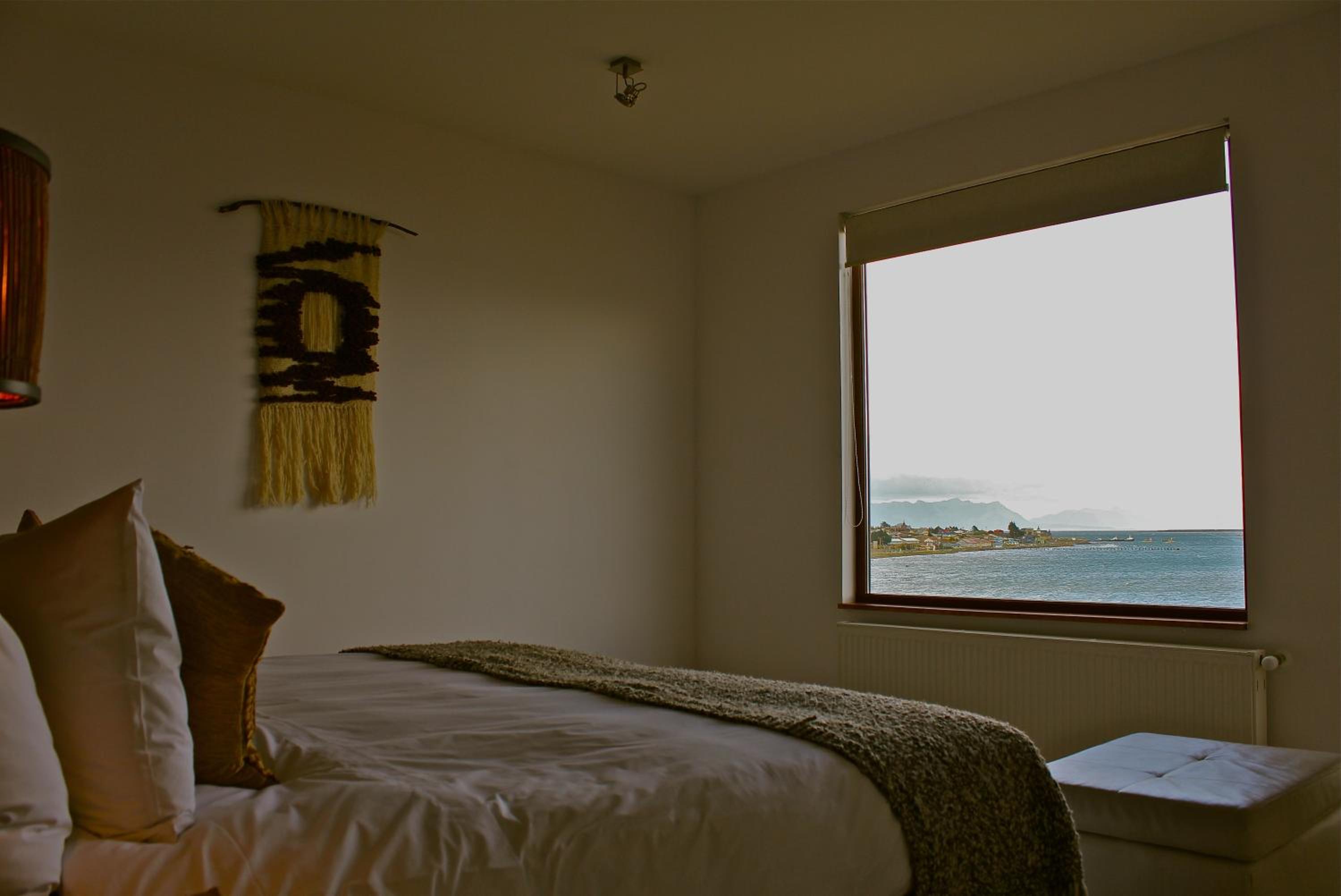 Nestled against a stunning Patagonian mountain backdrop, Weskar offers a cosy retreat with decked wooden walls and grey carpets in every room, providing a truly immersive mountain lodge experience.