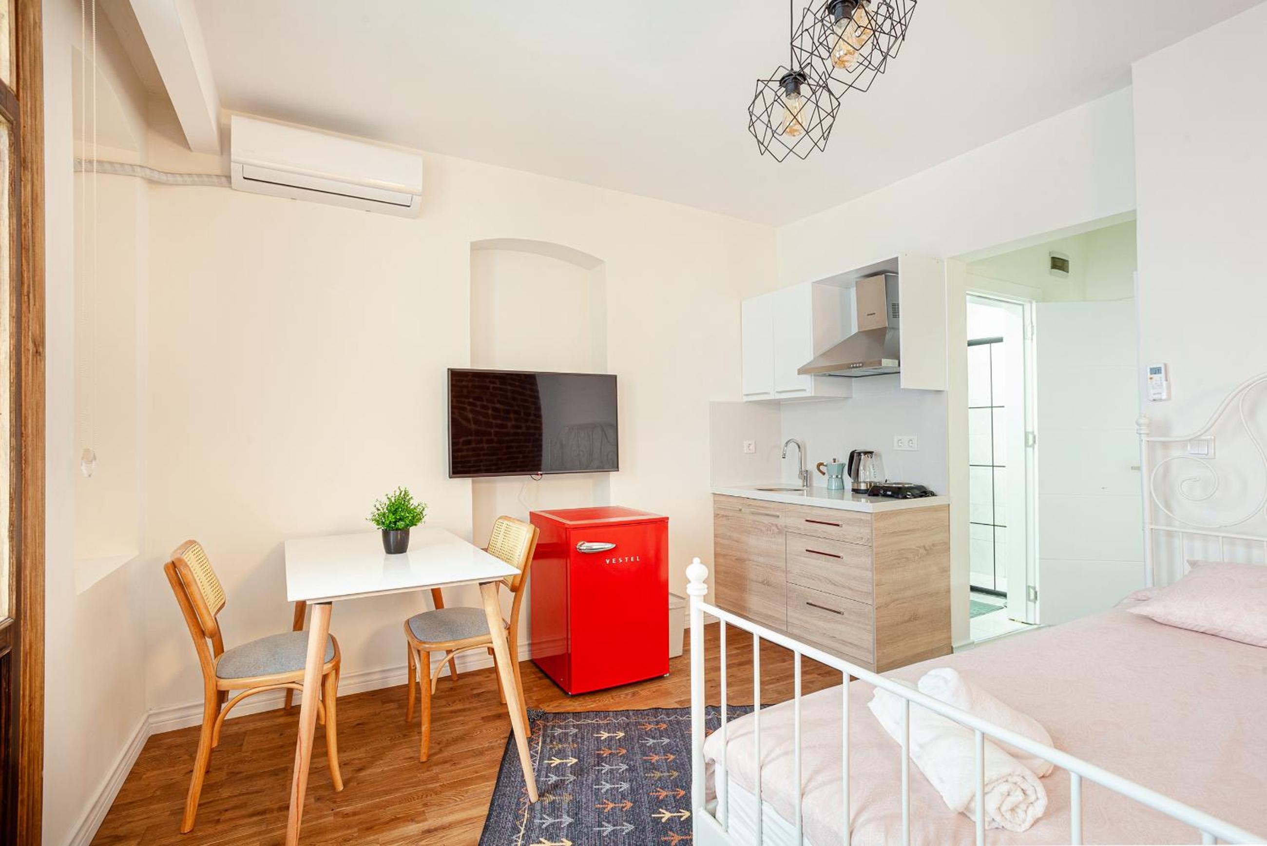 Well-Equipped Units: Enjoy the comforts of home with a kitchen featuring an oven, microwave, and fridge in each unit. The private entrance, air conditioning, and soundproofing ensure a relaxing stay.