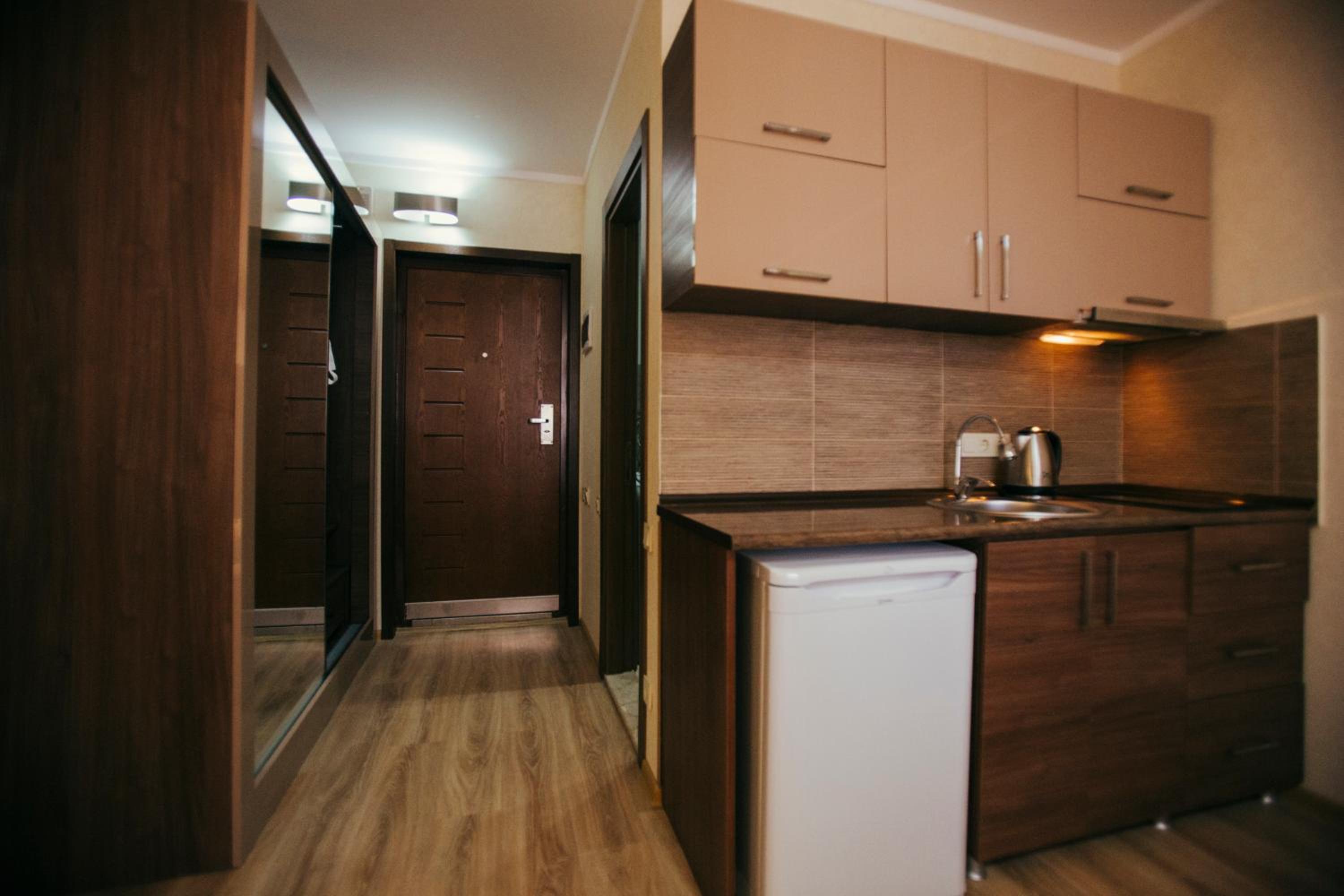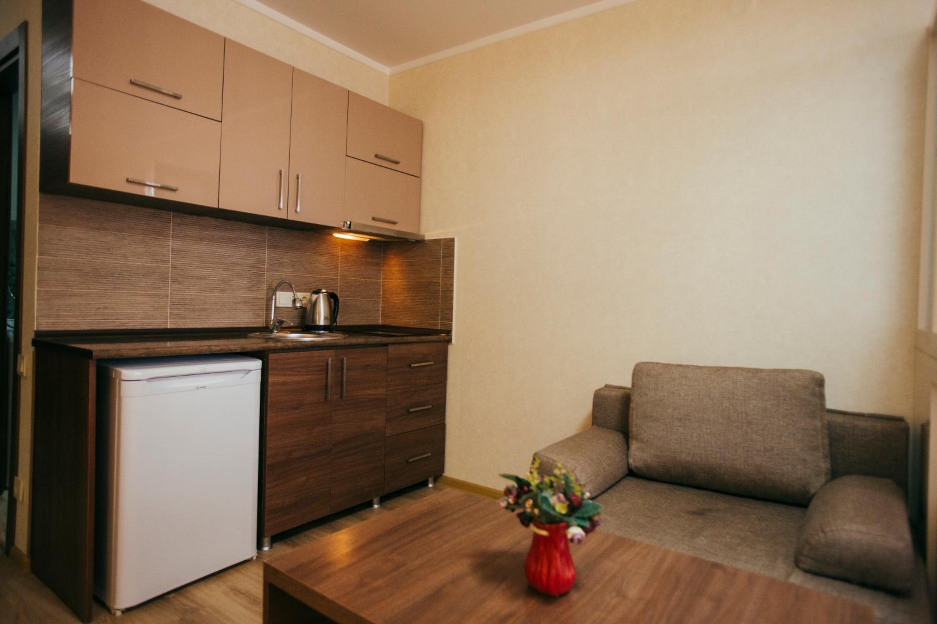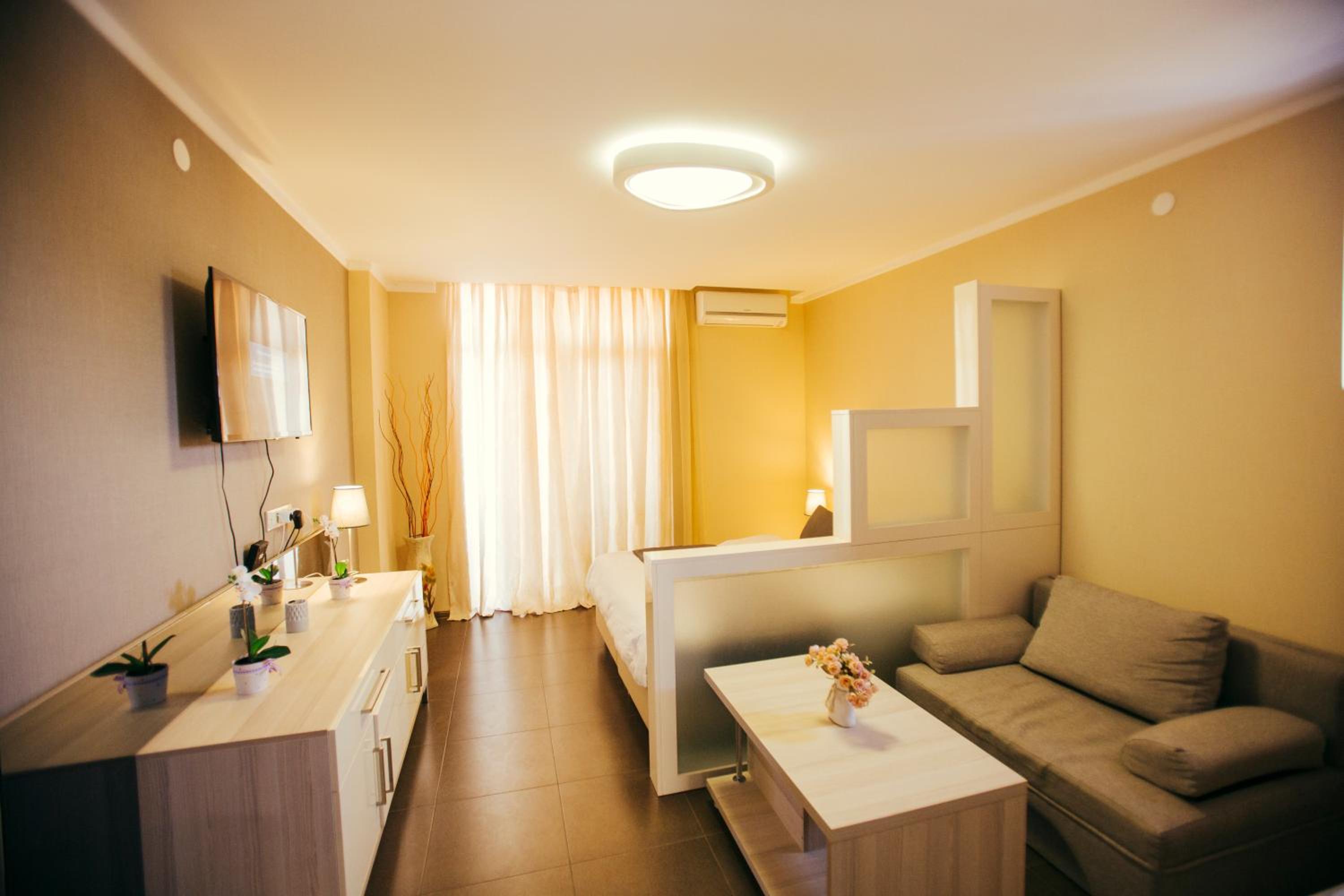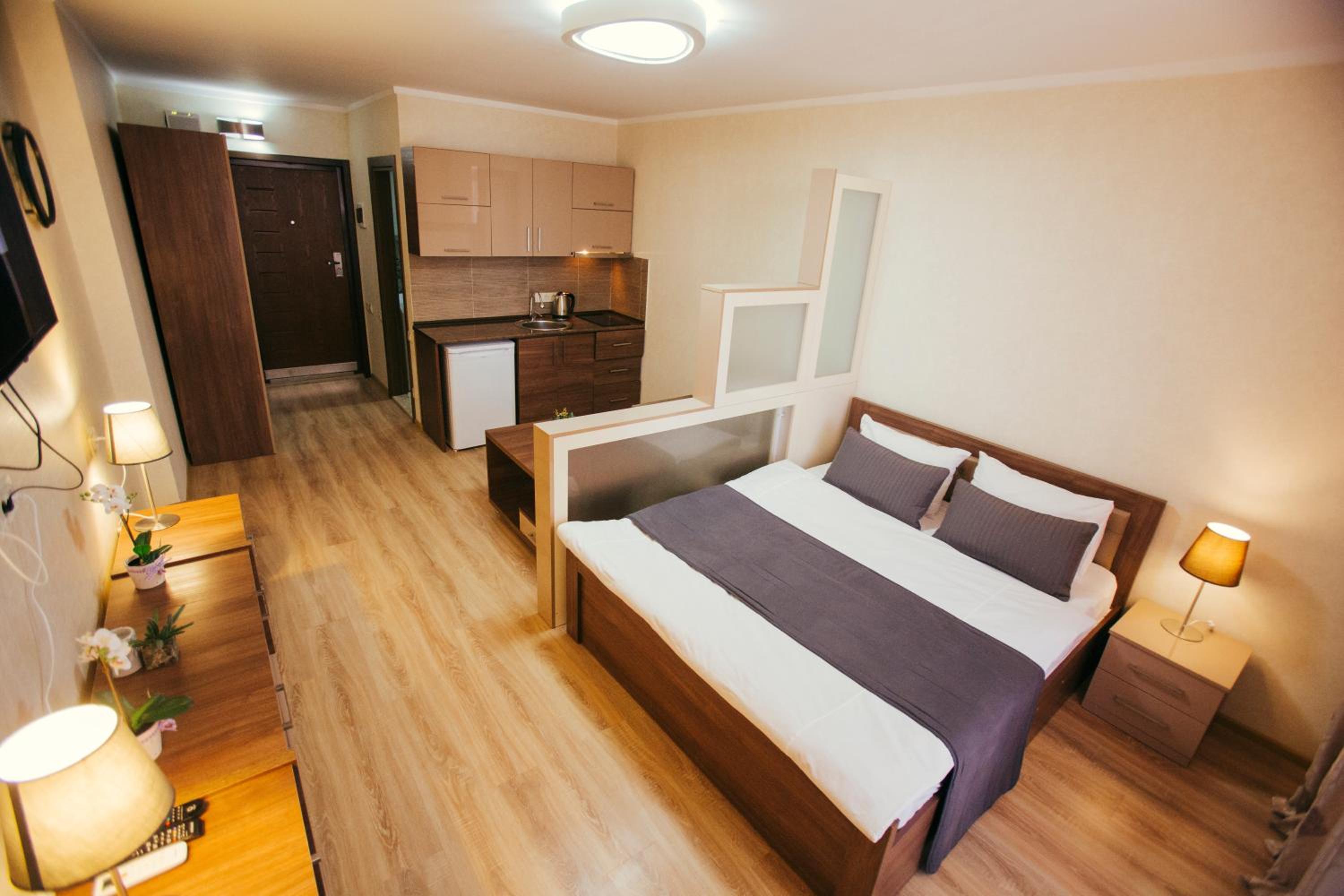 В номере есть wifi и вся необходимая бытовая техника и огромный прекрасный холодильник - в номере спокойно может расположиться семья из 4х человек, тк имеется отдельно в комнате двуспальная кровать и огромный диван хоть на 6 человек.