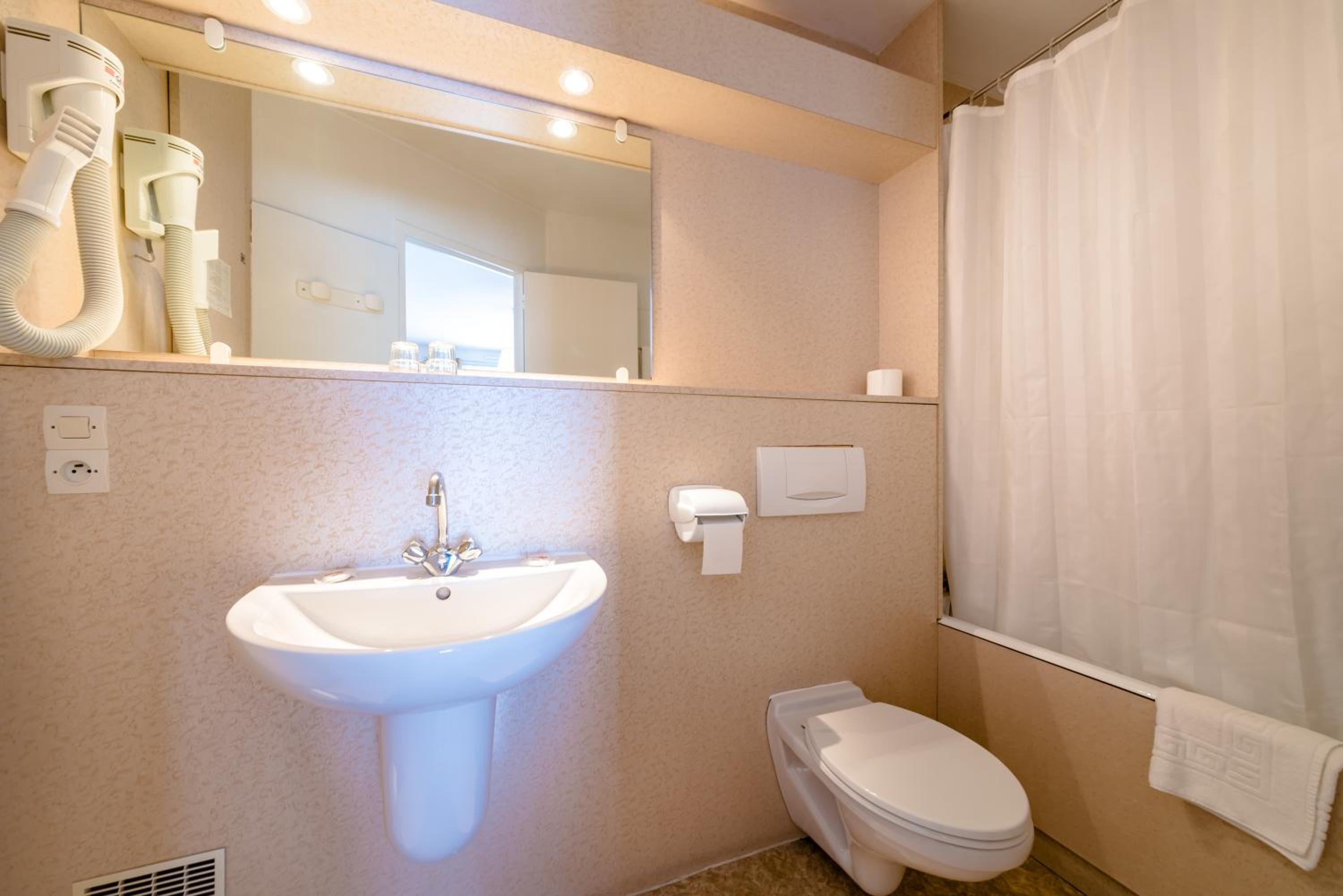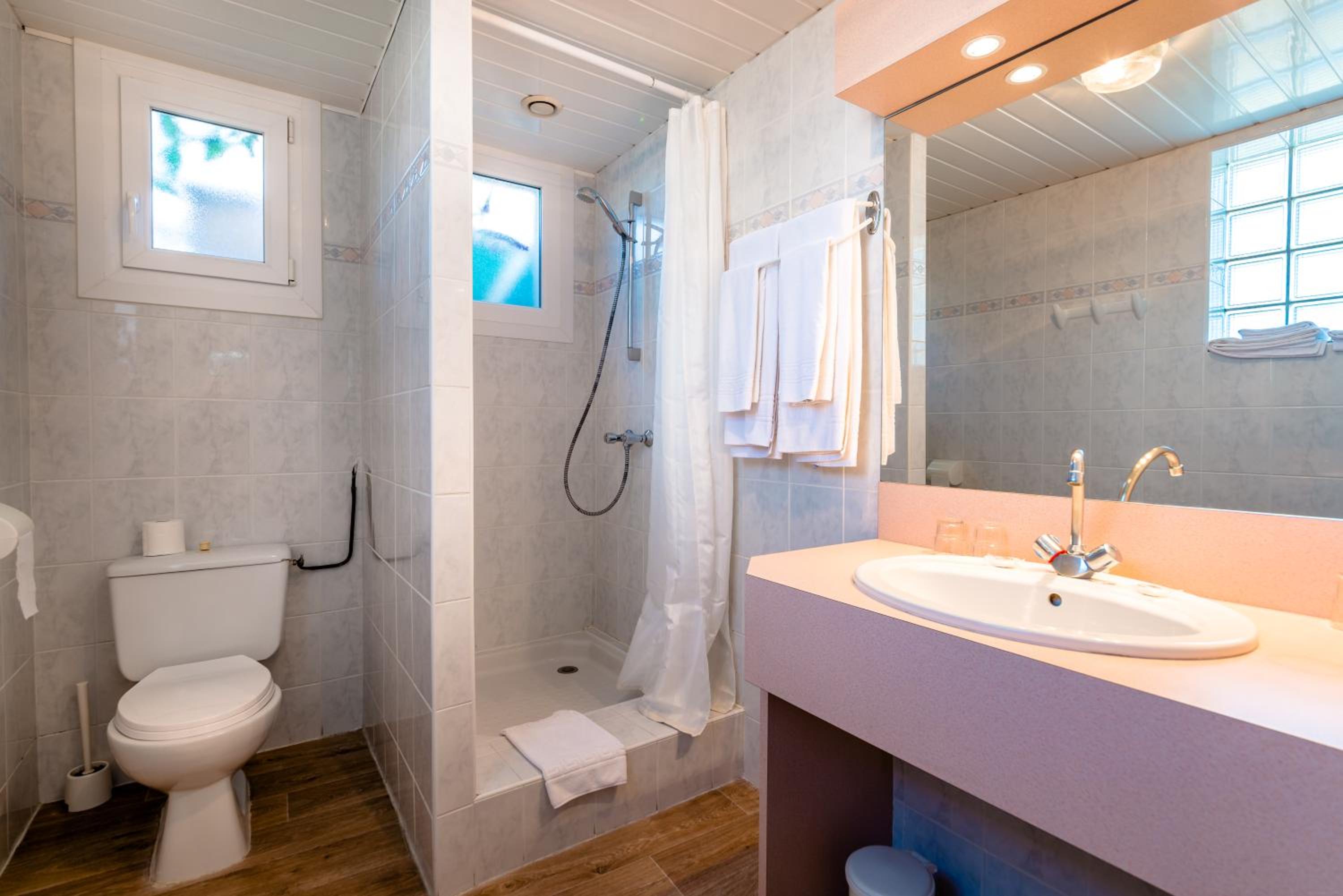 Petit déjeuner, douche à rideau peu pratique, toilettes collées au mur.