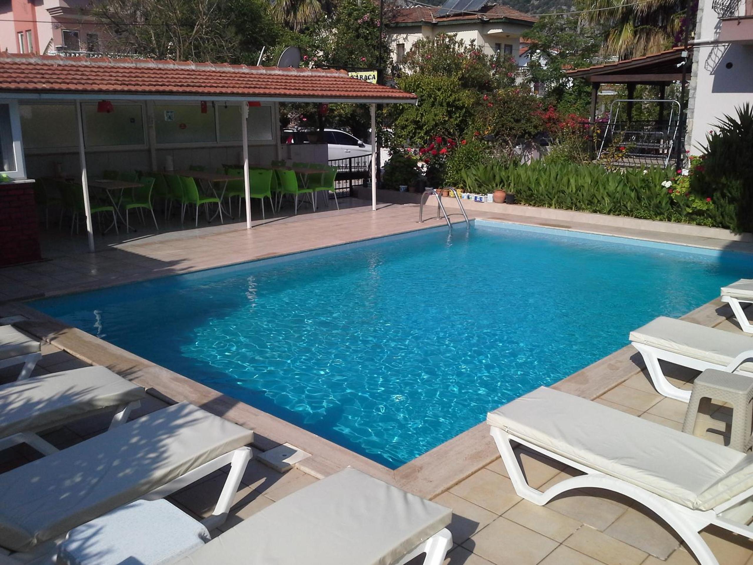 The Karaca Apart stands out with its vibrant building facade and temple-style columns, creating a visually appealing atmosphere. Guests can enjoy a refreshing dip in the outdoor pool surrounded by a terrace, perfect for relaxation and soaking up the sun.
