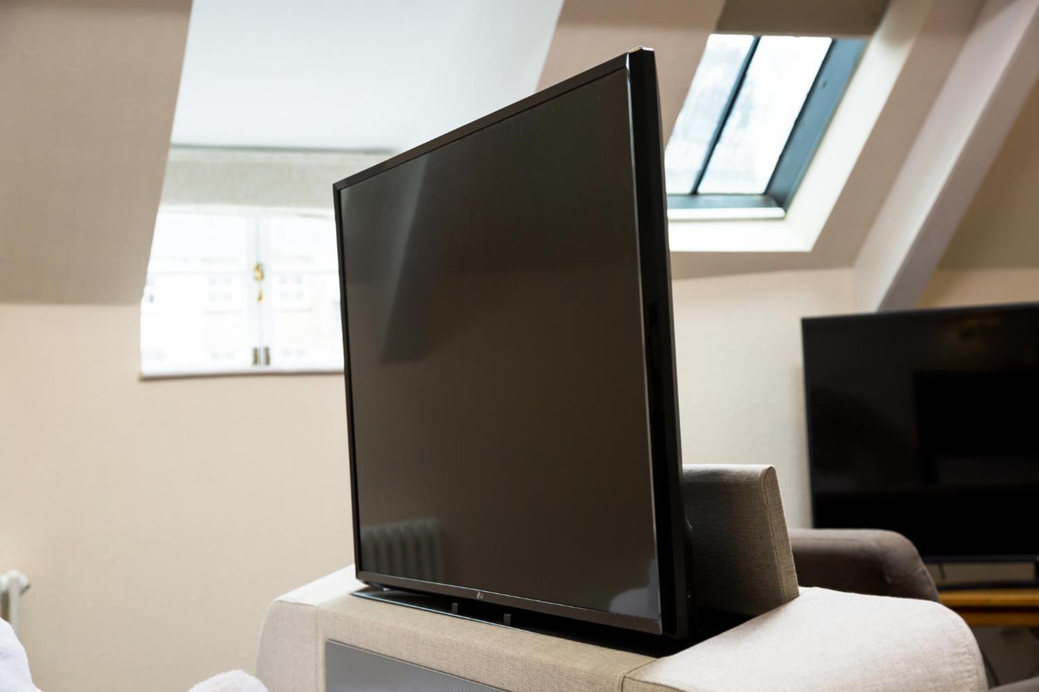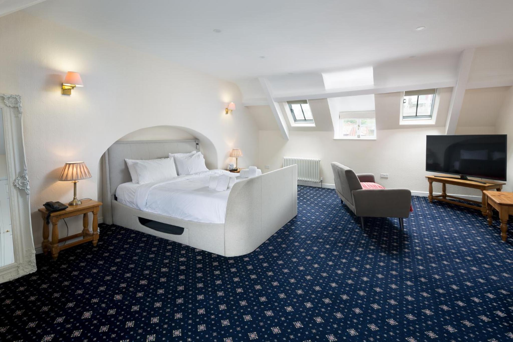 Massive room with corner bath and big TV bed